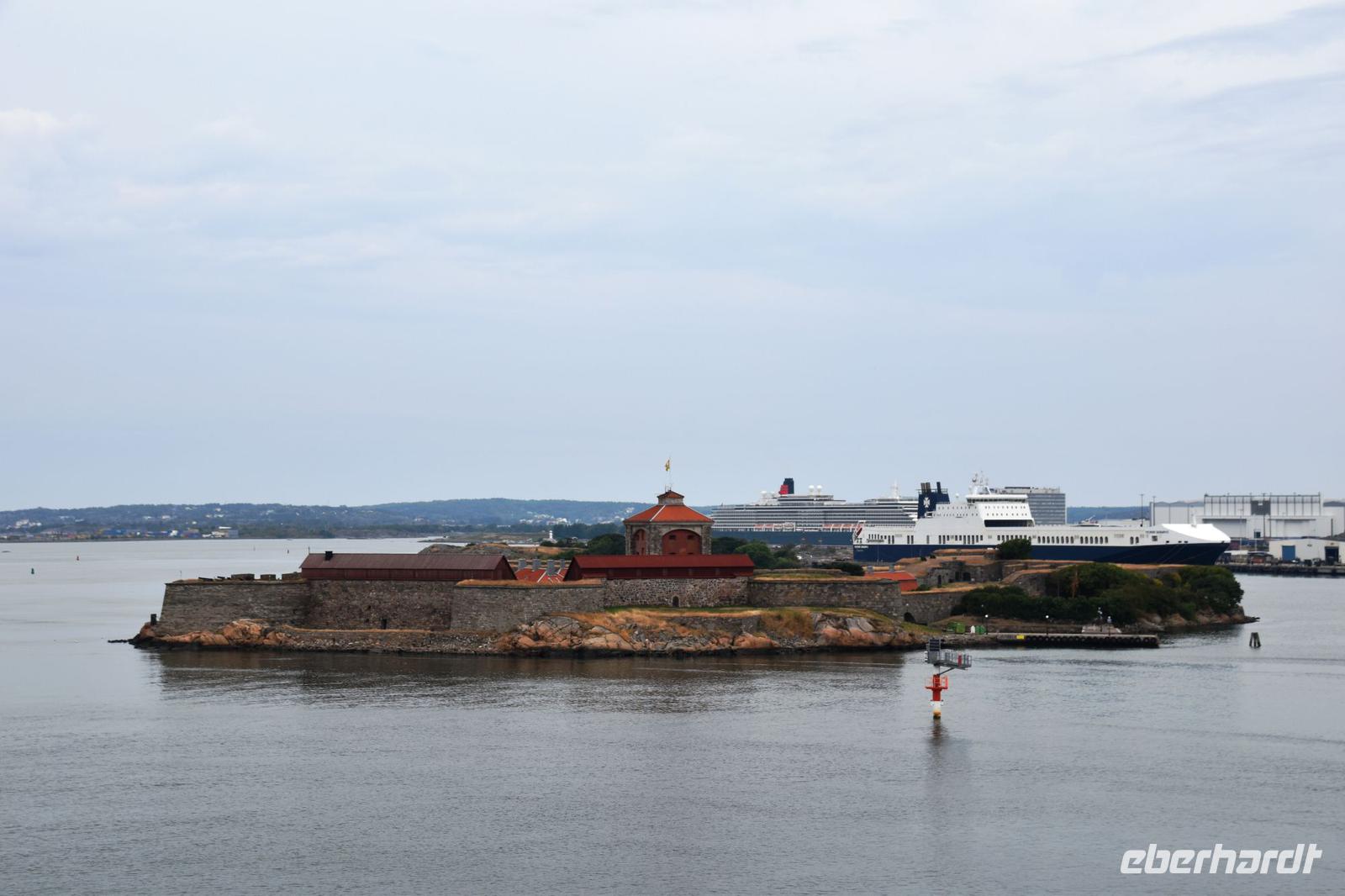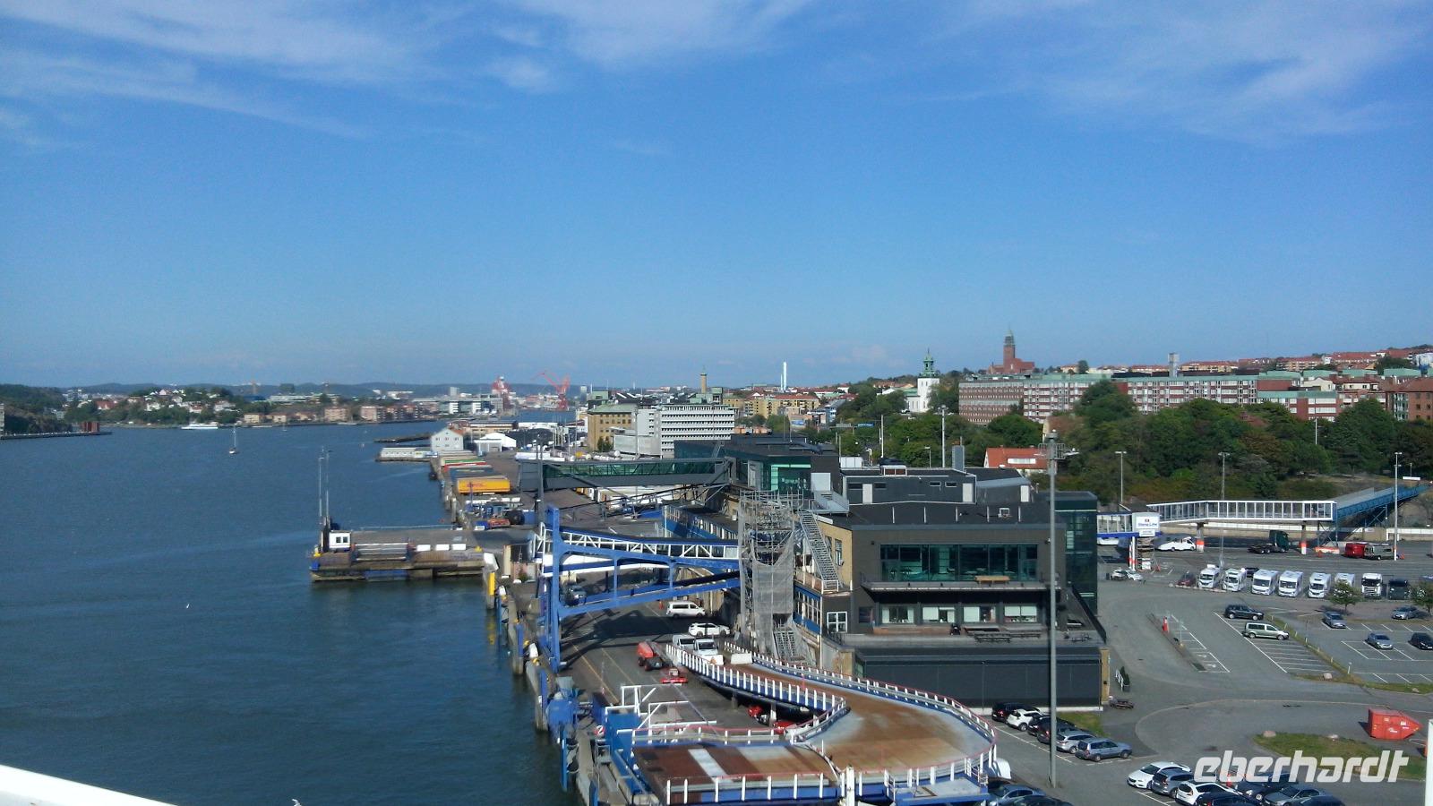 Die See war bei der Überfahrt spiegelglatt. Am Morgen hat es die Sonne noch etwas schwer durch den Wolkenschleier zu dringen, während wir durch die Schären vor Göteborg in das Mündungsdelta des Götaälv hineinfahren.