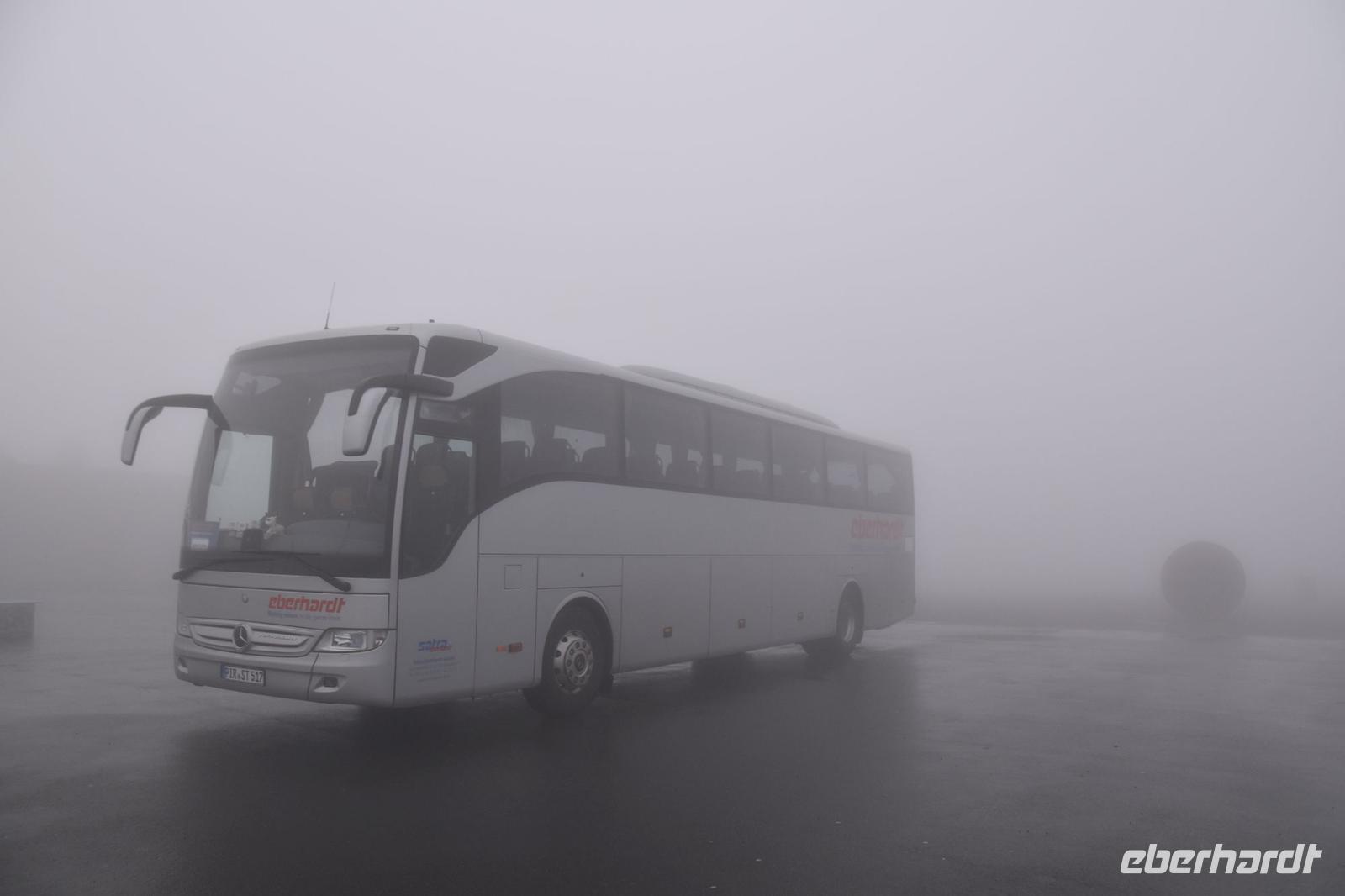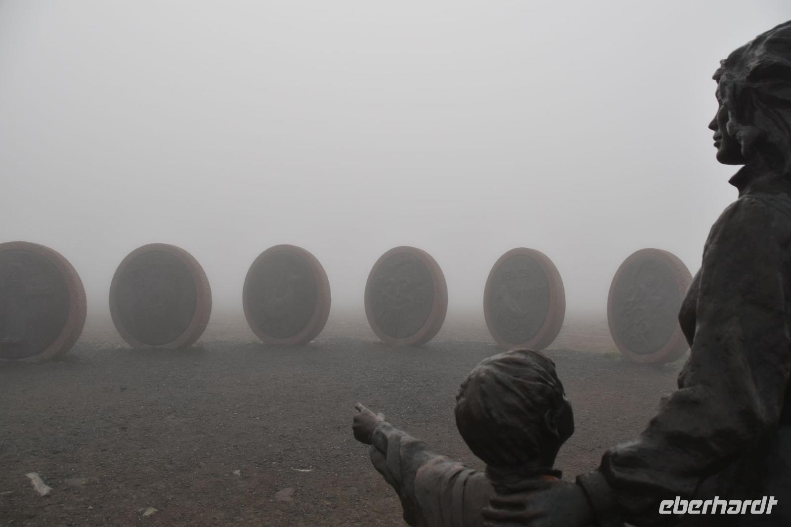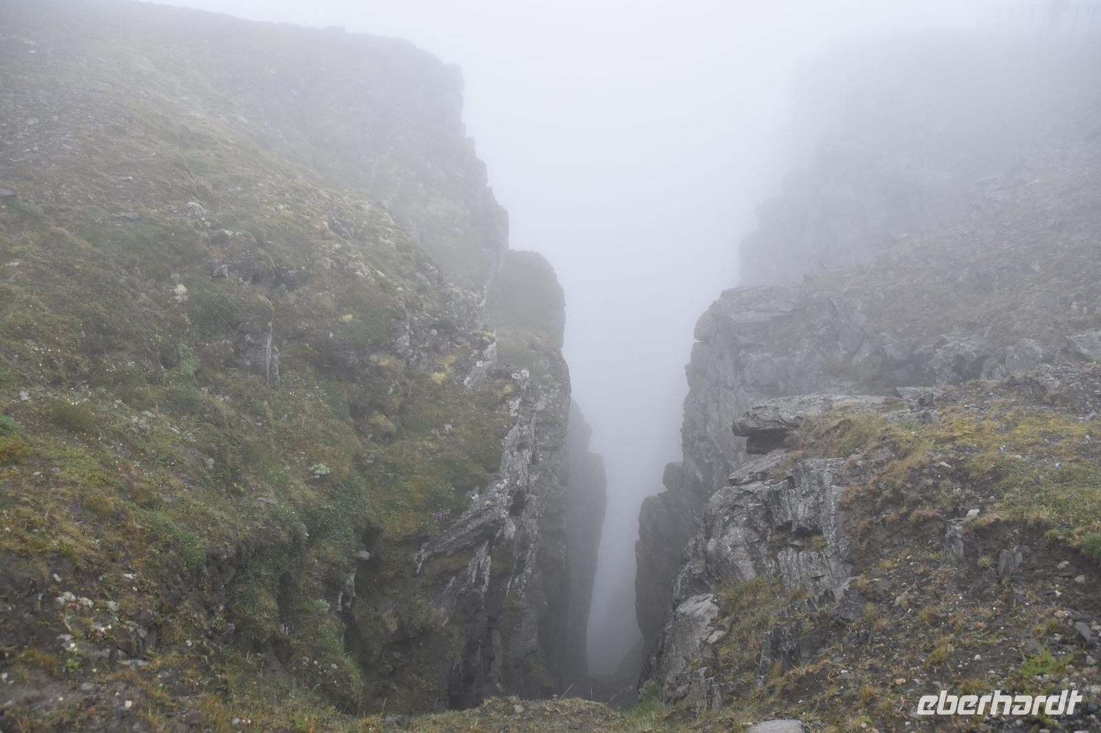 Um 21 Uhr und 15 Minuten als unser Bus jetzt mit dem Fahrer des Nordkapservice die Hochfläche der Insel erklimmt, taucht er gleichzeitig in dichten Nebel ein. Kein Ausblick mehr, fast keine Sicht beim Fahren. Am Nordkapcenter angekommen, geht deshalb jeder schnellstmöglich in das schützende Gebäude.