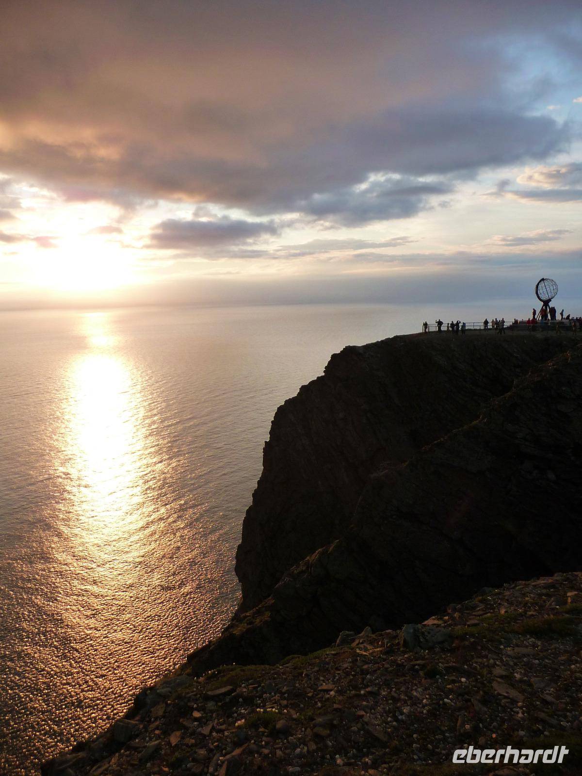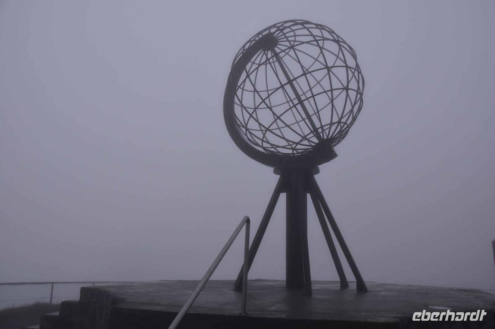 Mitternachtssonne am Nordkap - wir gehören zu den 80% der jährlichen Besucher, die dieses Erlebnis nicht haben. So fotografieren wir uns ungewöhnlich einsam an der Weltkugel - und sehen ringsherum nur dichte weiße Wolken.
