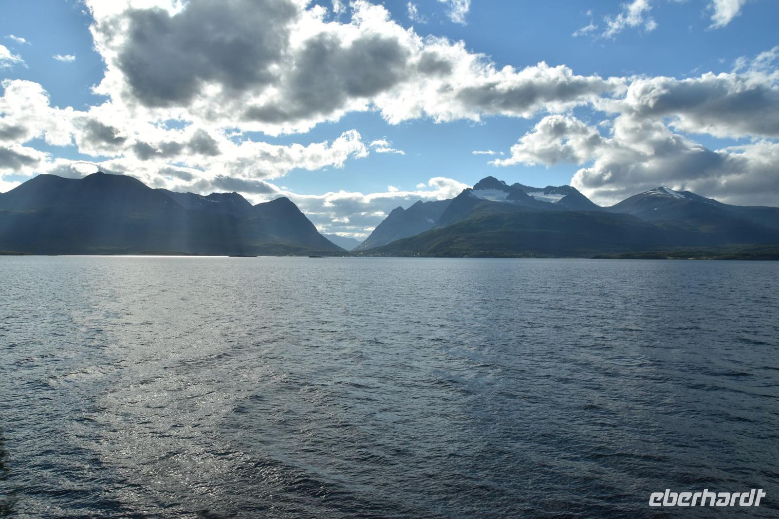 Die wechselnden Formen und Farben der Berge, der Fjelle und der Fjorde, die wilden Bergflüsse und die stillen Meeresbuchten - die phantastischen Felszeichnungen bei Alta, kaum zu glaubende 6000 und 4000 Jahre alt, dann weiter die entlang der Fjordlandschaften Norlands bis schließlich die schneebedeckten Lynger-Alpen steil über dem Lyngerfjord aufragen und deren Gletscher in der Sonne glänzen - eine traumhaft schöne Fahrt.