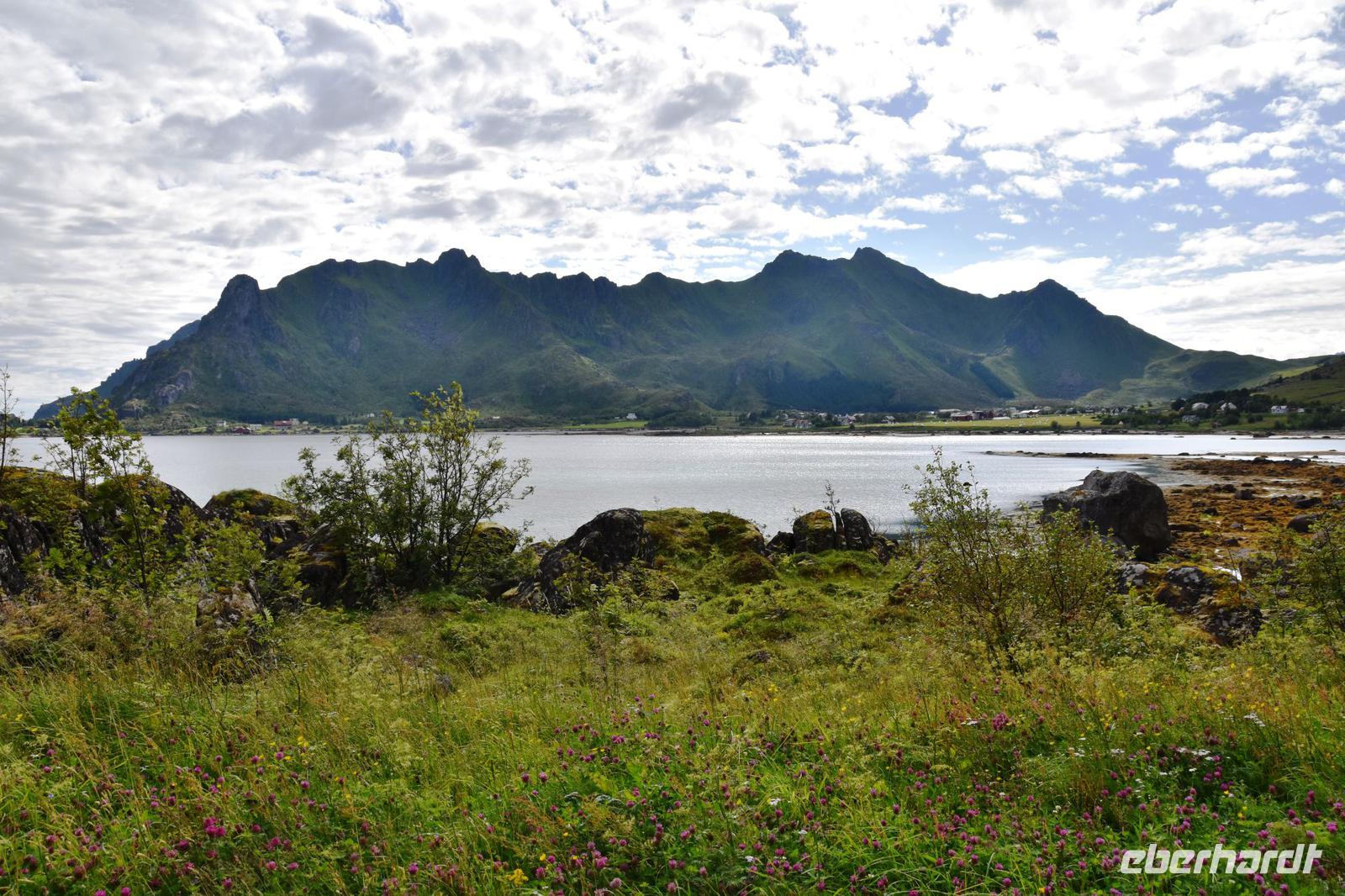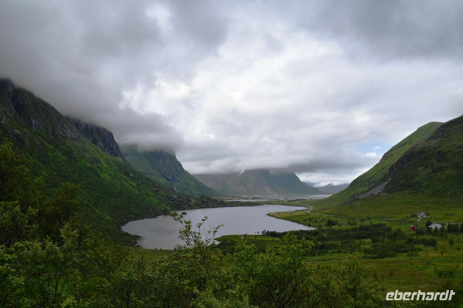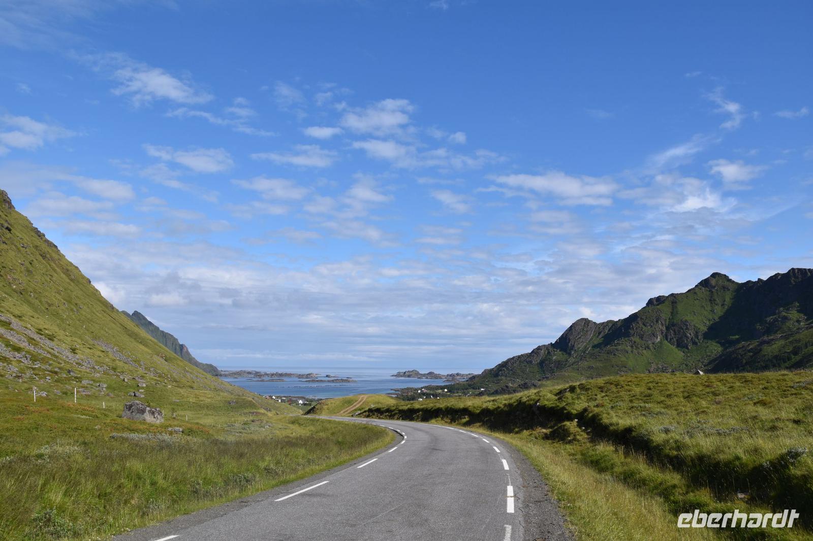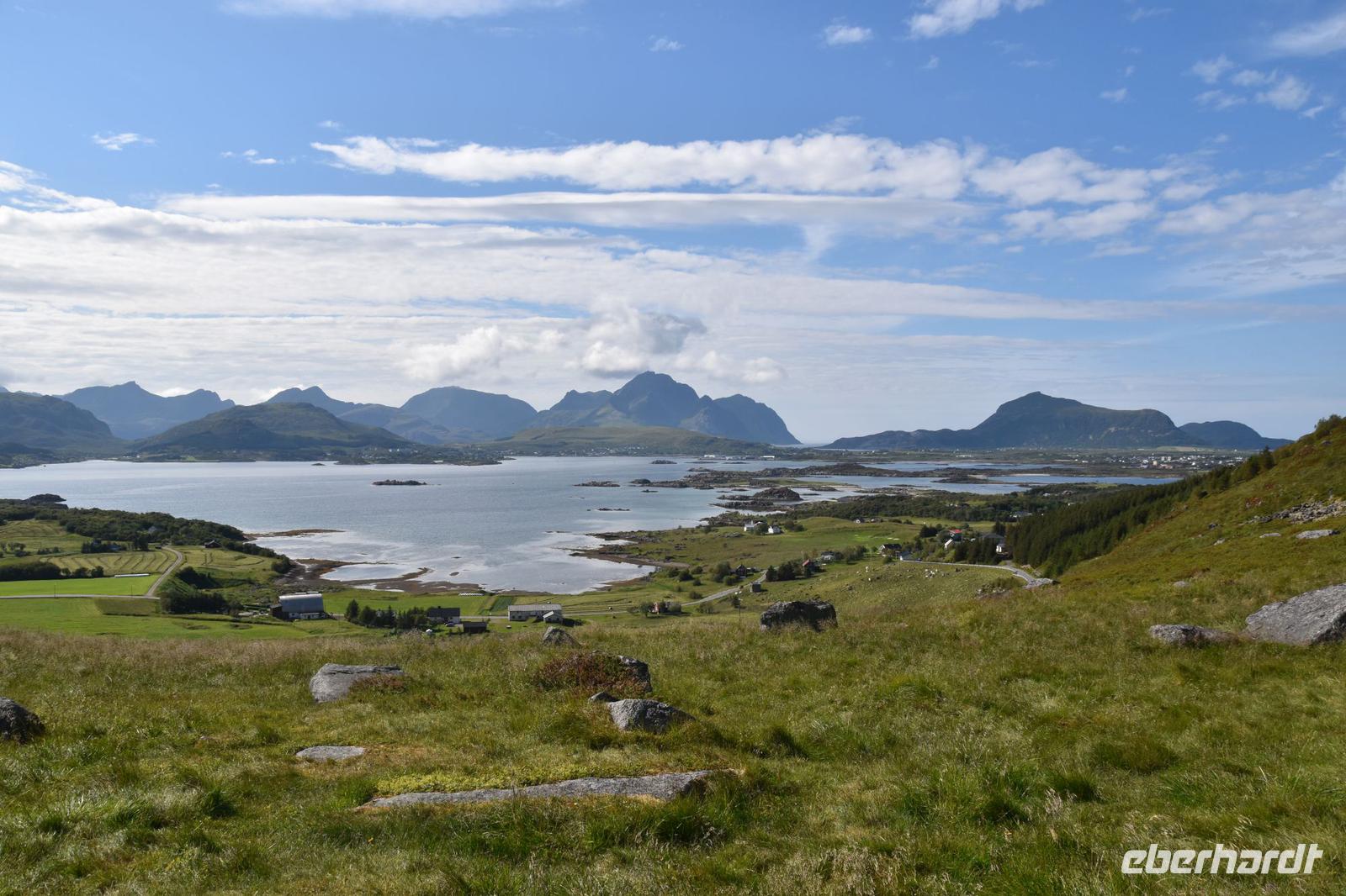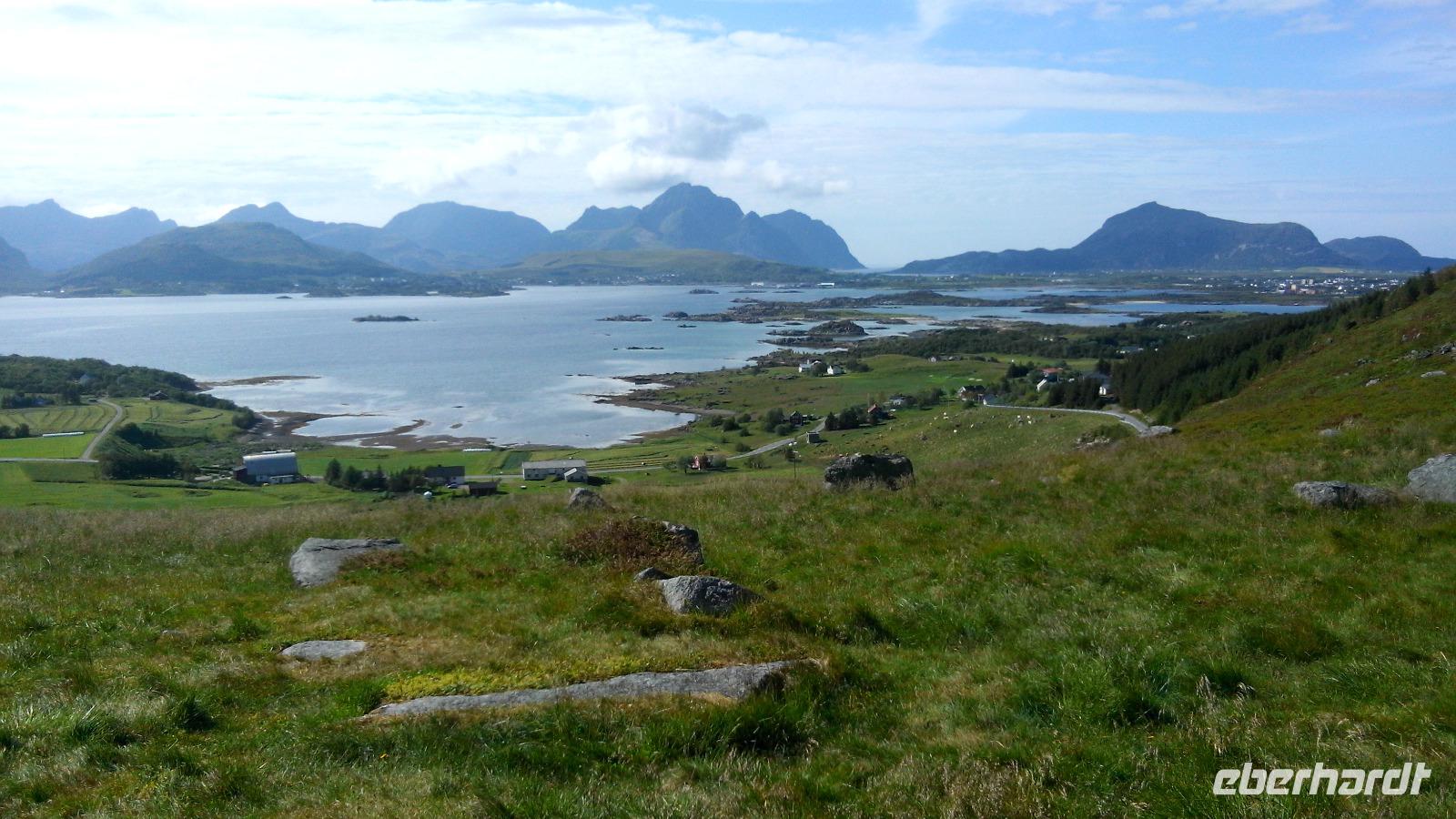 Die Weiterfahrt bringt uns zur Aussicht Torvdalshalsen, nach Leknes zum Einkaufscenter und über den Sennesviksveien und den Pass von Einangen zurück nach Mortsund.