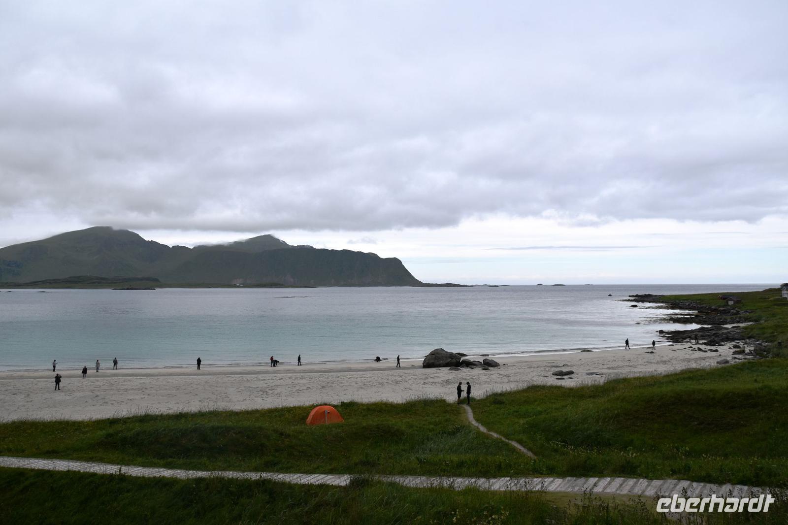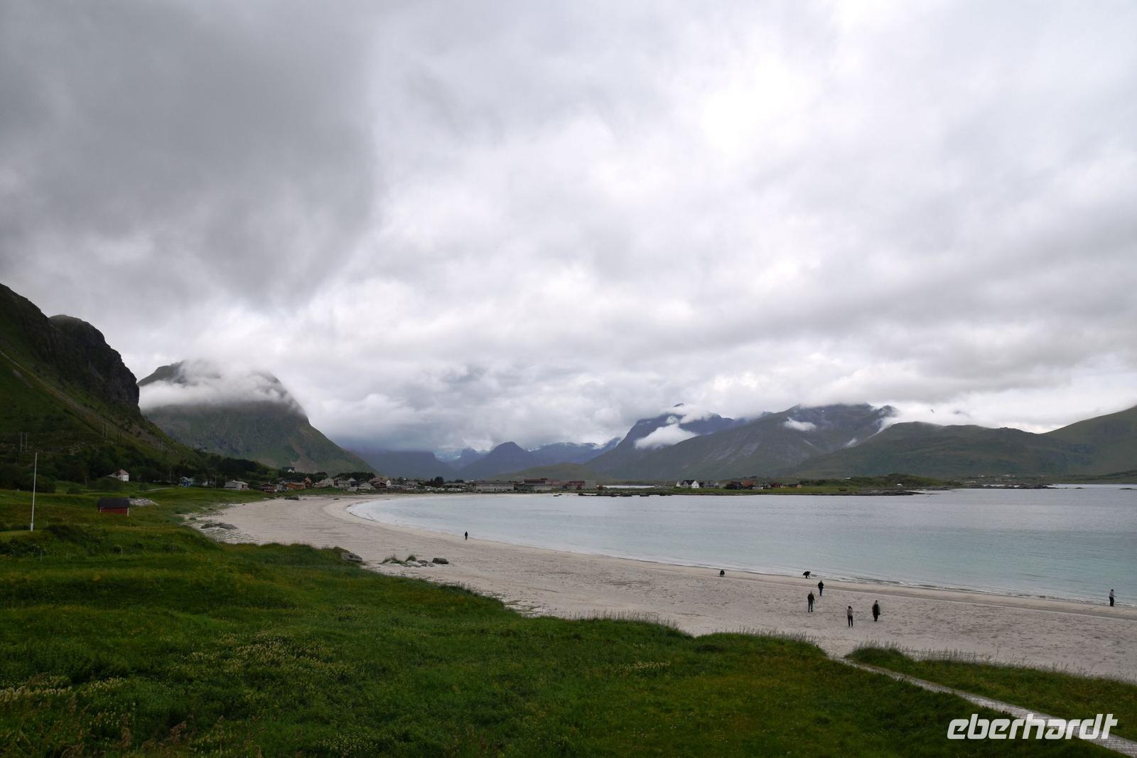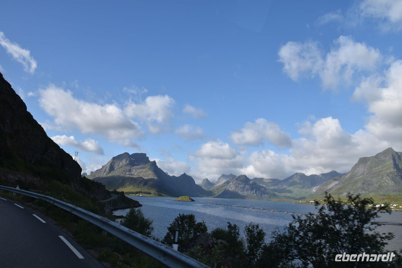Wir lassen den neuen Tag mal etwas geruhsamer angehen: Zuerst einmal ausschlafen, dann ein gutes Frühstück und schließlich der Beginn der Lofotenrundfahrt. Die Sonne verwöhnt uns wieder, auch wenn die Wolken noch etwas auf den Berggipfeln hängen. Wir machen Fotostopps in den Bergen, an der Kirche in Flakstad und weißen am Muschelstrand in Ramberg.