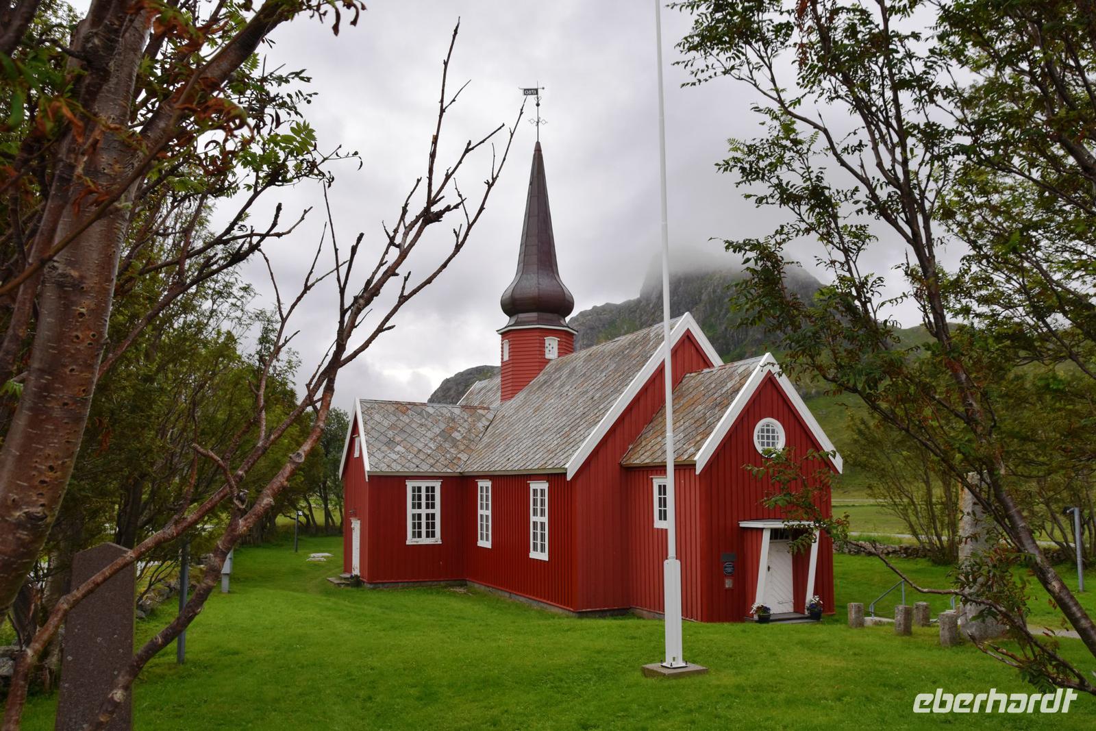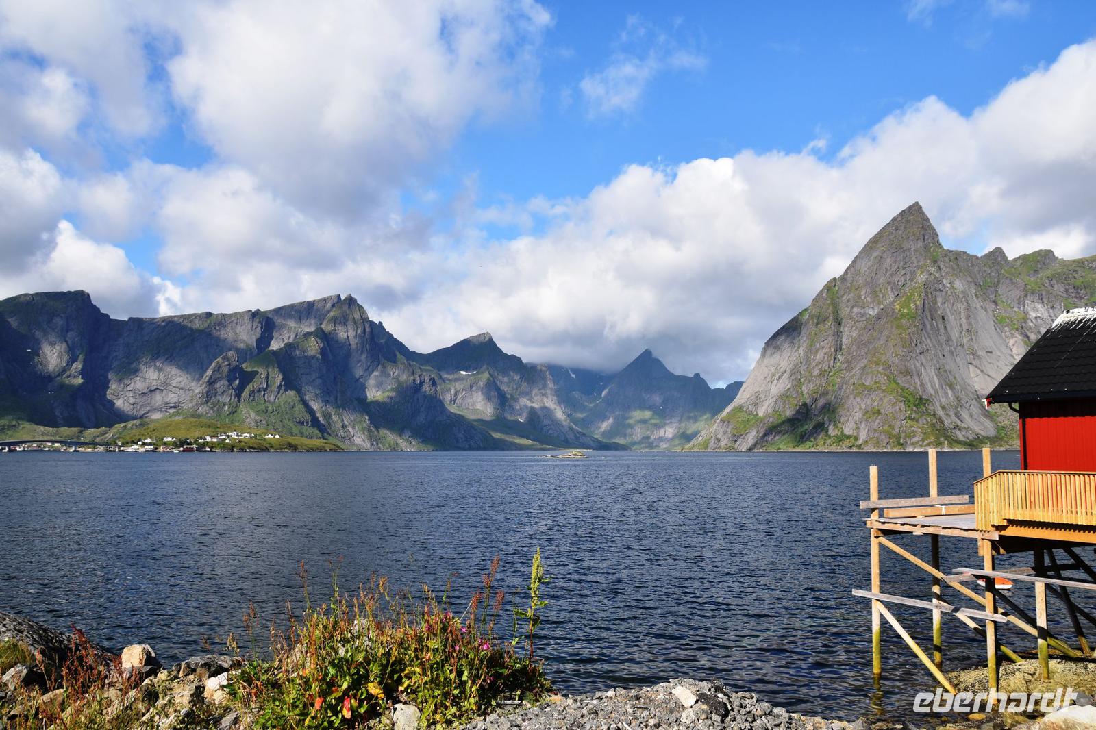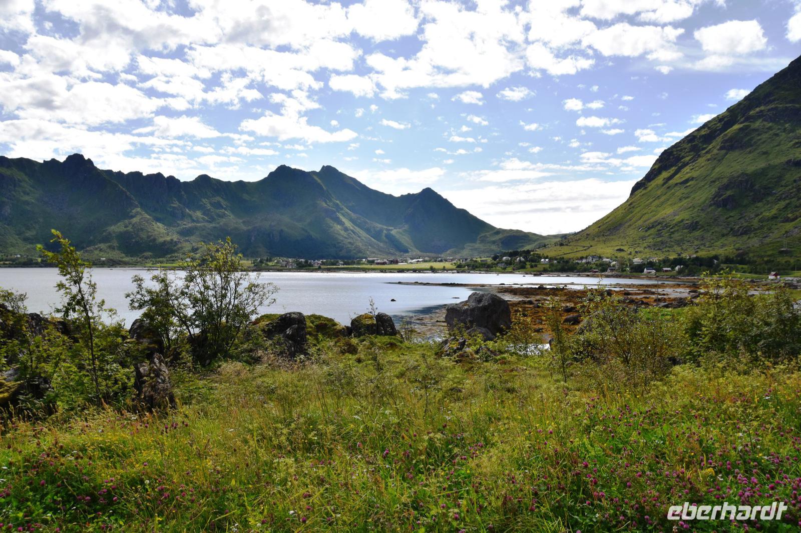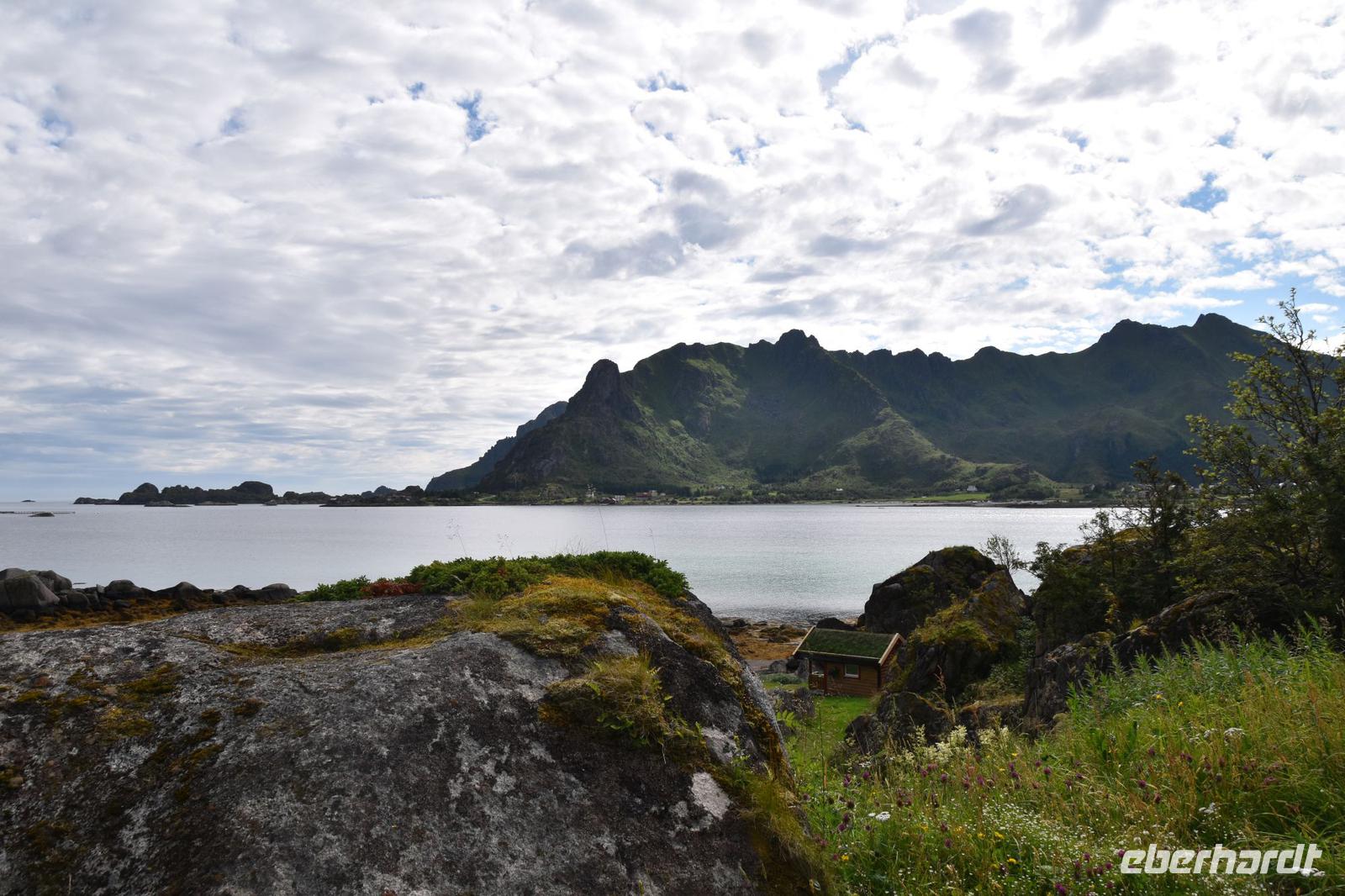 Wir lassen den neuen Tag mal etwas geruhsamer angehen: Zuerst einmal ausschlafen, dann ein gutes Frühstück und schließlich der Beginn der Lofotenrundfahrt. Die Sonne verwöhnt uns wieder, auch wenn die Wolken noch etwas auf den Berggipfeln hängen. Wir machen Fotostopps in den Bergen, an der Kirche in Flakstad und weißen am Muschelstrand in Ramberg.