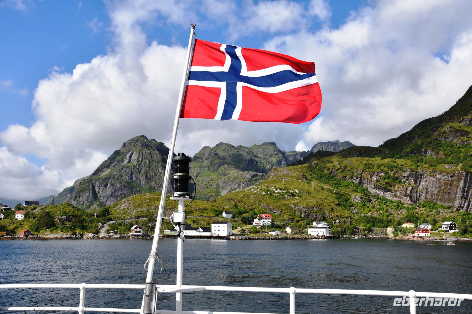 Am Morgen wieder Sonnenschein und die beeindruckende Sicht auf die grandiose Bergwelt ist frei. Wir fahren am Balsfjord vorbei, weiter durch die Berge und über die Fjelle von Troms, gegenüber von Narvik am Ofotfjord entlang und dann über die 1007 m lange Tjeldsundbrücke auf die Inselgruppe der Vesteralen, erreichen Stockmarknes - mit dem Hurtigrutenmuseum und guter Sicht auf die Gipfelwelt der Vesteralen und der Lofoten. Unser Hurtigrutenschiff ist eines der modernen Flotte und trägt den Namen des Gründers dieser Postschiffrouten, die M/S „Richard With" Sie steuert gerade den Hafen an, als wir ankommen. Damit können wir ihre Ankunft noch schön auf unseren Foto- und Filmgeräten festhalten. Der nächste Höhepunkt der Reise steht bevor - die schöne Fahrt durch den Raftsund, hinein in den engen Trollfjord und dann weiter durch die Inselwelt der Lofoten bis Svolvær - herrlicher Sonnenschein jetzt und die Fahrt einfach unbeschreiblich schön.