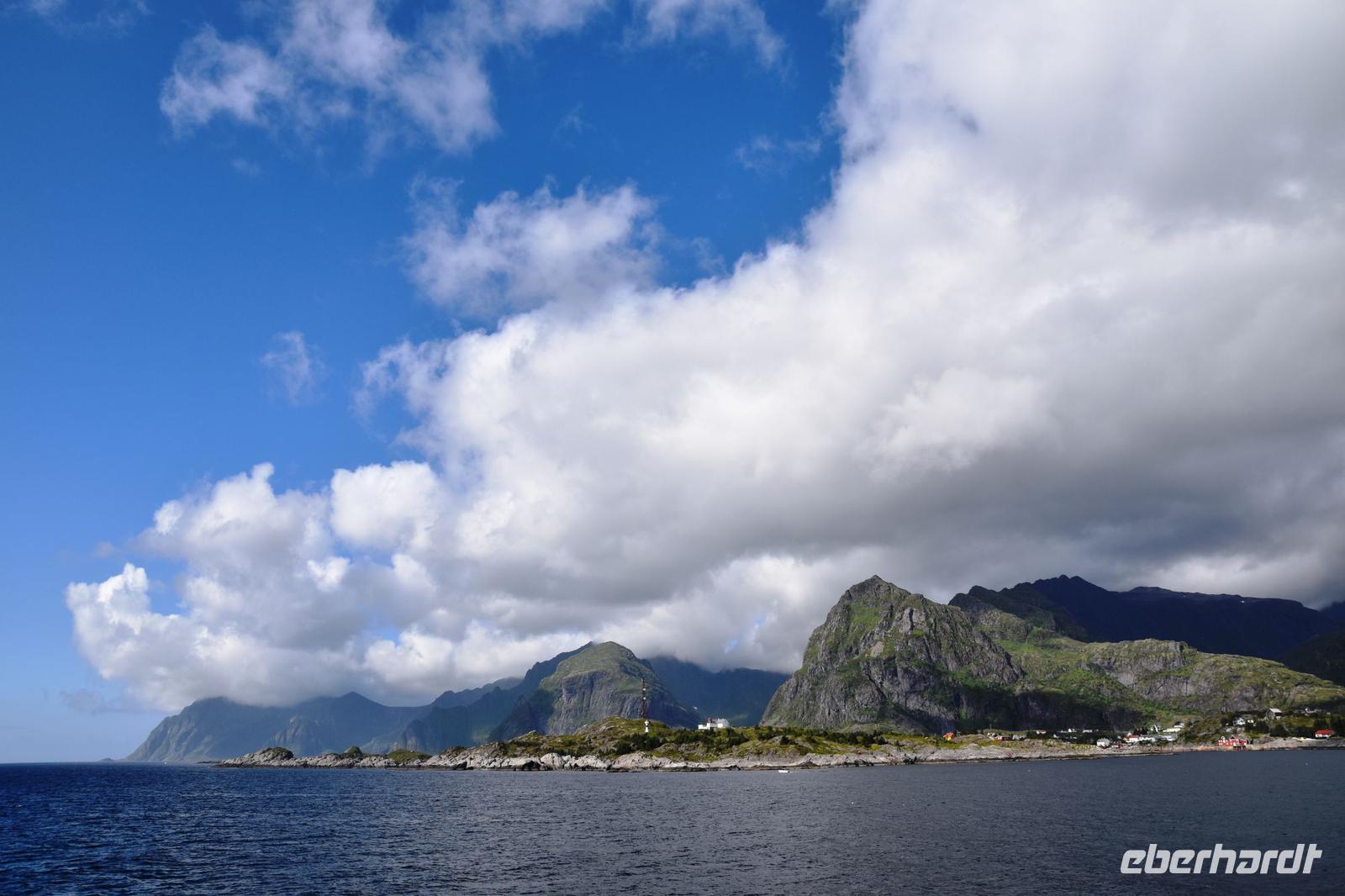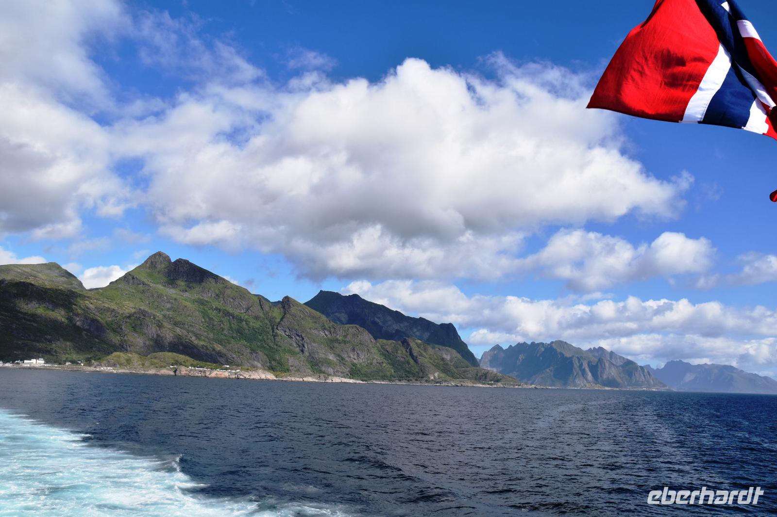 Die weitere Fahrt an den nächsten Tagen abwechselnd mit Bus und Fähren entlang Überfahrt von Moskenes nach Bodø beginnt. Besonders sehenswert ist die sogenannte „Lofotenwand", die sich in voller Breite vor uns aufbaut, je weiter wir uns entfernen. Fast ebenso imposant die Bergwelt an der Küste und rings um Bodø.