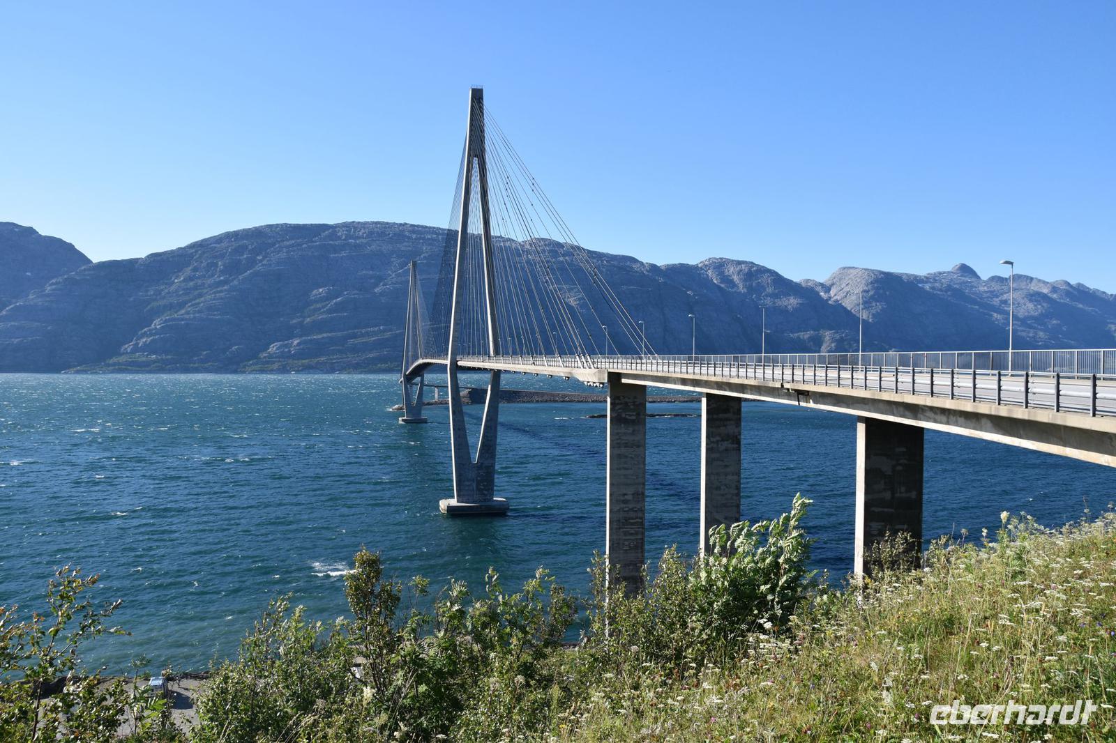 Am Saltfjord entlang fahren wir nach Fauske, in Norwegens Mamorstadt, wo wir wieder auf die norwegischen Nord-Südtrasse treffen, die E6. Auf ihr geht es hinauf auf über 1000 m Höhe, hinauf auf das Saltfjell mit dem Svartisen-Gletscher im Westen und den ca. 1500 m hohen Bergen rund um Norwegens Polarkreiszentrum.