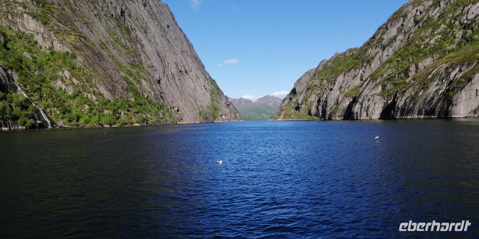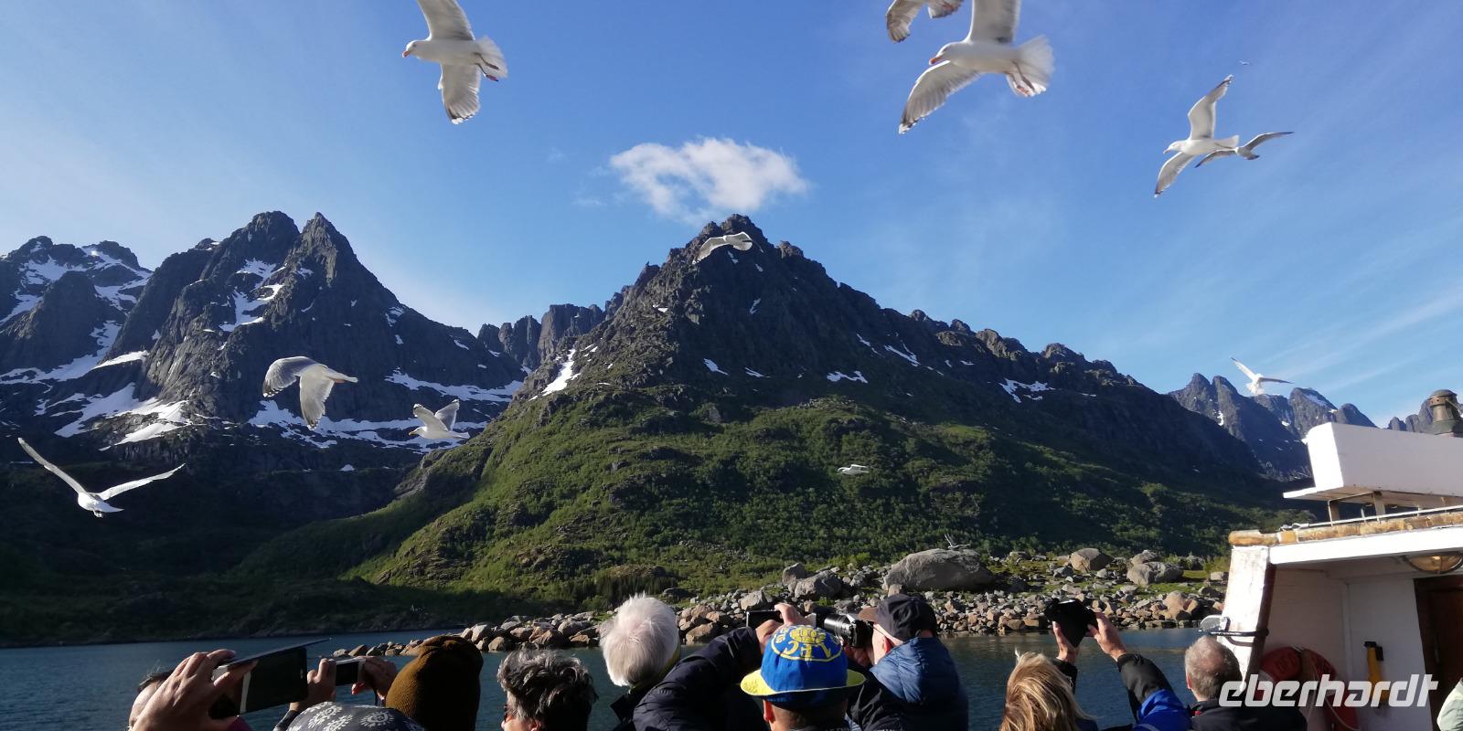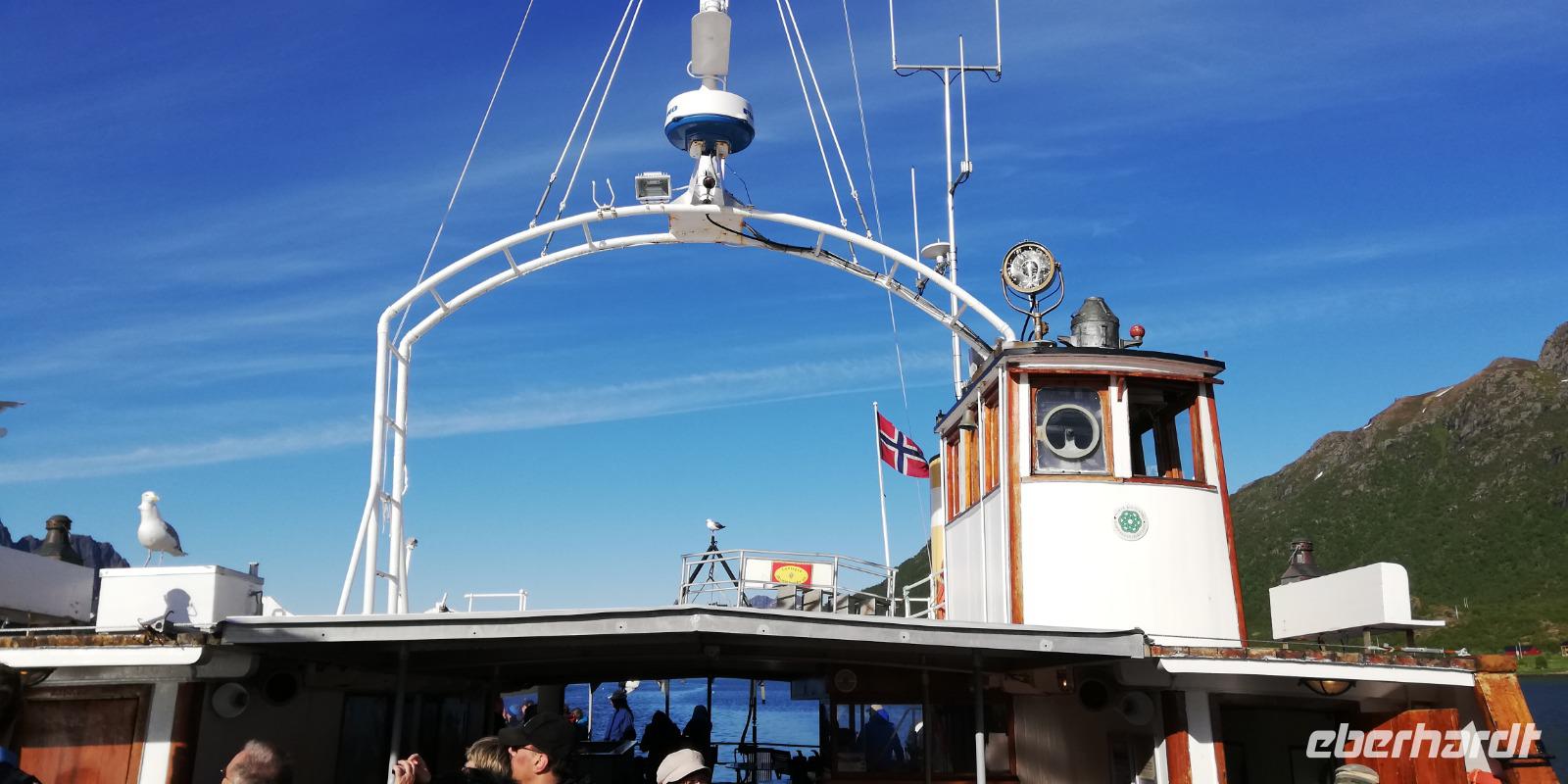 und dann kamen noch Staus in drei Tunnel dazwischen. Mit 35 min Verspätung kamen wir in Svolvear zu unserem Schiff zum Trollfjord. Klare Sicht und Sonnenschein machte diese Tour zu einem Highlight auf diesem Museumsschiff. Nur der kalte Wind störte ab und zu.