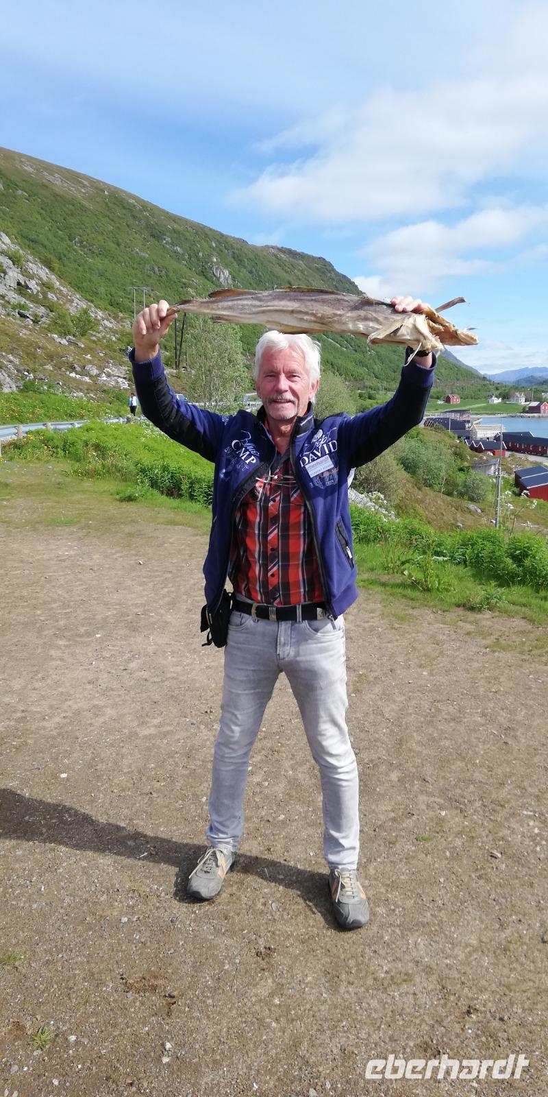 Nach einer Stunde fuhren wir zu unseren Hütten. Pünktlich ging es zur Information über Stockfische. Sehr interessant wie immer. Alle Gäste durften ihn probieren genauso wie den Lebertran. Dies wurde auch reichlich genutzt.