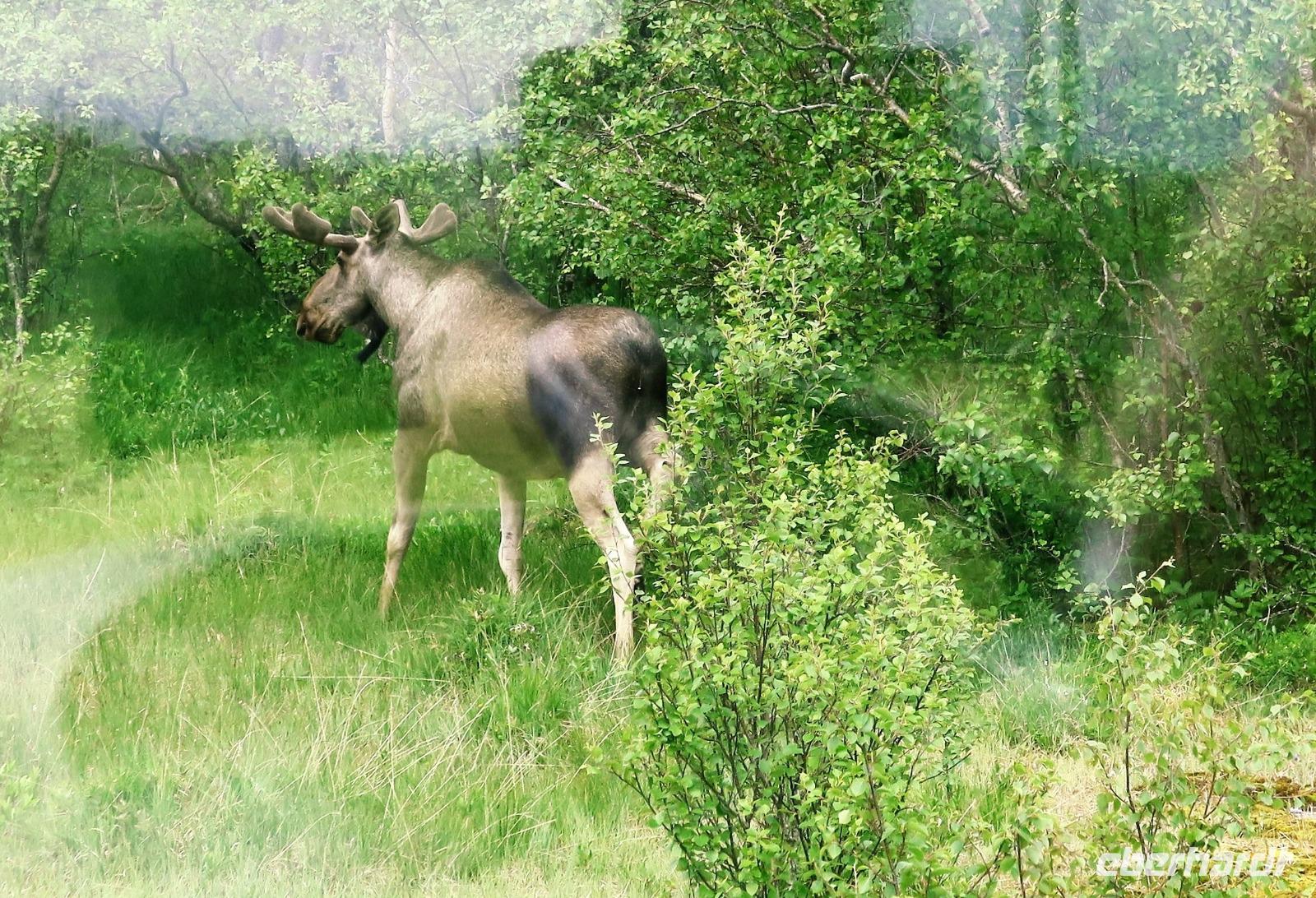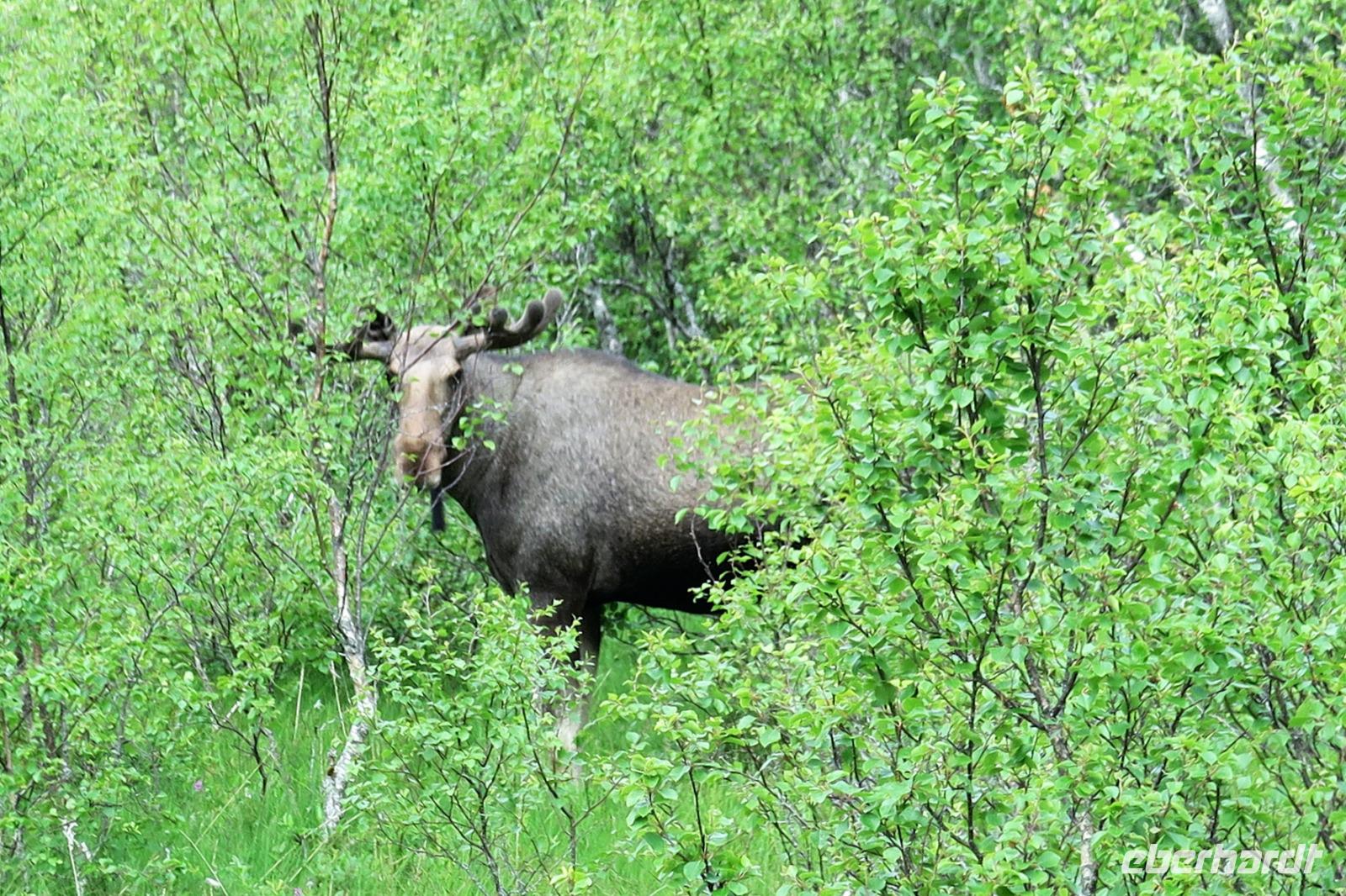 Oh Schreck wie aus dem Nichts stand plötzlich ein Elch an der Strasse vielleicht 10 m entfernt. Einige Gäste hatten das Glück ihn auch zu sehen.