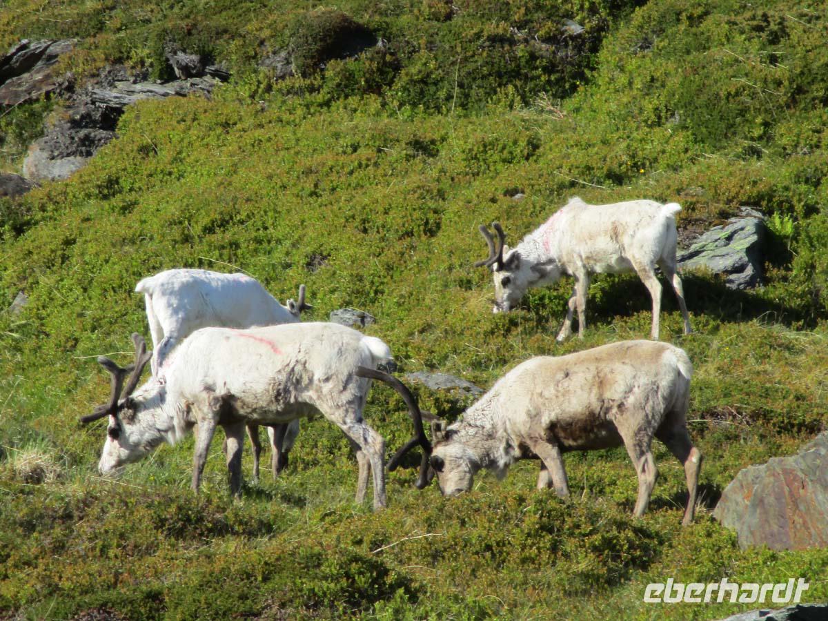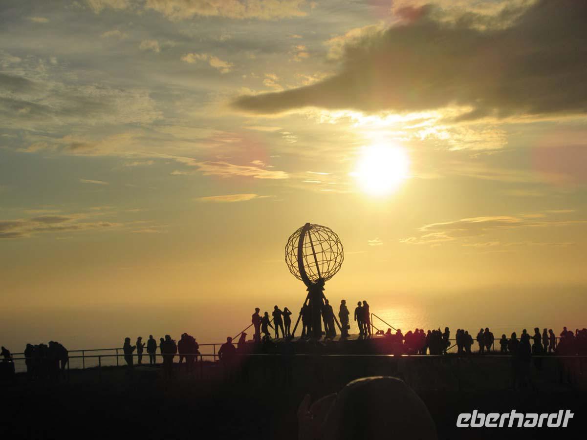 Kurz nach unserer Abfahrt vom Hotel erreichen wir den Inarisee, den größten See Finnlands. Mit seinen mehr als 3000 Inseln wirkt er mitunter weniger wie ein See, denn als ein Flußlabyrinth. Trotz feuchter Witterung lassen wir es uns nicht nehmen, am Wasser einen Stopp einzulegen. Über seinem Ufer liegt die Bärenhöhle, ein Monolith, der durch Wasser der Eiszeitgletscher ausgehöhlt worden und umgedreht wurde ist. Mächtige Findlinge liegen in dem Wald um ihn herum verstreut. Hinter der Stadt Inari erreichen geht die Landschaft langsam in die Birkenwaldzone über. Dieser Baum, die Birke ist hier mitunter bis zum Horizont die einzige Pflanze. Dieser Vegetationsgürtel überzieht ganz Nordskandinavien bis nach Russland hinein. Aber die Birken haben hier Krüppelformen ausgebildet, was am kalten Klima liegt und sind selten höher als 3 m. Der Inarijoki bildet die Grenze zwischen Norwegen und Finnland. Wir gehen zu Fuß hinüber. Nun stellen wir die Uhr wieder zurück und halten in Karasjok am Samizentrum. Hier stärken wir uns bei einem kleinen Imbass mit Finnischen Brot, Butter, Käse und der leckeren Moltebeermarmelade. Über die Hochebene Finnmarksvidda und entlang des Porsangerfjords, wo wir bei einem Photostop erreichen wir späten Nachmittag die Insel Mageröy. Und hier zeigen sich uns aus nächster Nähe die schon lange vermissten Rentiere. Entweder ließen sie sich in den letzten Stunden gar nicht sehen, oder wenn, dann in weiter Ferne am Horizont. Nun haben wir sie direkt vor der Linse. Unser Hotel liegt mitten im Hauptort Honnigsvaeg. .Nachdem wir unser Abendessen eingenommen haben, geht es gegen 21 Uhr auf zum Nordkap. Um Mitternacht ist es auf dem Schieferfelsen am Nordmeer noch taghell. Im der Nordkaphalle werden Filme gezeigt und viel zur Geschichte des Kaps ist überdies zu erfahren. Als wir gegen 0.15 Uhr unsere Nordkapdiplome erhalten, steht die Mitternachtssonne hell am Himmel. Welch ein Anblick! Erst gegen ein Uhr sind wir wieder im Hotel.