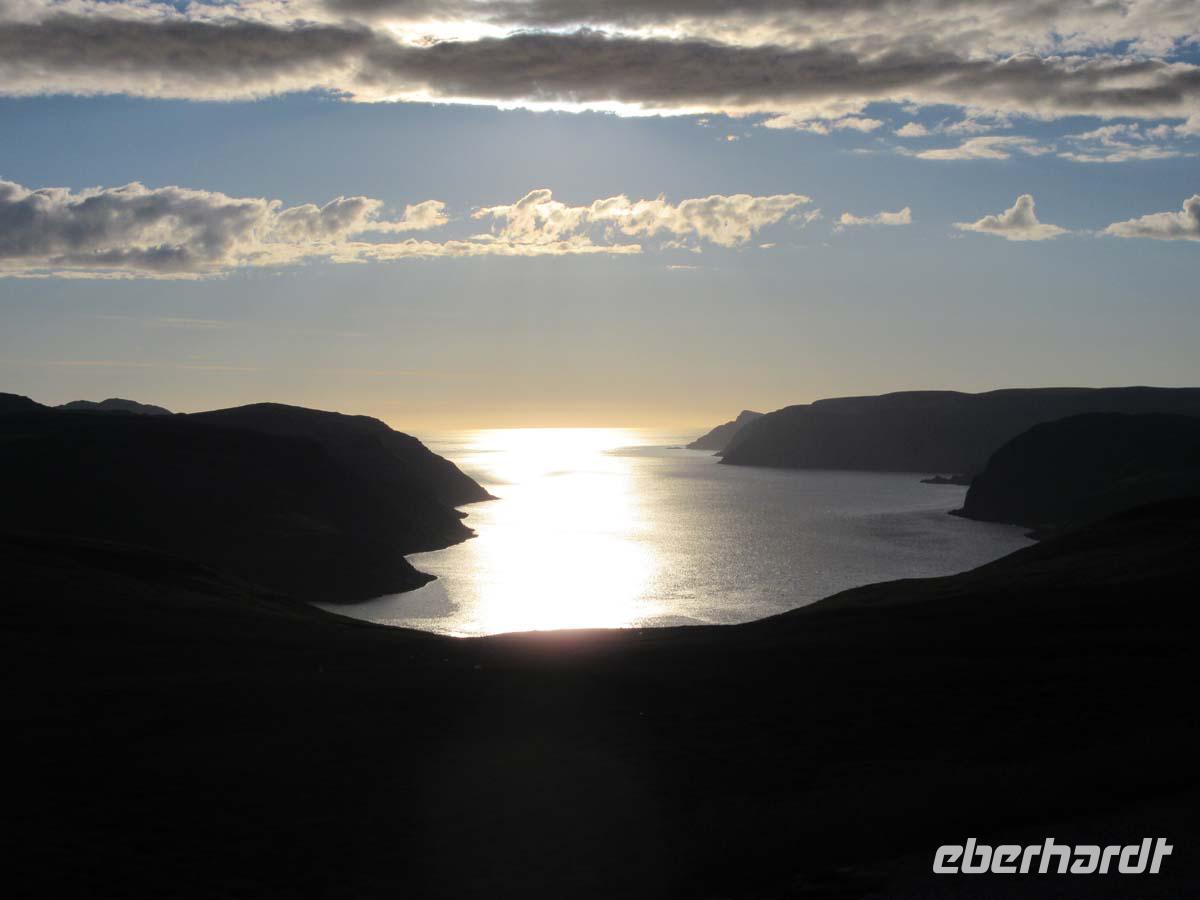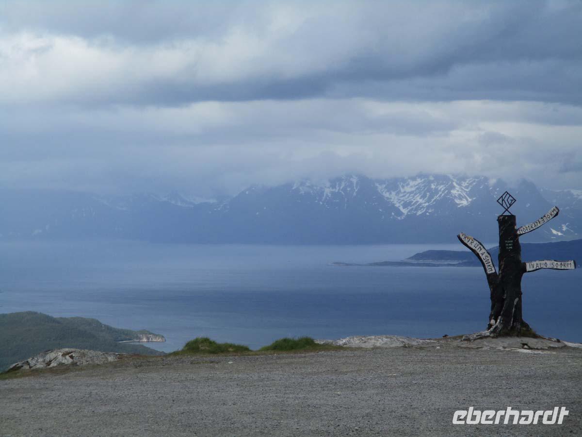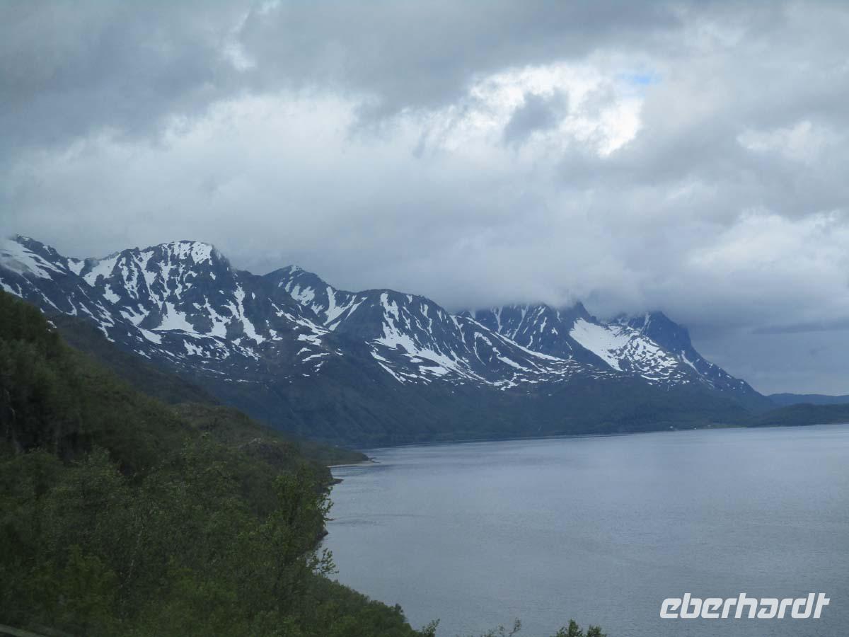 Am Olderfjord vorbei und durchs Sennalandet begeben wir uns heute nach einer sehr kurzen Nacht in die Landschaft Hjemmeluft ins Alta Museum am gleichnamigen Fjord. Hier sind uralte Felsritzungen zu bestaunen. Sie haben ein Alter von etwa 2000 bis 6500 Jahren. Jüngere Ritzungen sind nicht bekannt. Die Zeichnungen befinden sich etwa 8,5 m bis 26,5 m über dem Meeresspiegel und wurden in jene Felsen geritzt, die der damaligen Wasserlinie am nächsten lagen. Seit dem Ende der Eiszeit, als das Inlandeis verschwand, hob sich die Landmasse Norwegens stetig. Entsprechend sind die ältesten Ritzungen diejenigen, die am weitesten vom Meer entfernt liegen. Wegen der großen Bedeutung dieser Fundstätte steht sie seit 1985 auf der Welterbeliste. Nach einem langen Weg am Langfjord vorbei erreichen wir den Kvänangenfjord und befahren mit 402 m den höchsten Pass Nordnorwegens. Hier befindet sich der Aussichtspunkt und die Raststätte Gildetun. Hier liegen noch Schneefelder, und die Aussicht auf die Insel Skodra mitten im Fjord ist klar und schön. So lassen wir uns leckeren Kuchen in der hiesigen Gaststätte schmecken. Unser Abendessen nehmen wir im gemütlichen, familiengeführten Hotel in Oteren ein. Auch hier in Oteren sind die Nächte durchgehend taghell.