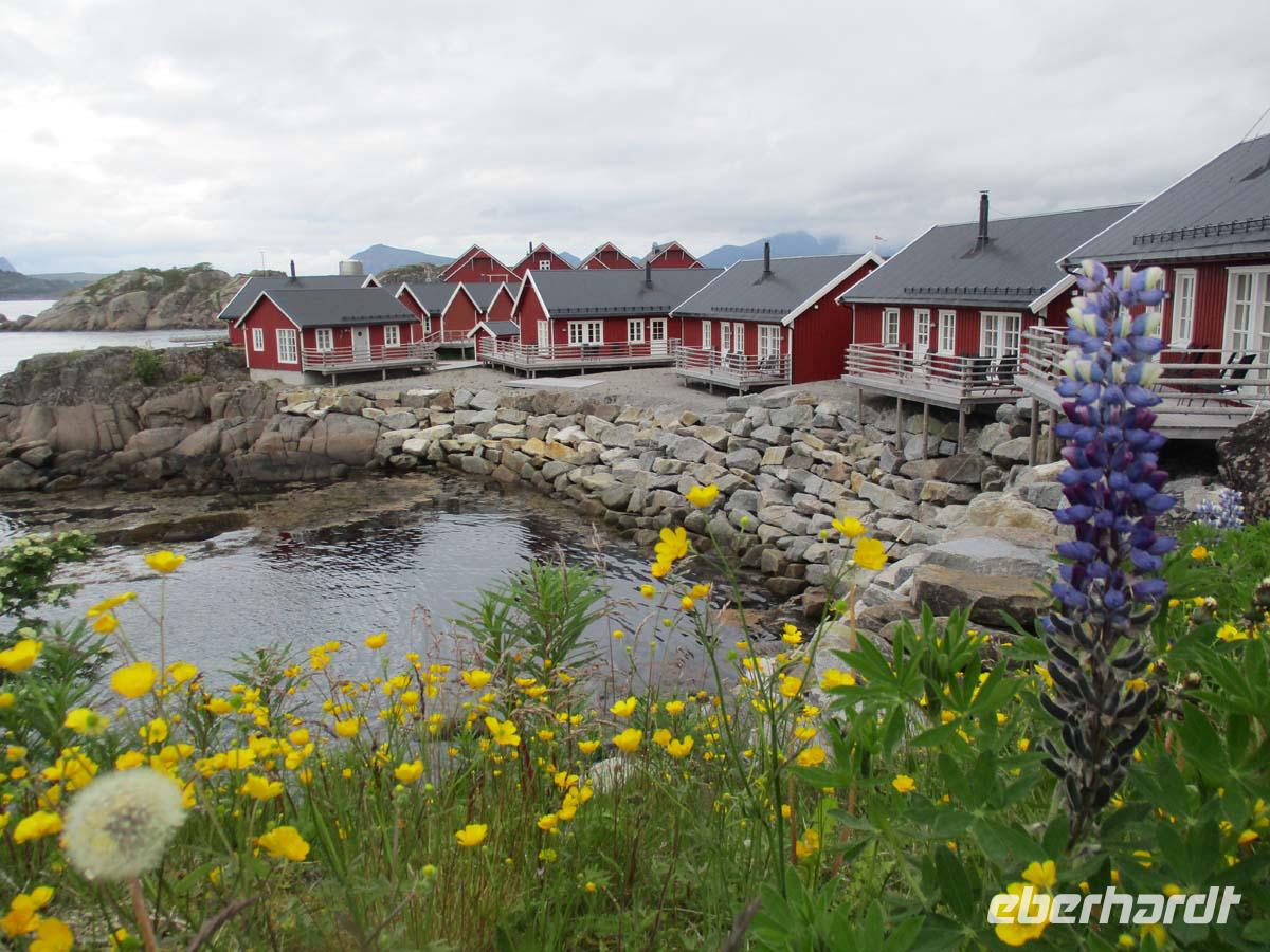 Unsere Rundfahrt über die Lofoten beginnt mit einem authentischen Fischerdorf, welches der ursprüngliche Ort Nusfjord abgibt. Oft liest man, daß Nusfjord auf der Welterbeliste der Unesco steht. Das stimmt jedoch nicht. Trotzdem lohnt ein Besuch dieses kleinen Fischerdorfes, das sich auf der Inselgruppe als eines der ursprünglichsten erhaltenen präsentiert. U. a. findet man hier neben einer wahrhaft malerischen Kulisse eine alte Transiederei, eine historische Bäckerei und einen Landhandel, der in vielem so ausgestattet ist, wie zu Uromas Zeiten. Ein Höhepunkt ist das Wikingermuseum in Borg. Hier hat man ein nach Originalbefunden ausgegrabenes Häuptlings- und Versammlungshaus aus der Wikingerzeit nachgebaut. Es gibt für uns eine deutschsprachige Einführung und danach ein Essen mit einer Suppe, wie sie sicher auch die Nordmänner oft gegessen haben. Lammsuppe mit Sauerrahm und Kräutern, die schon im großen Eisenkessel über offenem Feuer kocht. Ausstellungsräume und ein Film runden den Besuch hervorragend ab. Weil die Strecken oft sft sehr lang waren, und die Tage deshalb auch, so wollen wir heute etwas früher im Hotel sein. Vorher stürmen wir in Leknes noch ein Einkaufszentrum, um uns mit diversen Dingen für die Reise und zu Hause einzudecken. Vor dem Abendmenü erhalten wir einen Vortrag über Stockfisch und Lebertran mit Verkostung. Dieser Fisch hat die Lofoten berühmt und reich gemacht. Es gab gar nicht so viele Fischer hier, sodass diese auch für die Fangsaison aus fremden Ländern angeworben wurden. Bis zu 30000 Fischer waren es in den 40er Jahren und das prägte den Begriff der Lofotenfischerei.