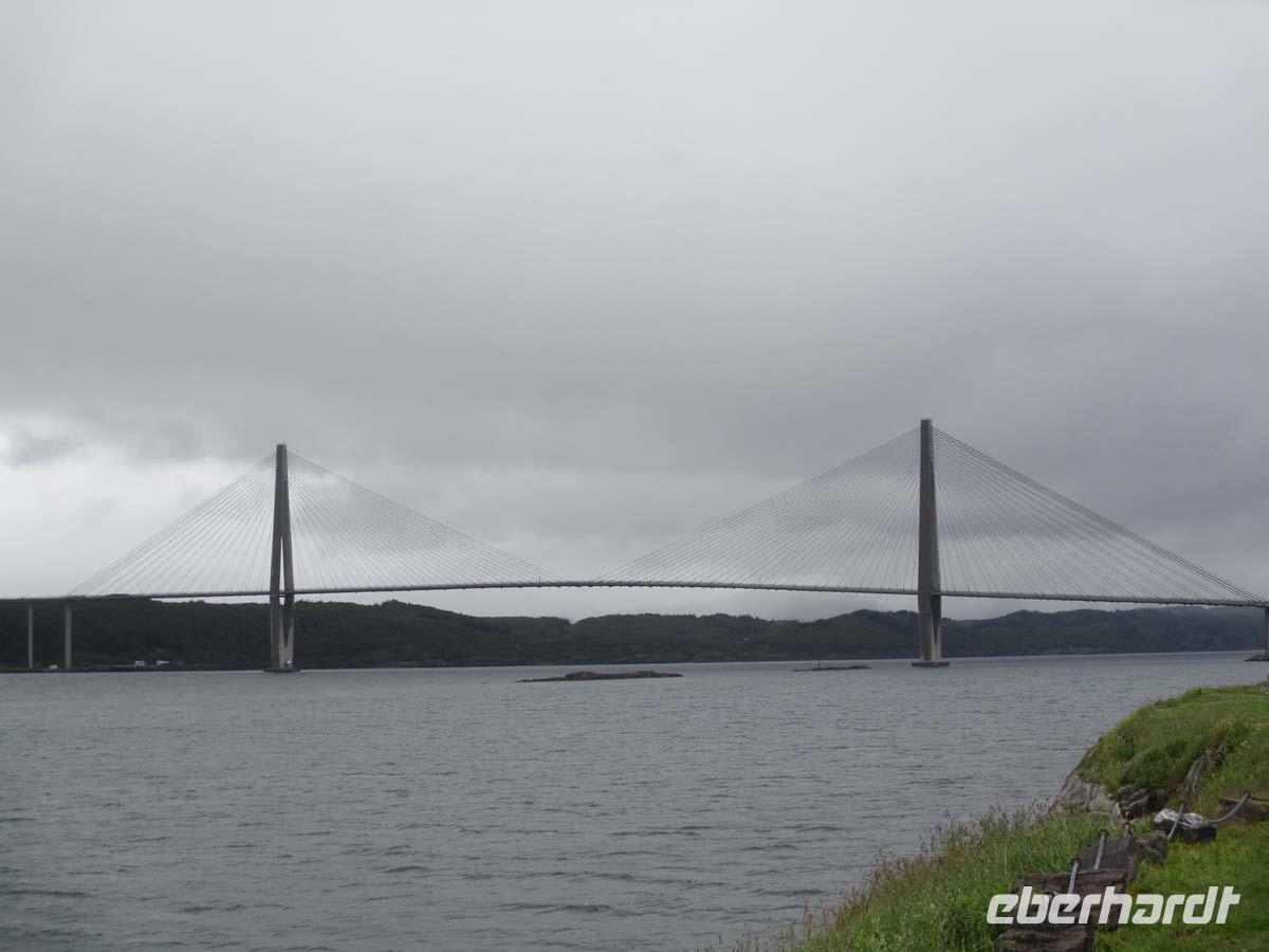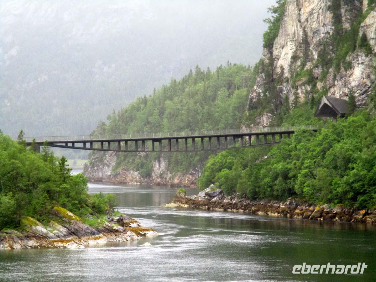 Wir reisen heute durch die historische Landschaft Helgeland, die im Mittelalter sogar einmal ein eigenständiges Königreich war. Zunächst gönnen wir uns einen Aufenthalt an der riesigen Helgelandsbrücke. Danach ist heute richtiges Fjordhüpfen angesagt. Drei Fähren müssen wir benutzen um an unser Ziel zu gelangen. Wir sehej und merken, wie wichtig dieses vielen kleinen Fähren für das Leben an der so inselreichen Küste Helhgelands sind. Selbst Linienbusse haben mitunter Fähren in ihren Strecken drin. Von Tjötta nach Farvik hätten man einen Blick auf die 7 Schwestern gehabt, der Sage nach versteinerte Riesenjungfrauen. Doch leider ist der ganze Tag verregnet und die Wolken hängen tief. Diese hüllen sich jedoch heute in dichte Regenwolken. Auch den Torghätten, einen Berg mit einem Loch in der Mitte bekommen wir Gesicht. Das wir weiter nach Süden kommen und mit dem Erreichen des Trondelags nun schon in Mittelnorwegen sind, das sieht man auch an den häufiger werdenden Getreidefeldern neben der Straße. Hauptsächlich Roggen wird in diesen kalten Breitengraden angebaut. Nach weiteren Pausen in Bindal und Grong erreichen wir nach der lang ersehnten Elchsichtung die uralte Stadt Steinkjer an der Mündung des Flusses Namsen. Hier erwartet uns ein reichhaltiges und edles Büffet, das keine Wünsche offen läßt. Danach lohnt noch ein Blick auf eine frühgeschichtliche Schiffssetzung gleich neben dem Hotel. Sie ist der Rest eines größeren Gräberfelds, welches man z.T. ausgegraben hat, und dessen Grablegen zwischen das 6. und 9. Jh. datieren.