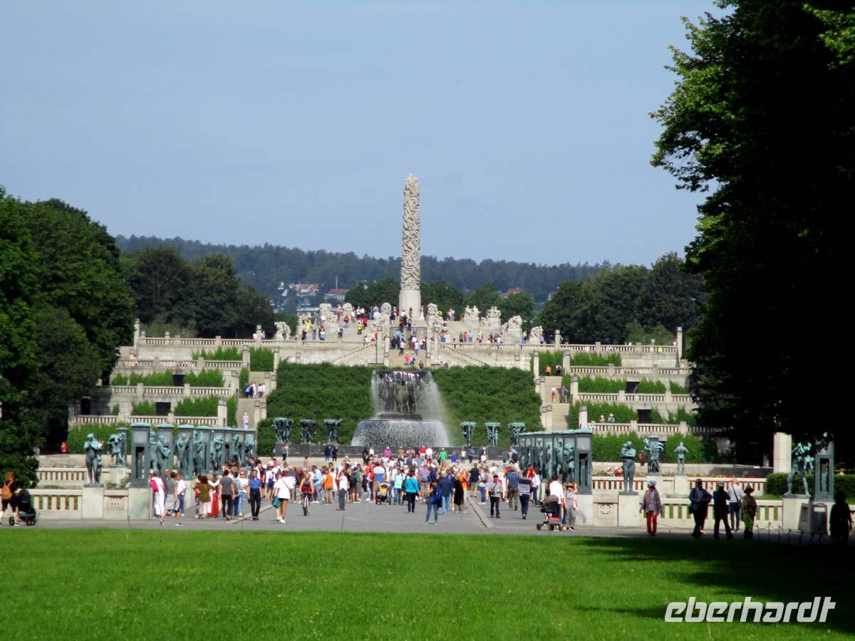 Unsere Stadtrundfahrt mit Solveigh führt uns zunächst in den Vigelandpark. Hier unternehmen wir einen längeren Spaziergang. Der Künstler Vigeland hat hier mehr als 200 Skulpturen in Granit und Bronze geschaffen, die den Zyklus des Lebens darstellen. Weiter geht es durch alter Gründerzeitviertel am Schloß vorbei. Leider machen es die vielen Baustellen und Straßensperrungen in Oslo unmöglich, mit dem Bus bis zum Rathaus vorzudringen. Also reisen wir noch an der neuen Oper vorbei machen einen kurzen Spaziergang zur Festung Akershus hinauf. Von hier aus kann man bis zum Holmenkollen mit seinen Sprungschanzen blicken und hat auch die Silhouette des Rathauses gut im Blick. Schon müssen wir zum Bahnhof, wo wir uns von unseren Fluggästen und jenen, die länger in Oslo bleiben verabschieden. Am frühen Nachmittag überqueren wir die schwedische Grenze und erreichen pünktlich unsere Nachtfähre in Göteburg. Diese wird uns über Nacht nach Kiel bringen. Wieder gibt es ein sehr reichhaltiges Büffet, das keine Wünsche offen lässt.