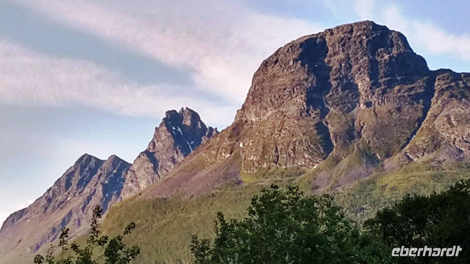 Rings herum erstrahlen die steilen Berge in der Mitternachtssonne.