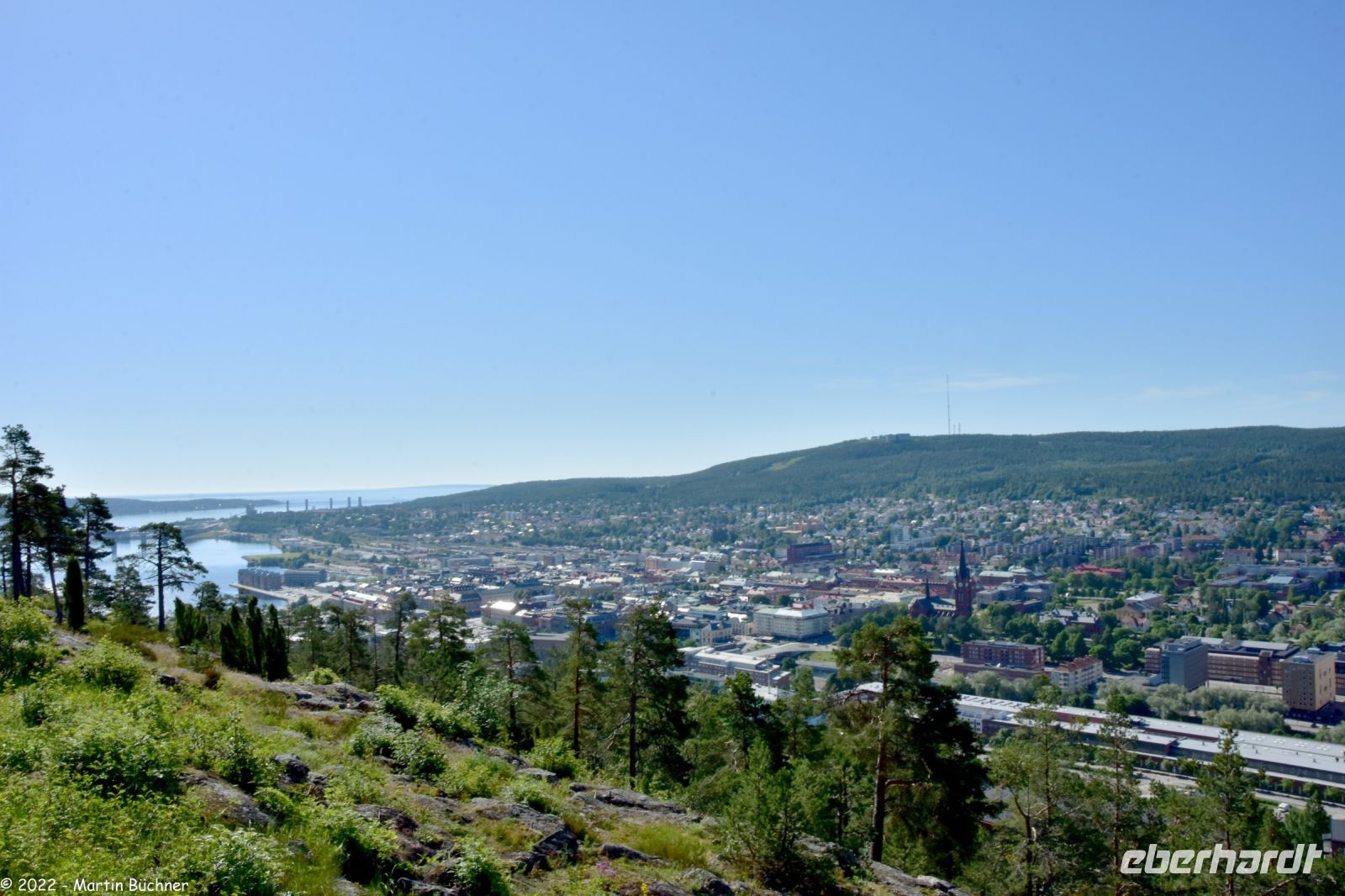 Einen Überblick über die Stadt verschaffen wir uns vom Aussichtsturm auf dem Hausberg Norra Berget, heute zum Feiertag (Flaggentag!) mit riesiger schwedischer Flagge beflaggt, die nur an diesem Tag auch die ganze Nacht (Mittsommernacht) gehisst bleiben darf.