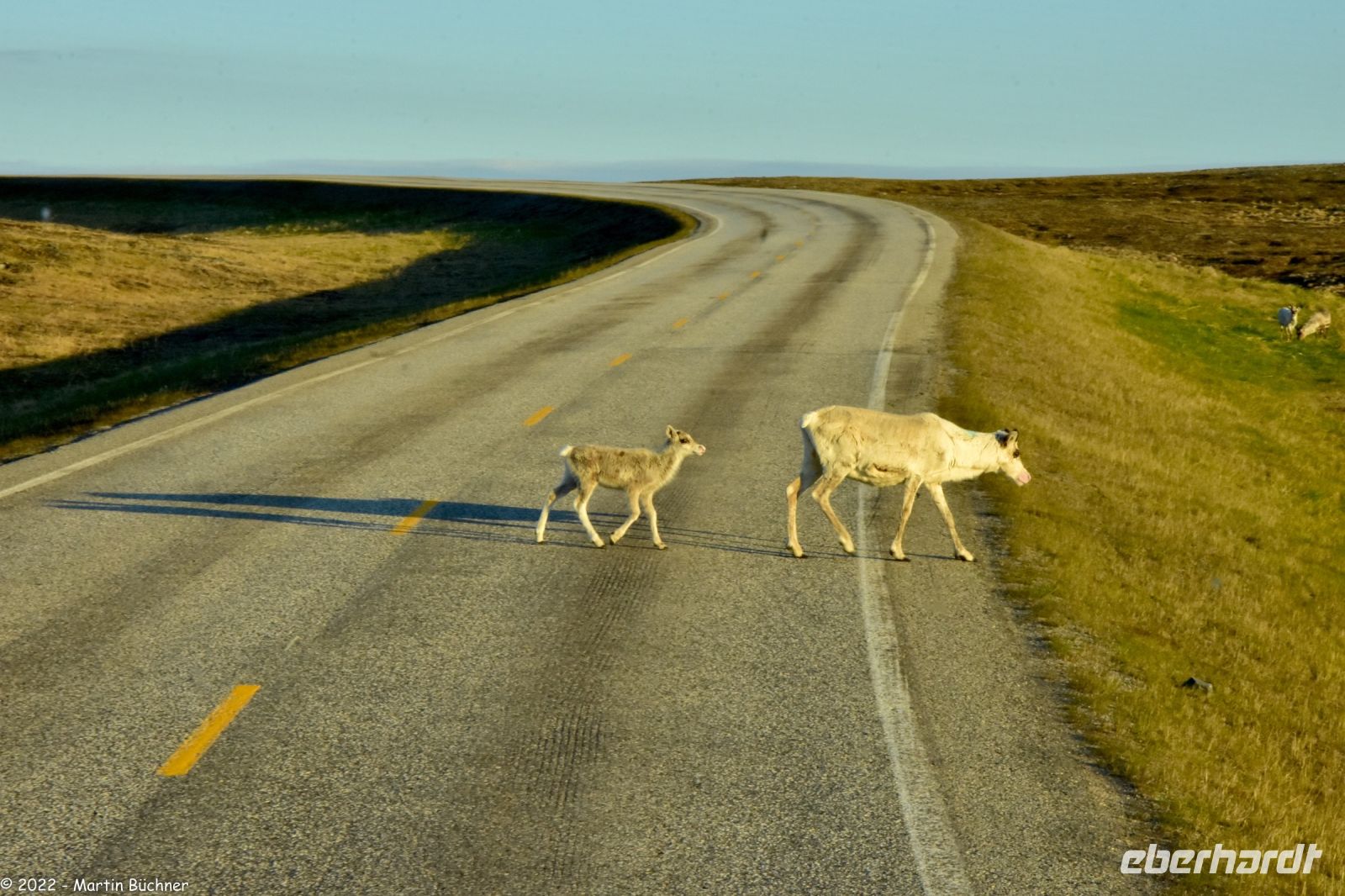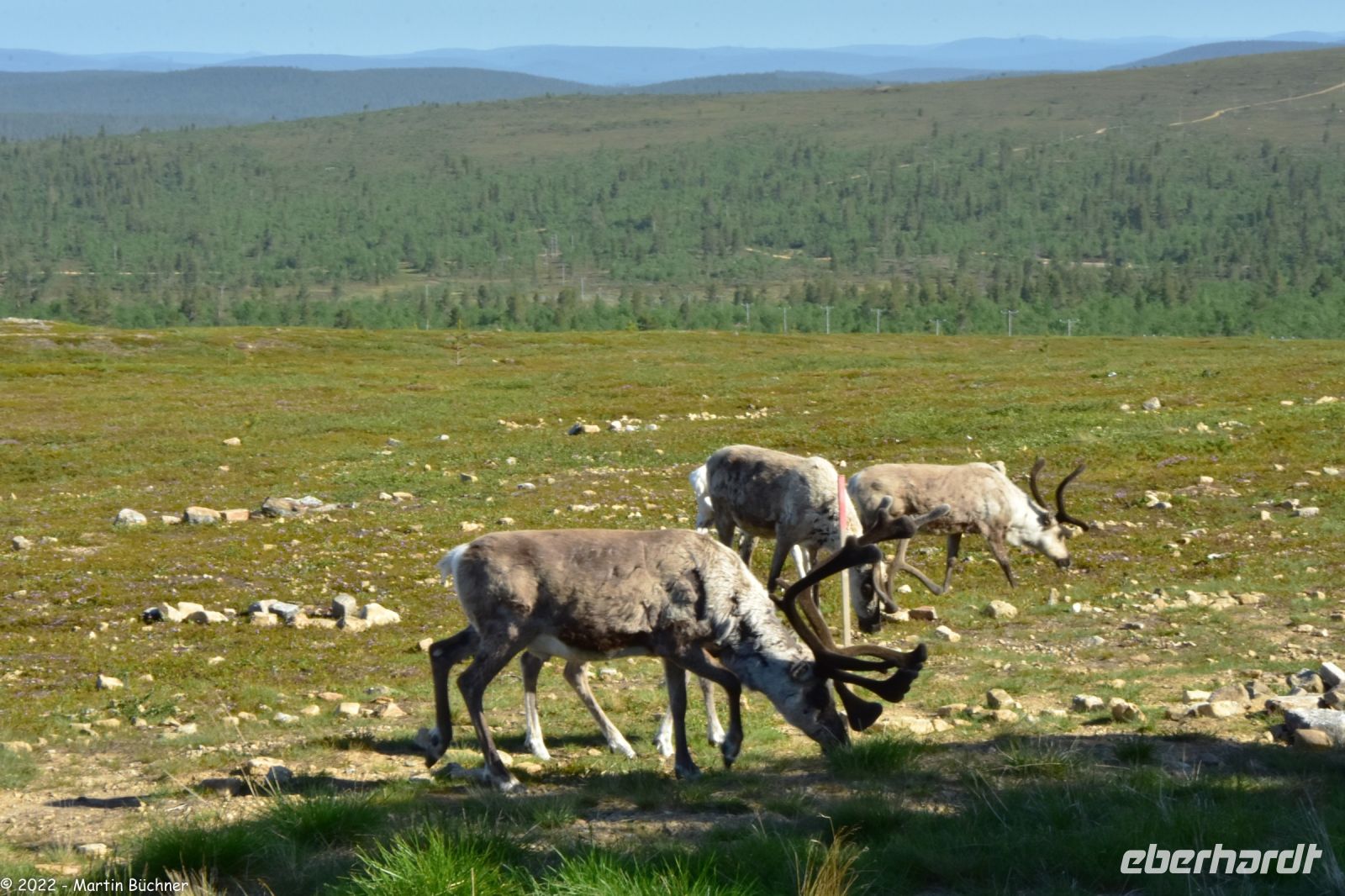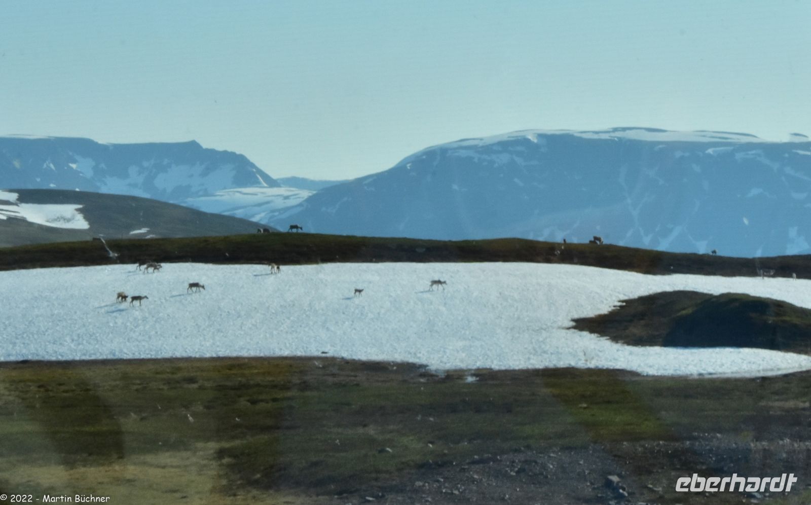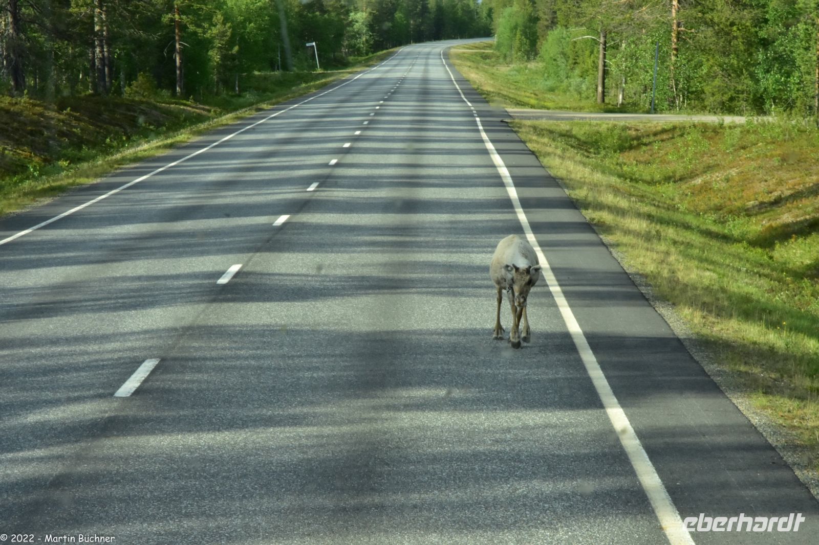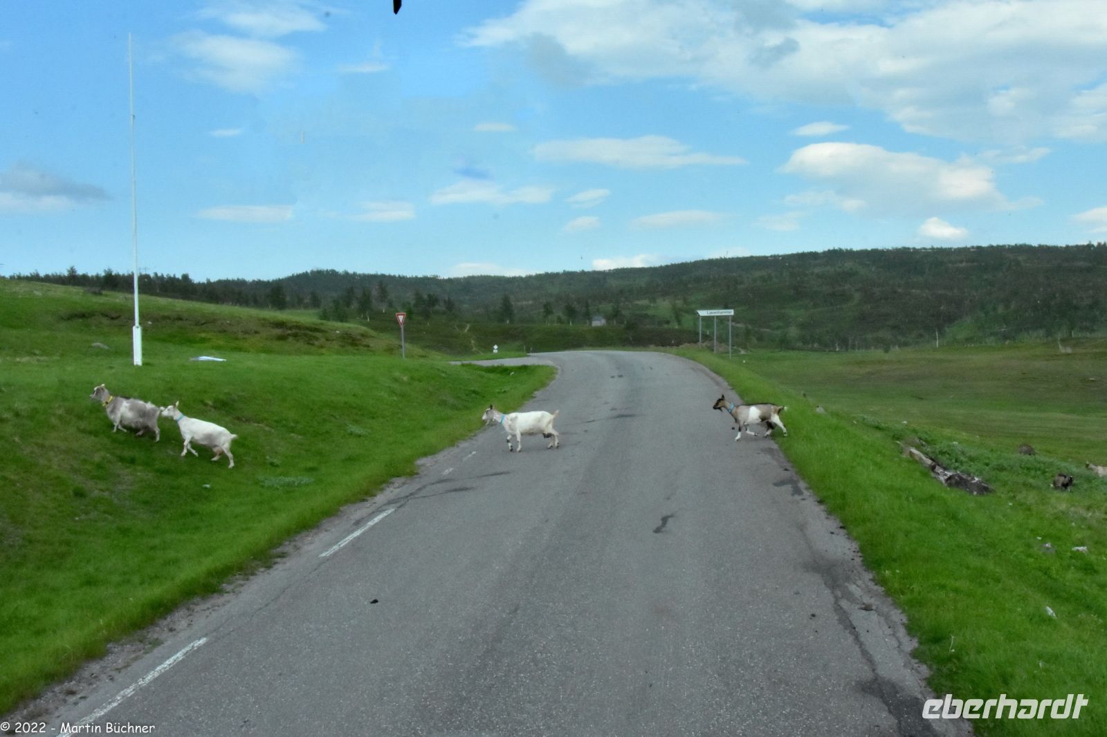 Wir erreichen nun offiziell das Rentier-Schutzgebiet, die Straßenschilder künden davon. Wir sind offiziell in Sapmi, dem Land der Samen, dass wir gern Lappland nennen. Hier leben die Bergsamen (Fjellsamen), die einzige Samengruppe, die Rentiere züchten darf.
