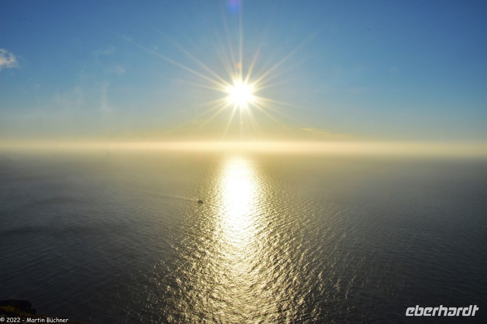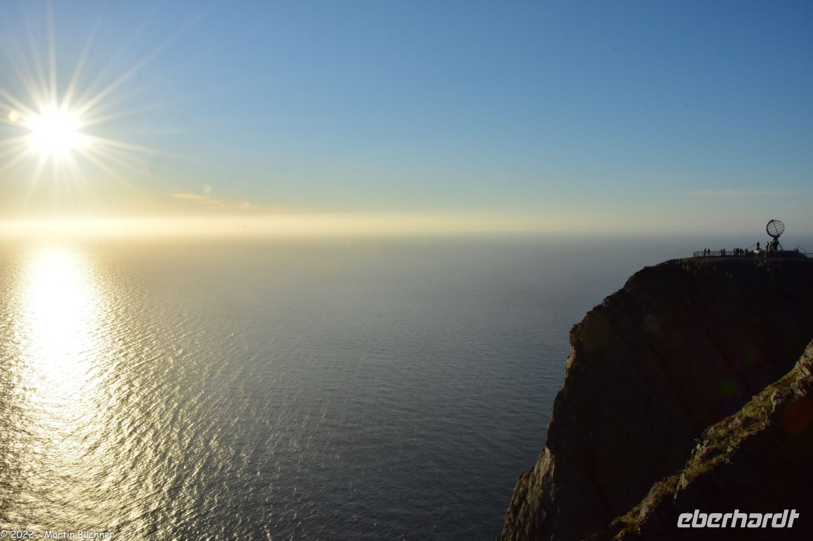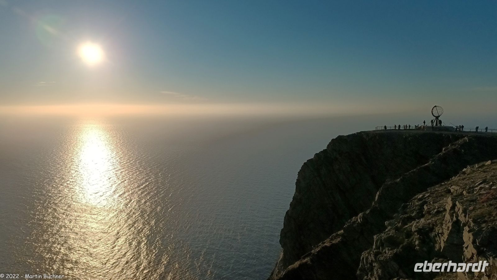 Umso mehr freuen wir uns über das perfekte Wetter am Nordkapp!!! Traumhafte Bedingungen mit blauem, wolkenfreiem Himmel. Blick frei für die Mitternachtssonne.