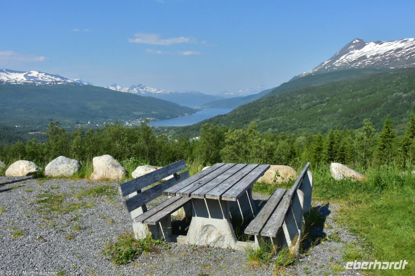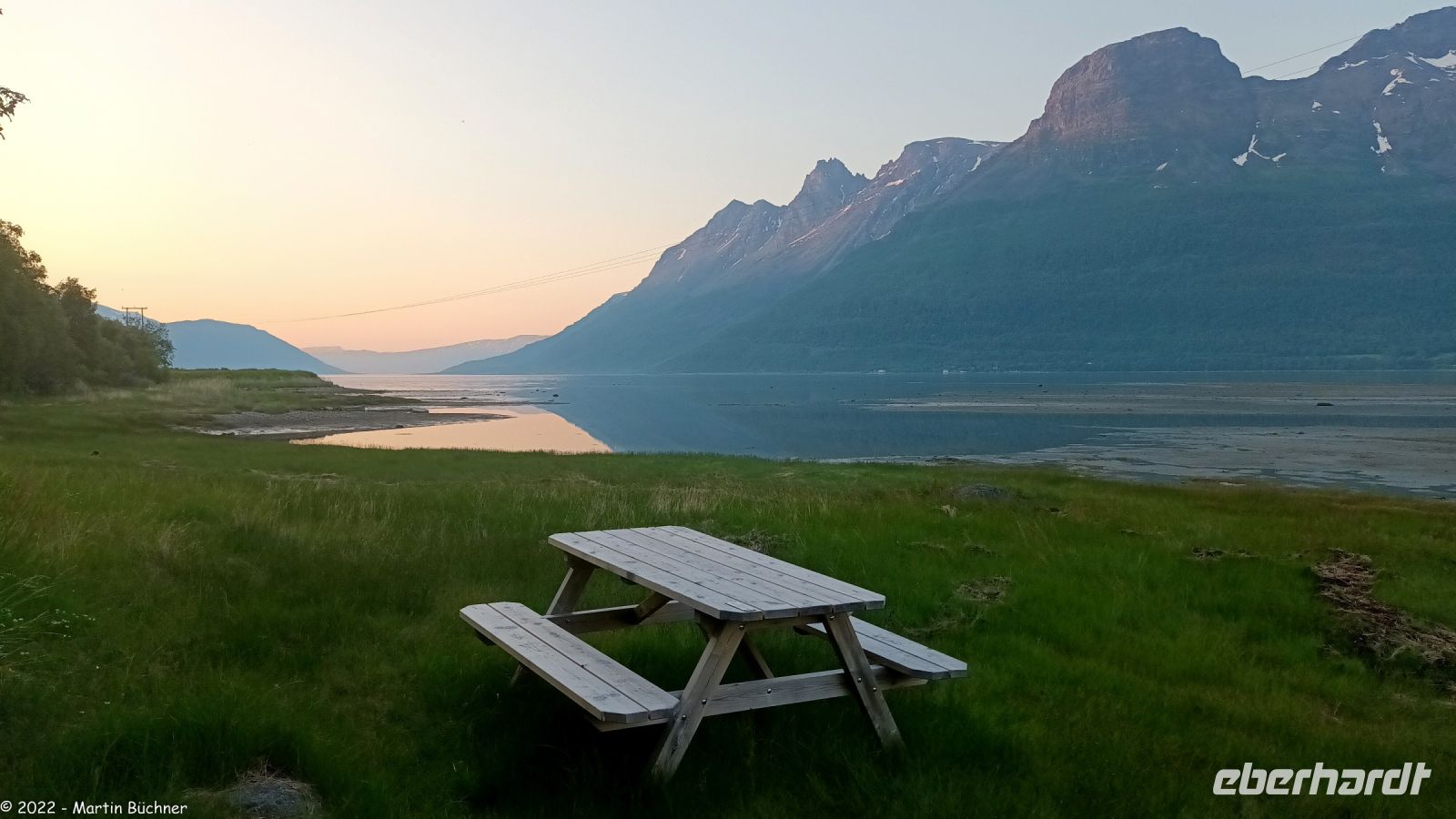 Über den Aussichtspunkt Gildetun/Kvænangen hoch über dem Fjord geht es in das traumhafte Lyngenfjord Gebiet. Die Lyngenalpen im Sommer noch lang schneebedeckt, so auch in diesem Juni. An einigen Stellen befinden sich noch kleinere Gletscher, so wirkt die Szenerie bizarr schön, schroffe vermeintliche Hochgebirgswelten versunken im Meer.