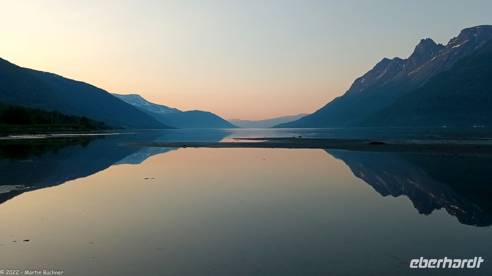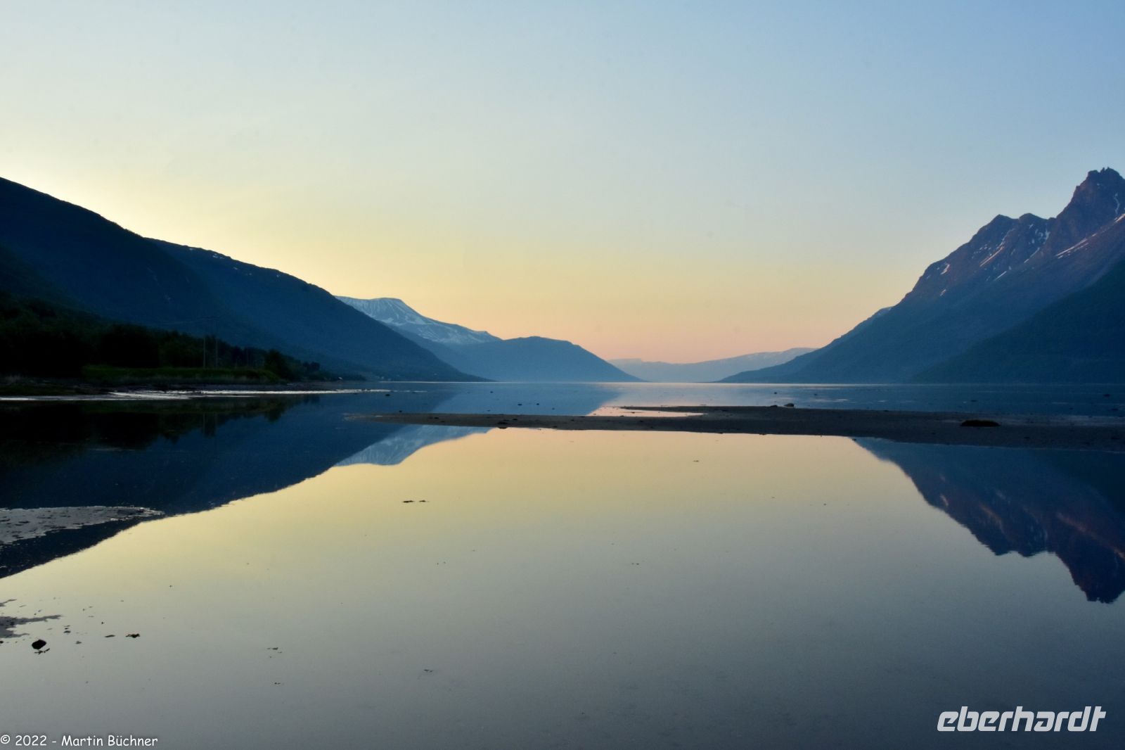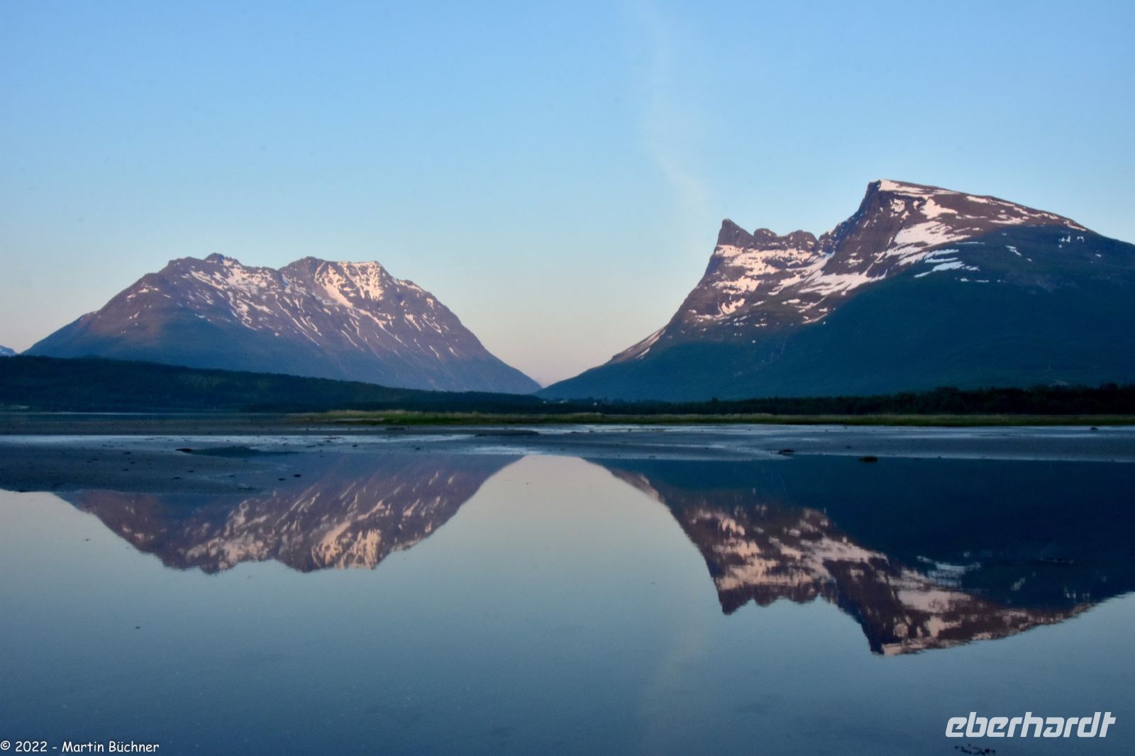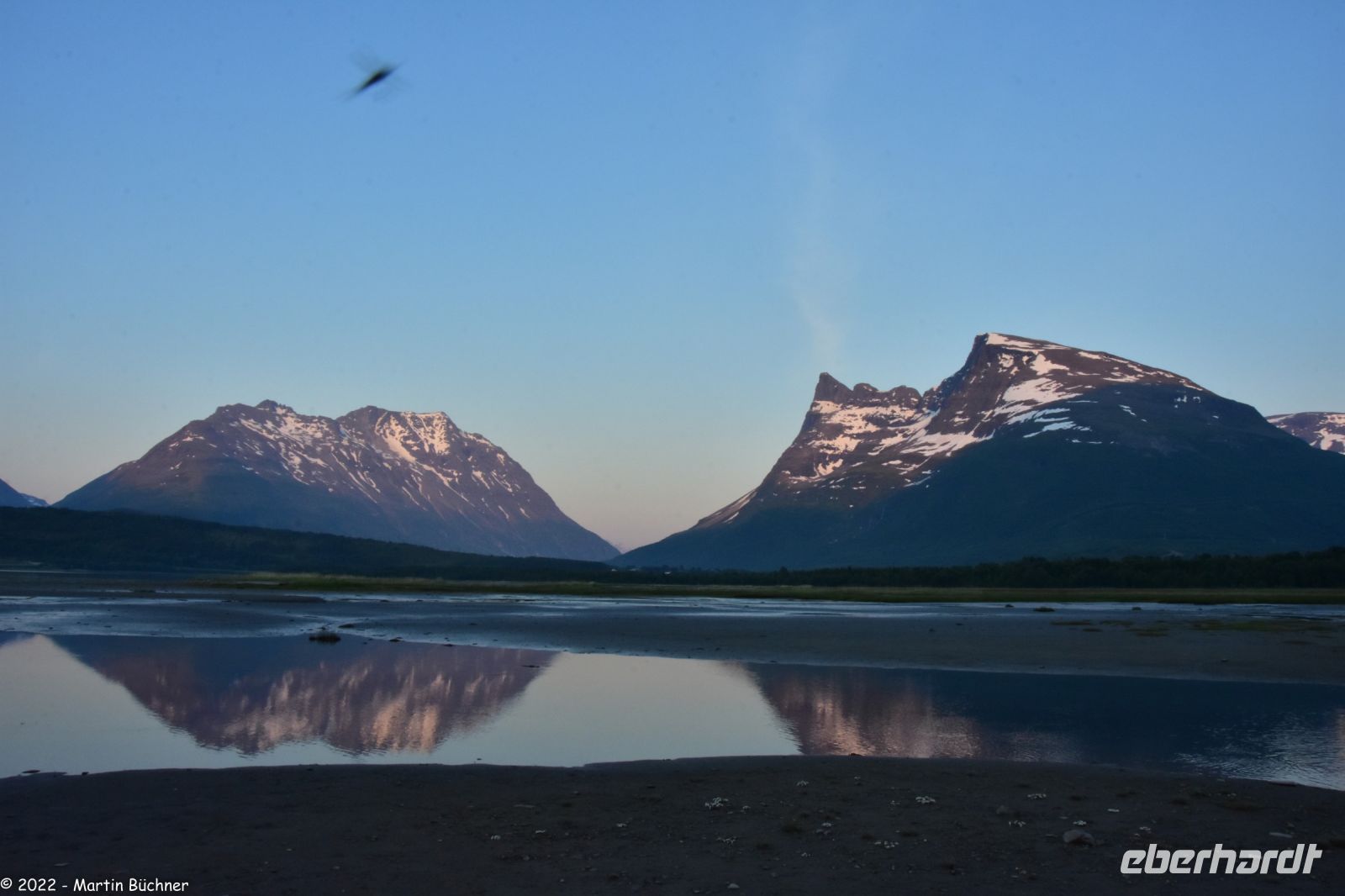 Wir übernachten in Oteren am Lyngenfjord. Unser Hotel liegt mitten in der nordischen Natur. Am Abend unternehmen wir mit einigen tapferen Wanderern aus der Gruppe eine Mitternachtswanderung (bei Tageslicht!). Elch-Sichtungen wollen sich diesmal leider nicht einstellen. Wir sind allerdings genau in dem Moment am Fjord als die Flut zurückkehrt. Ein ganz besonderes Erlebnis! Warum Tapfer? Myriaden von Mücken attackieren uns auf unserer Wanderung. Die sich im Fjord spiegelnde Berglandschaft entschädigt für alles.