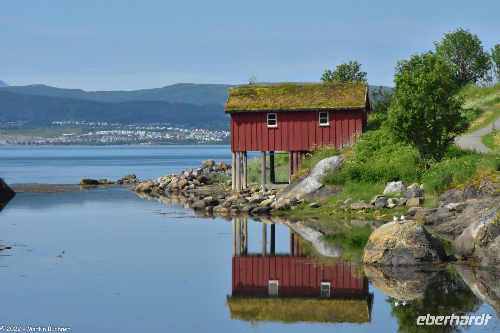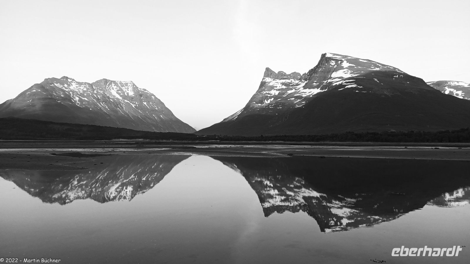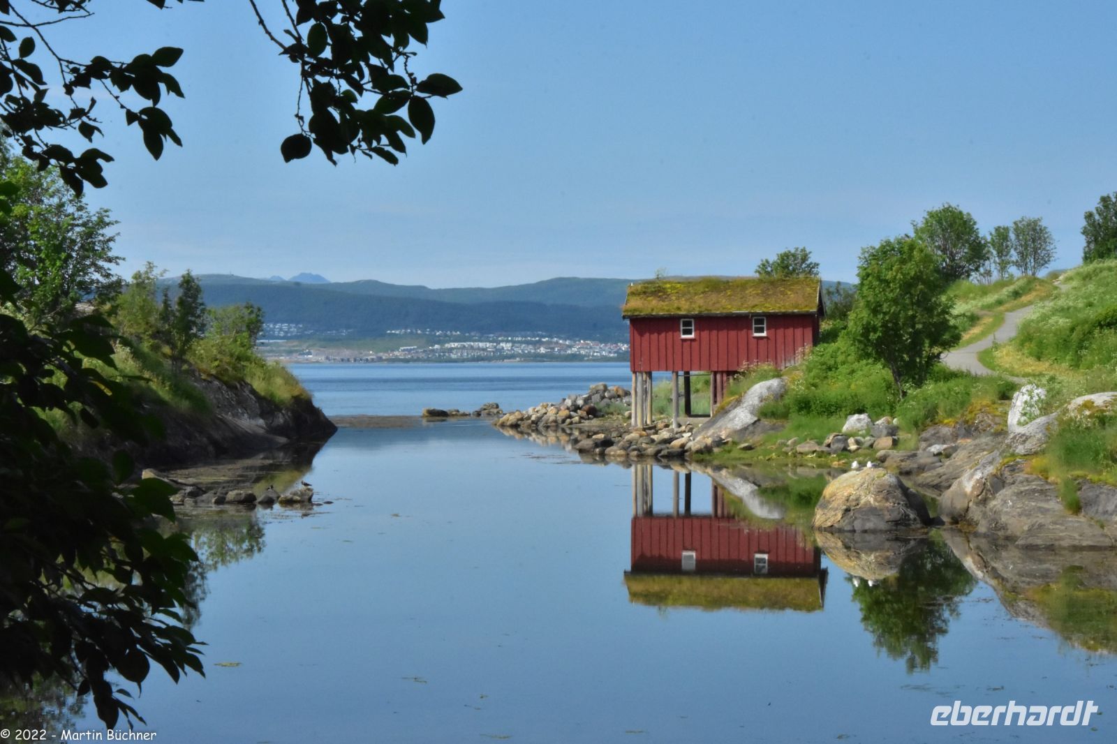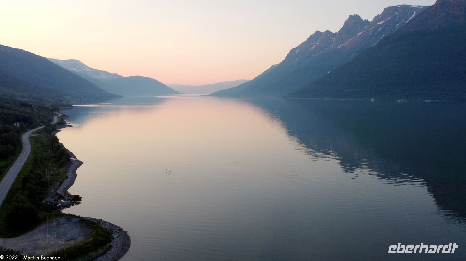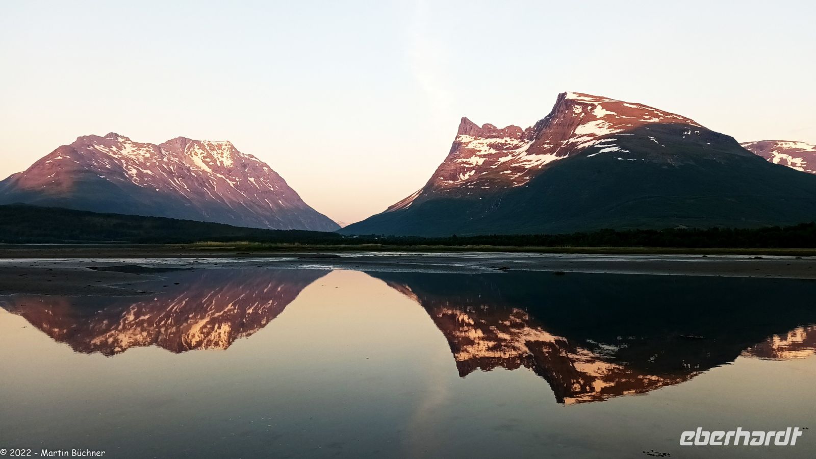 Wir übernachten in Oteren am Lyngenfjord. Unser Hotel liegt mitten in der nordischen Natur. Am Abend unternehmen wir mit einigen tapferen Wanderern aus der Gruppe eine Mitternachtswanderung (bei Tageslicht!). Elch-Sichtungen wollen sich diesmal leider nicht einstellen. Wir sind allerdings genau in dem Moment am Fjord als die Flut zurückkehrt. Ein ganz besonderes Erlebnis! Warum Tapfer? Myriaden von Mücken attackieren uns auf unserer Wanderung. Die sich im Fjord spiegelnde Berglandschaft entschädigt für alles.