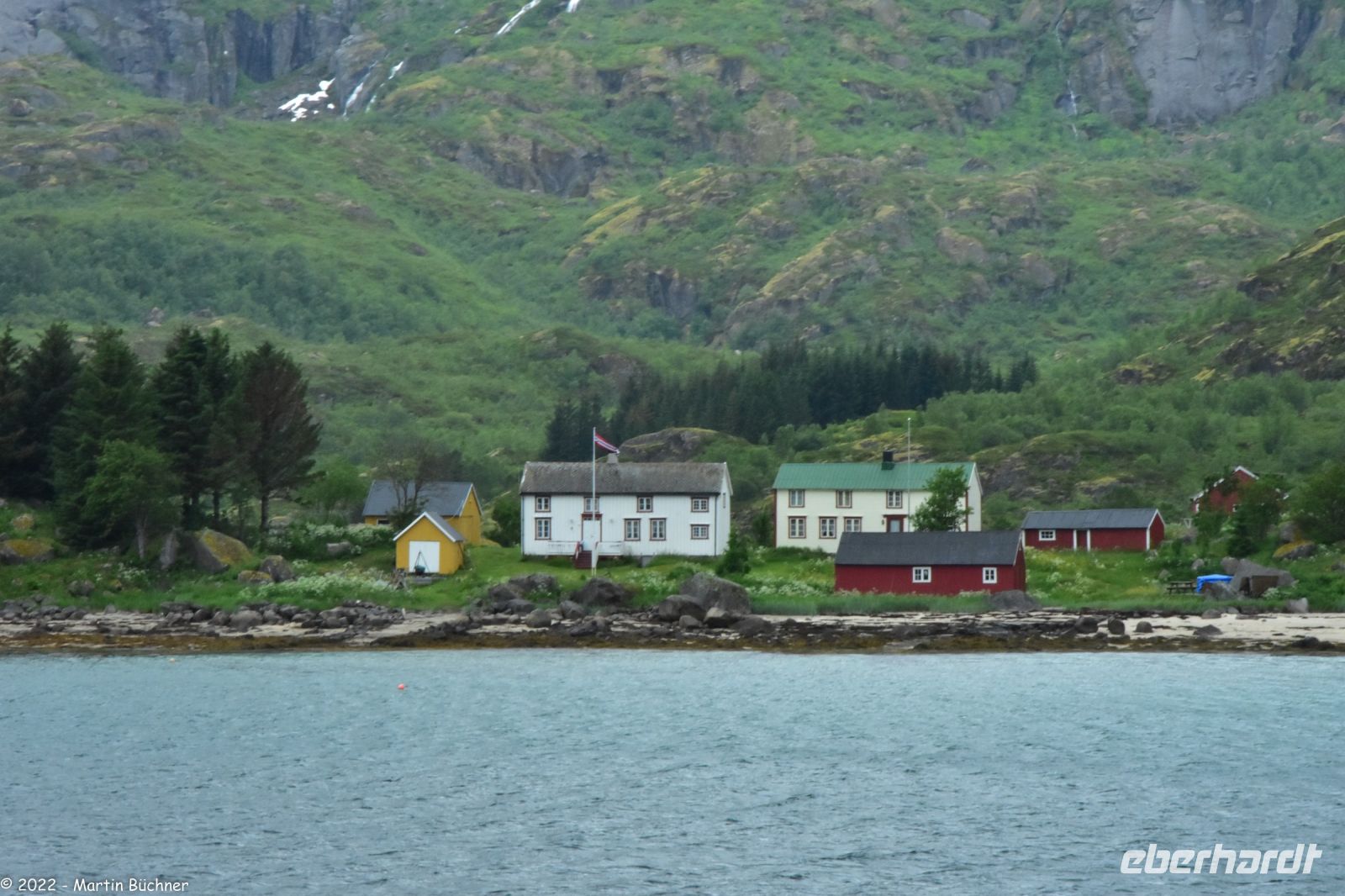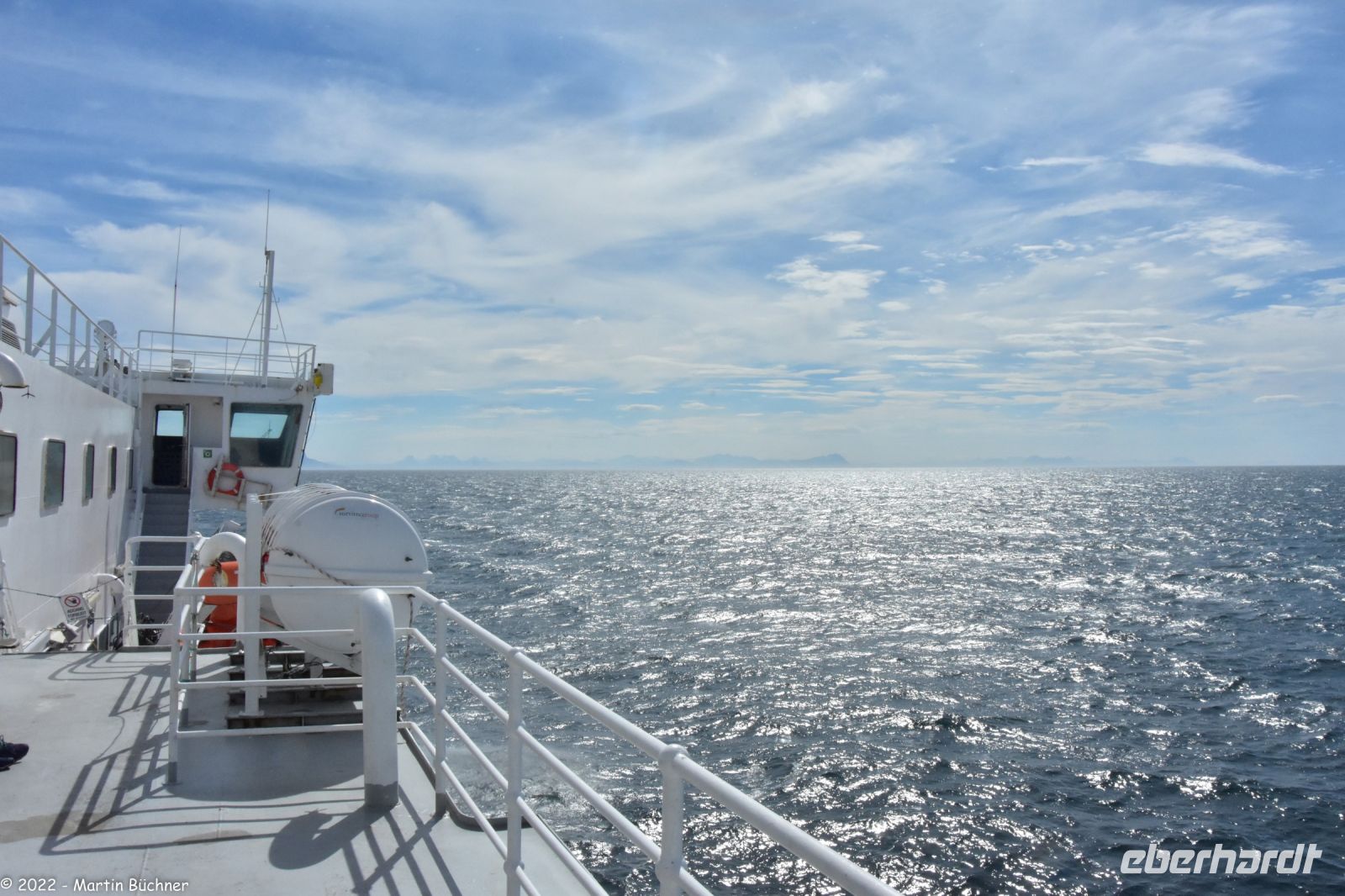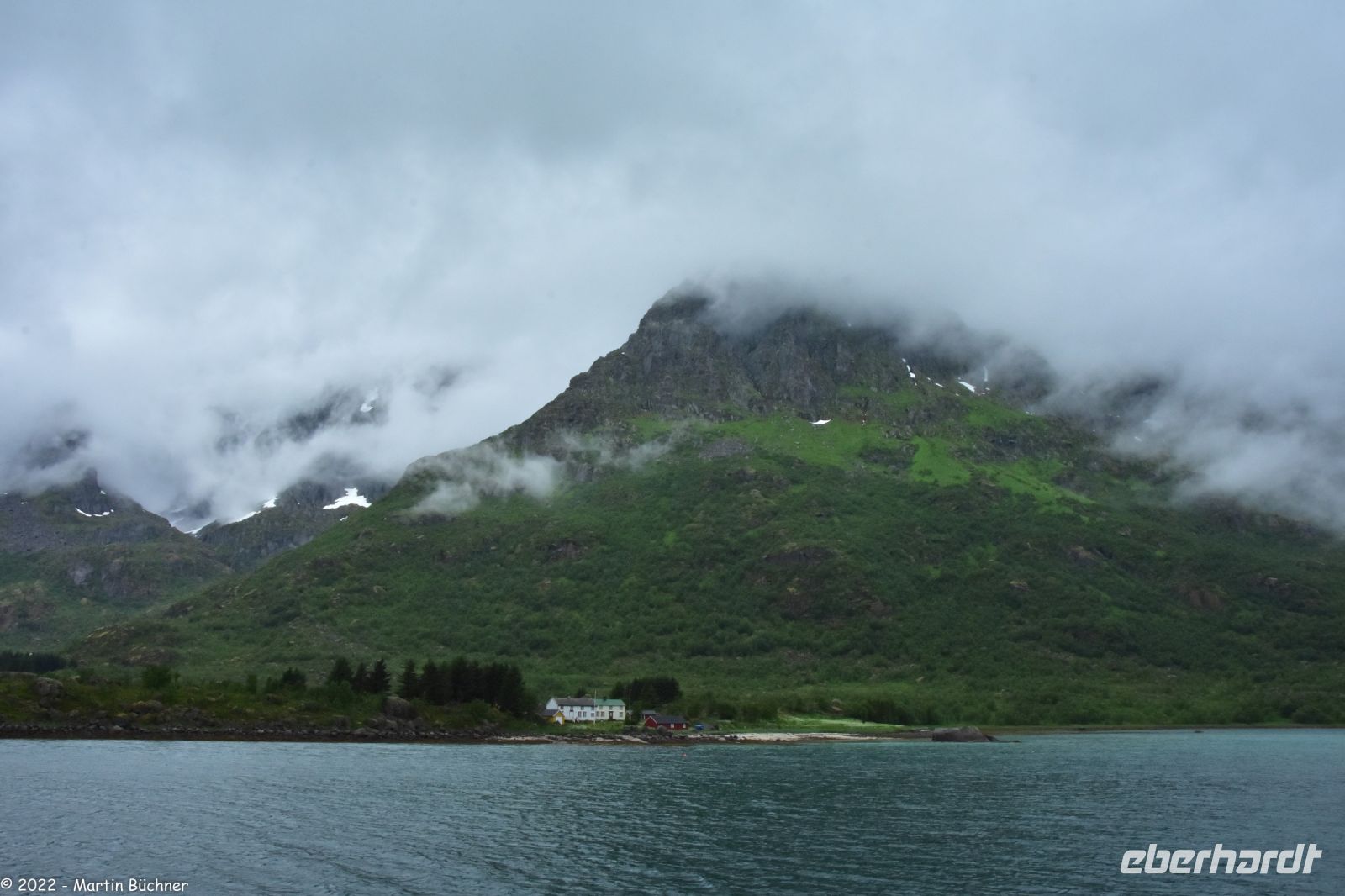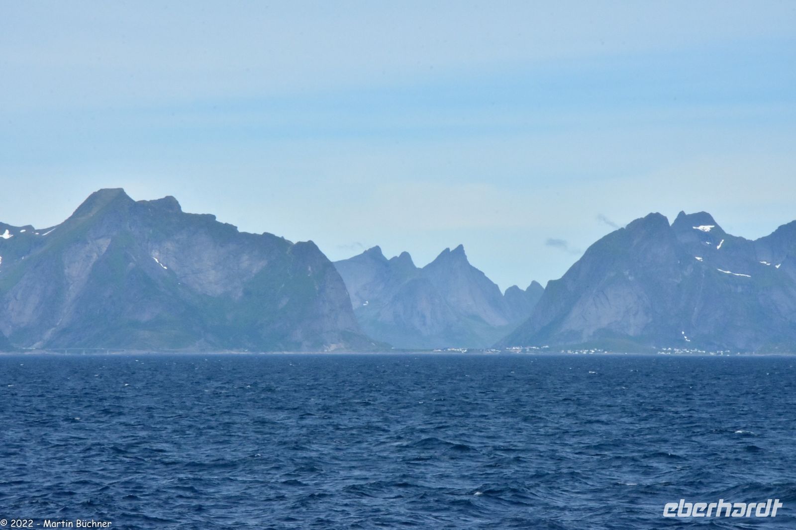 Wir erreichen die Inselgruppe der Vesterålen. Vom Festland trennt uns der Tjeldsund, der wiederum durch die Tjeldsund Hängebrücke überwunden wird. Die Vesterålen sind der deutlich größere Teil der vorgelagerten Inselarchipele. Hier liegen auch die höchsten Berge, weit über 1.200 Meter ragen sie aus dem Ozean empor.