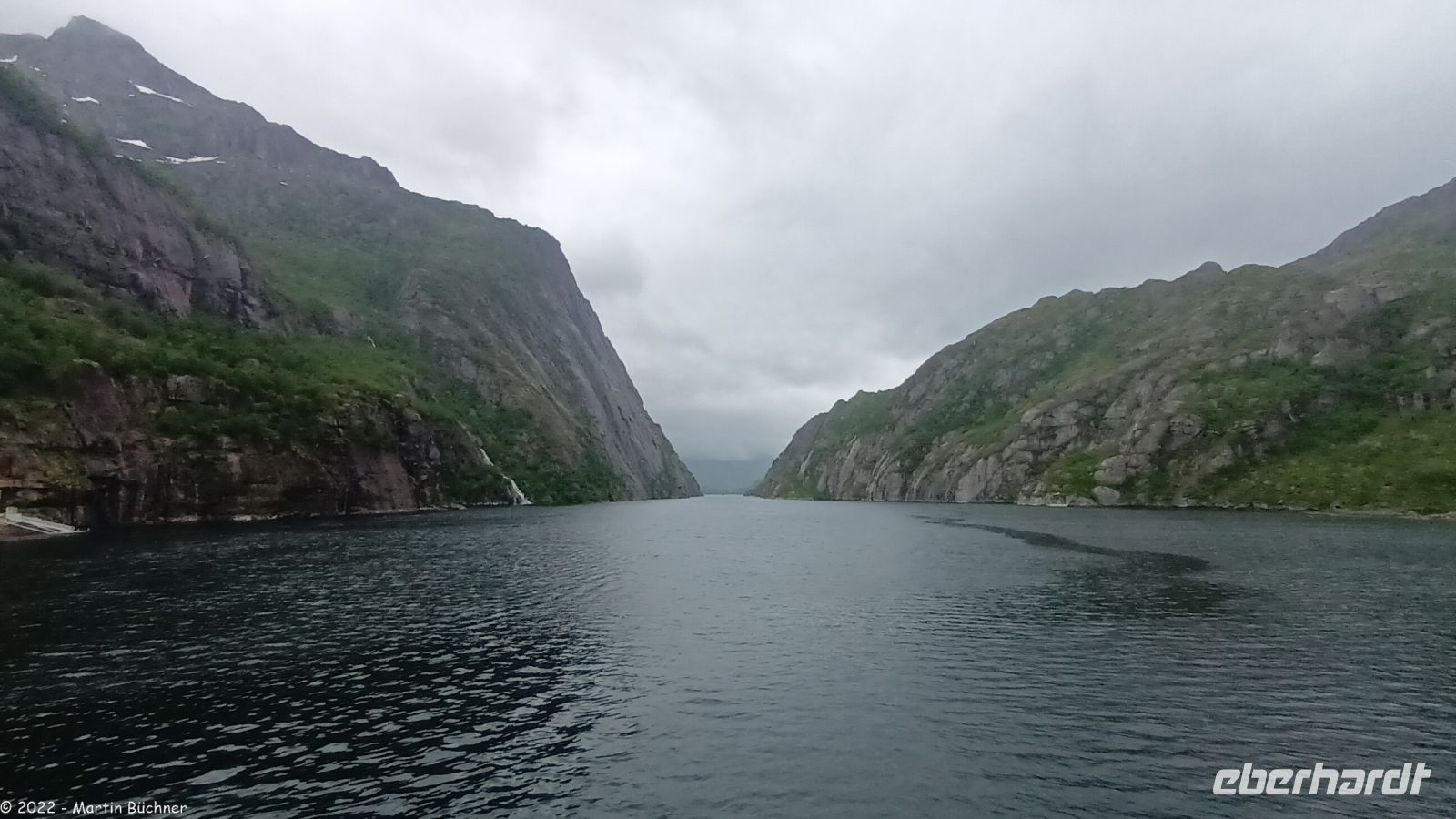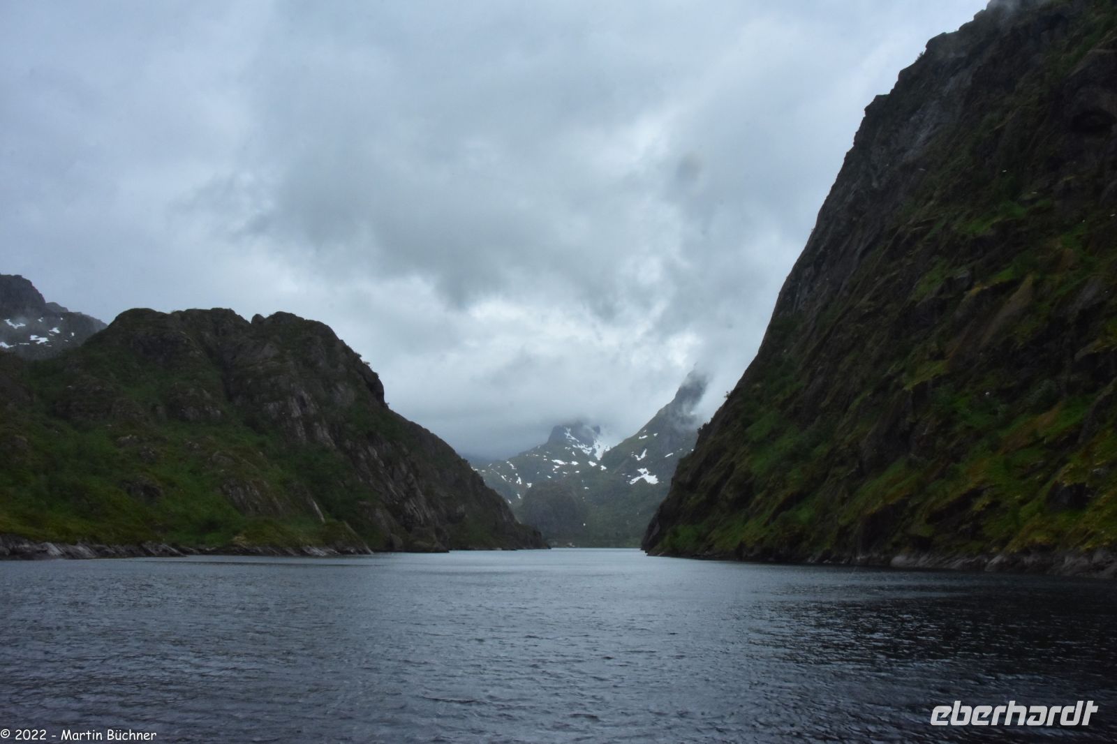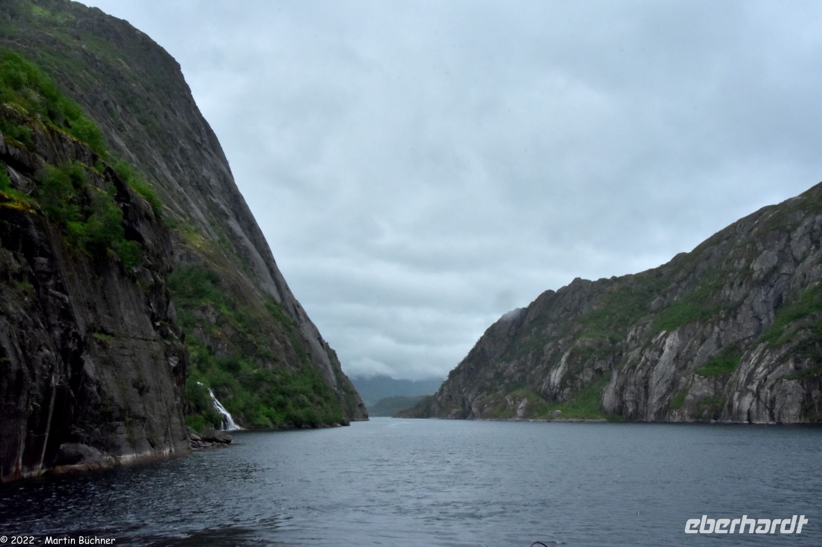 Höhepunkt ist die Einfahrt in den Trollfjord. Nicht die Länge ist es mit der er punkten kann, gerade einmal 1,2 km lang. Vielmehr die Einfahrt und die umliegende Bergwelt. Die Mündung ist gerade einmal 100 Meter weit, die Felswände an den Ufern über 300 Meter senkrecht, die umliegenden Bergspitzen weit über 1.000 Meter hoch. Man kann den Einschlag der Trollaxt in das Gebirge förmlich spüren.