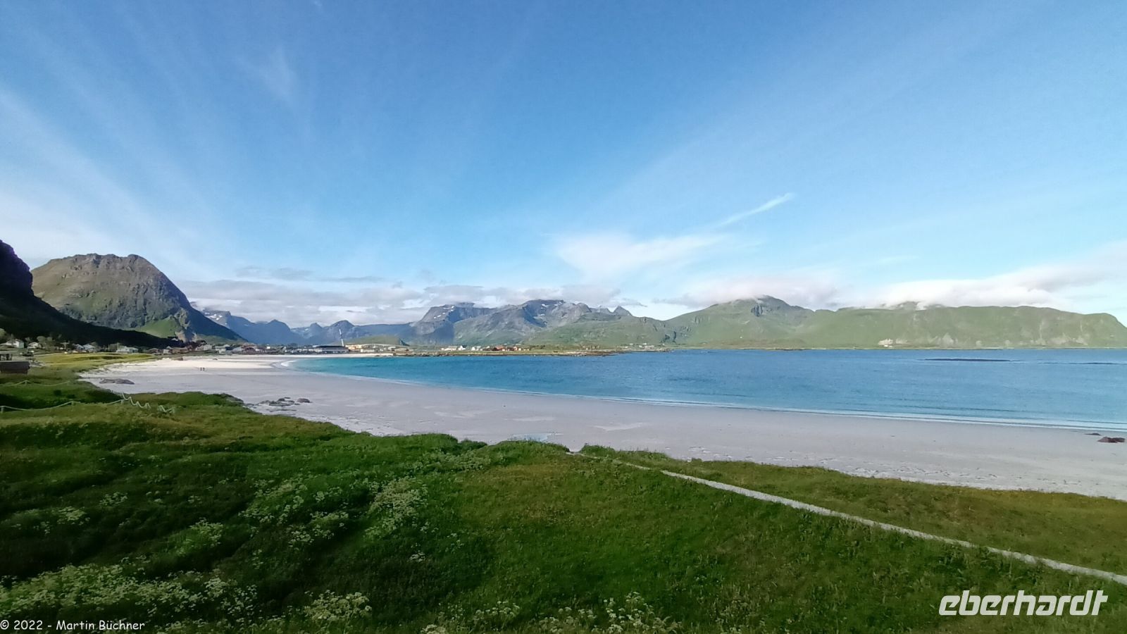 Das "Lofoten Thema" ist auch an diesem Tag noch nicht beendet. Wir fahren in den äußeren Südwesten der Lofoten. Bei Flakstad passieren wir den gewaltigen, kilometerlangen, weißen Sandstrand. Ein paar Palmen und die ganze Szenerie kann ohne Weiteres als Südsee oder Karibik gewertet werden. Die Temperaturen und die Sonne gibt es schon dafür.