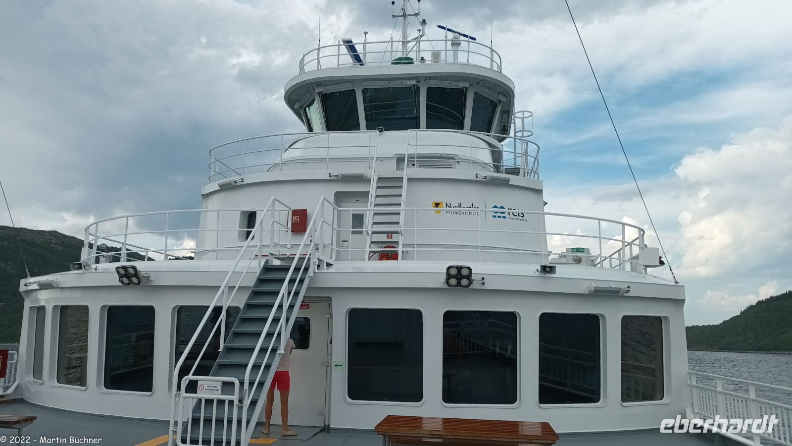 Uns erwartet eine technische Innovation: Futuristisch, dieselelektrisch, nahezu geräuschlos erwartet uns das Schiff Brim-Explorer, dass uns in den Raftsund und später in den Trollfjord bringt.