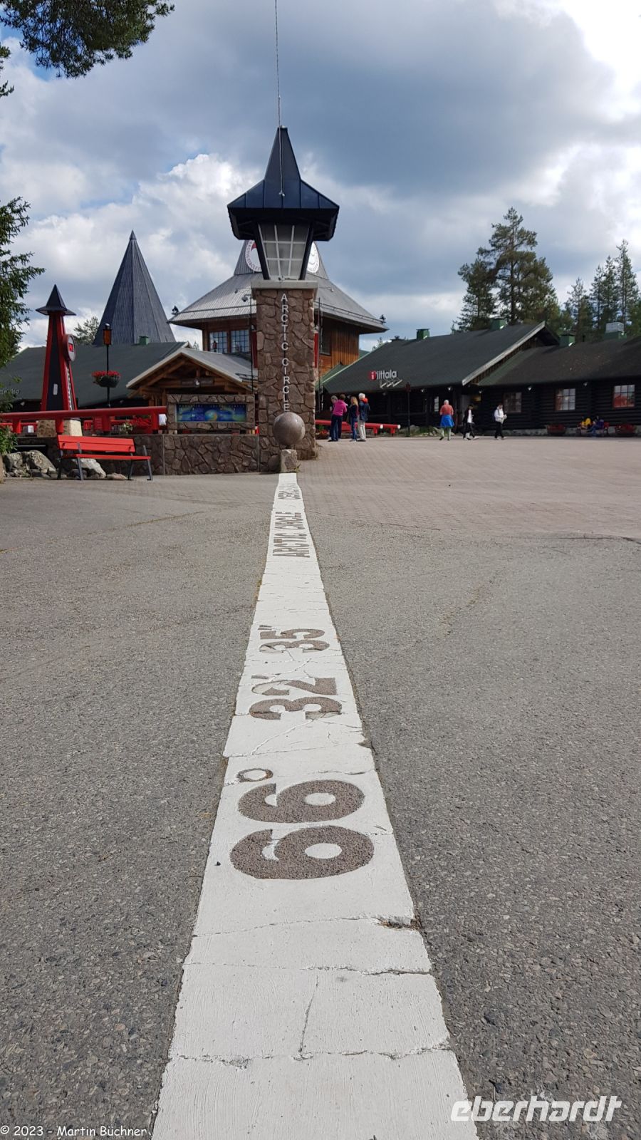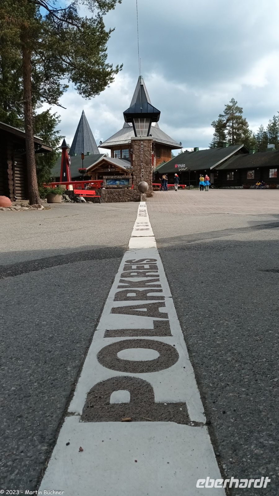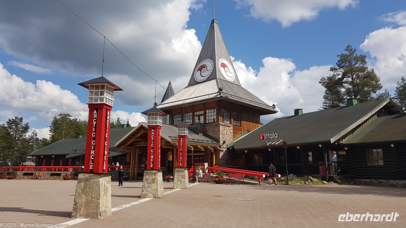 Nach kurzer Fahrt erreichen wir den Polarkreis. Bei einer kleinen Zeremonie wagen alle den Schritt über den Polarkreis, den Schritt in die nordische Arktis. Ganz passend kann natürlich der Weihnachtsmann besucht werden.