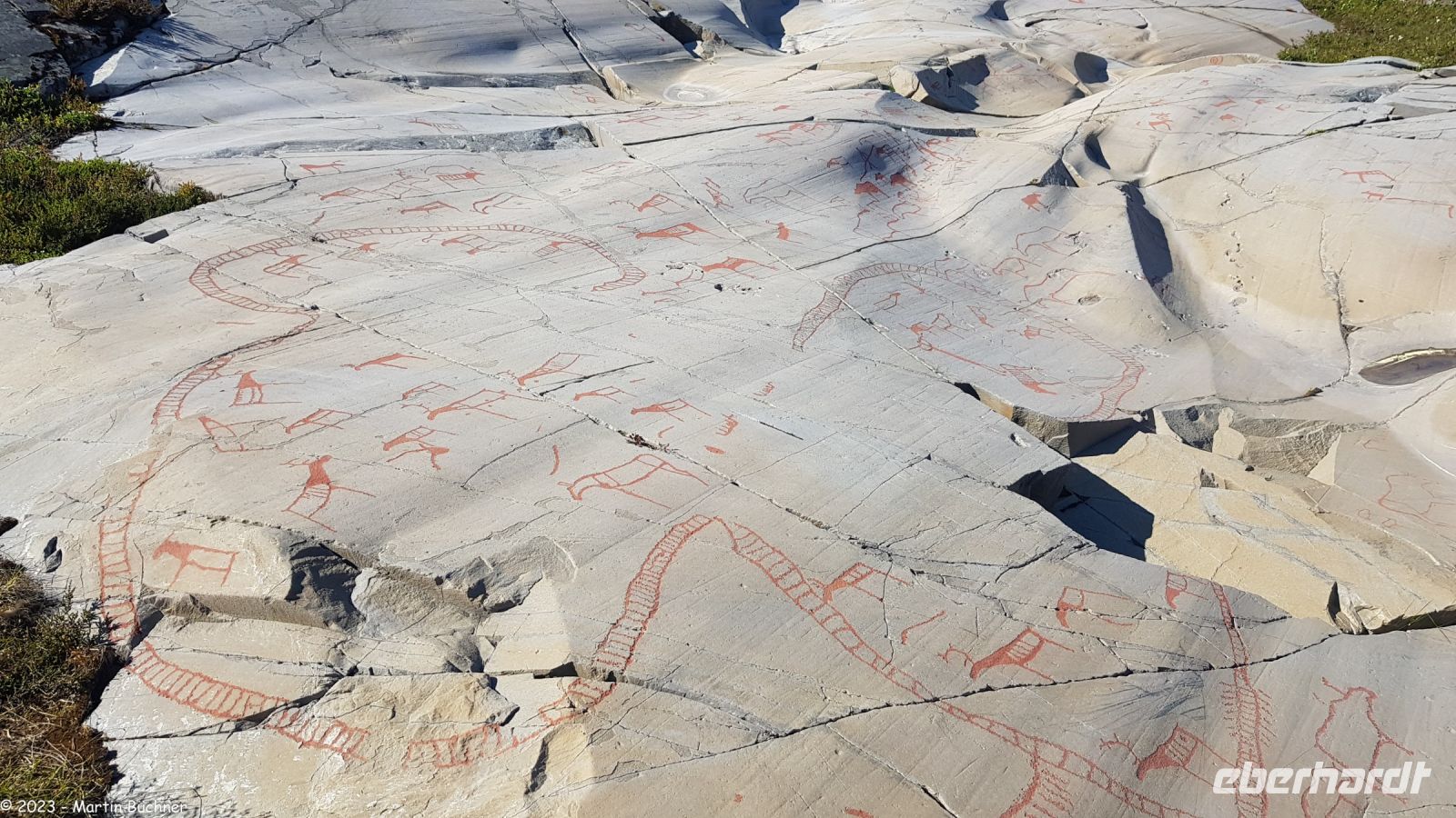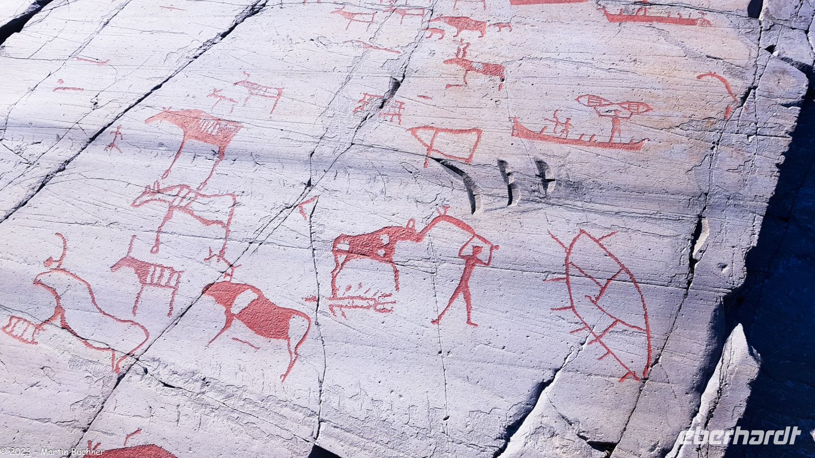 Wir verlassen die Insel Margerøya in Richtung Süden. Wir folgen dem Verlauf des Porsangerfjords bis nach Lakselv, unterwegs begegnen uns viele Rentiere auf der Straße. Über die Finnmarksvidda erreichen wir Alta am Altafjord. Wir besuchen die Felsritzungen von Alta, die zum UNESCO Weltkulturerbe gehören. Die ältesten Siedlungsspuren wurden auf über 10.000 Jahre datiert. Mit anderen Worten, als diese Felsritzungen schon 5.000 Jahre alt waren, wurden in Ägypten die Pyramiden gebaut. Bereits unmittelbar nach verschwinden des skandinavischen Eisschild siedelten hier bereits Menschen. Sie lebten sie von der Jagd und dem Fischfang. Die samische Kultur war ein wichtiger Schlüssel für die richtige Interpretation der Ritzungen. Einiges davon praktizieren die Samen heute noch.