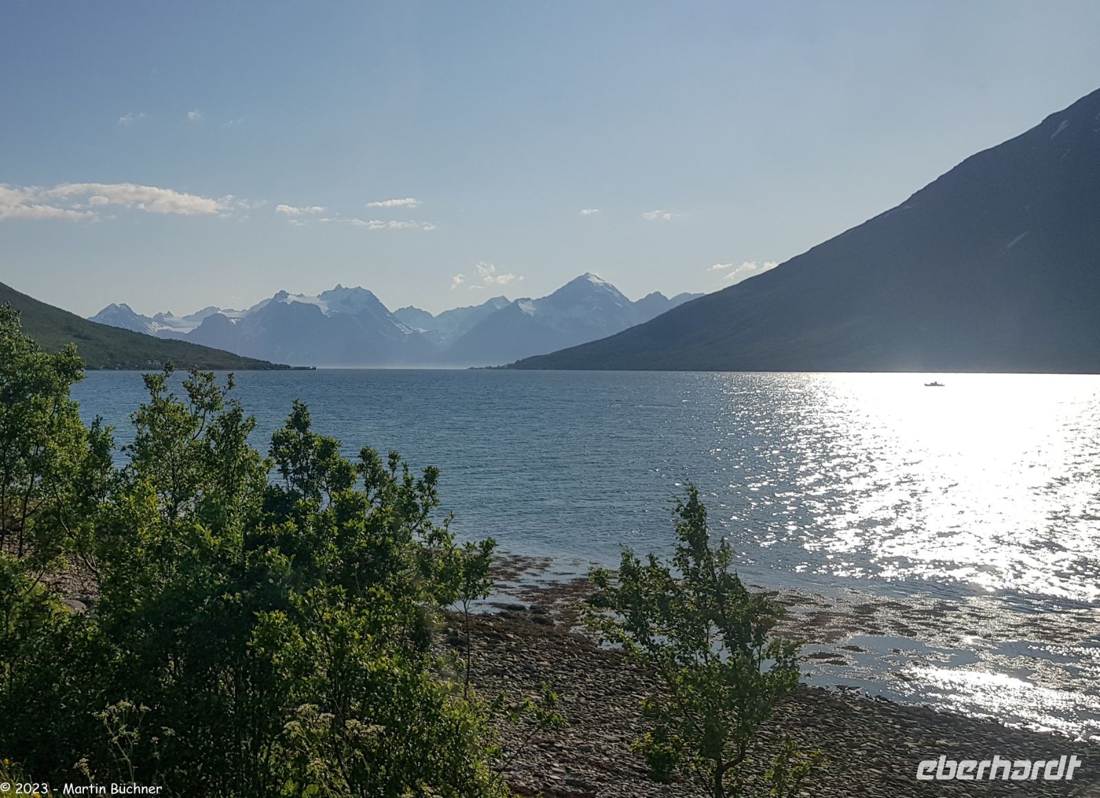 Über den Aussichtspunkt Gildetun/Kvænangen hoch über dem Fjord geht es in das traumhafte Lyngenfjord Gebiet. Die Lyngenalpen, im Sommer noch lang schneebedeckt, so auch in diesem Juni. An einigen Stellen befinden sich noch kleinere Gletscher, so wirkt die Szenerie bizarr schön, schroffe vermeintliche Hochgebirgswelten versunken im Meer.