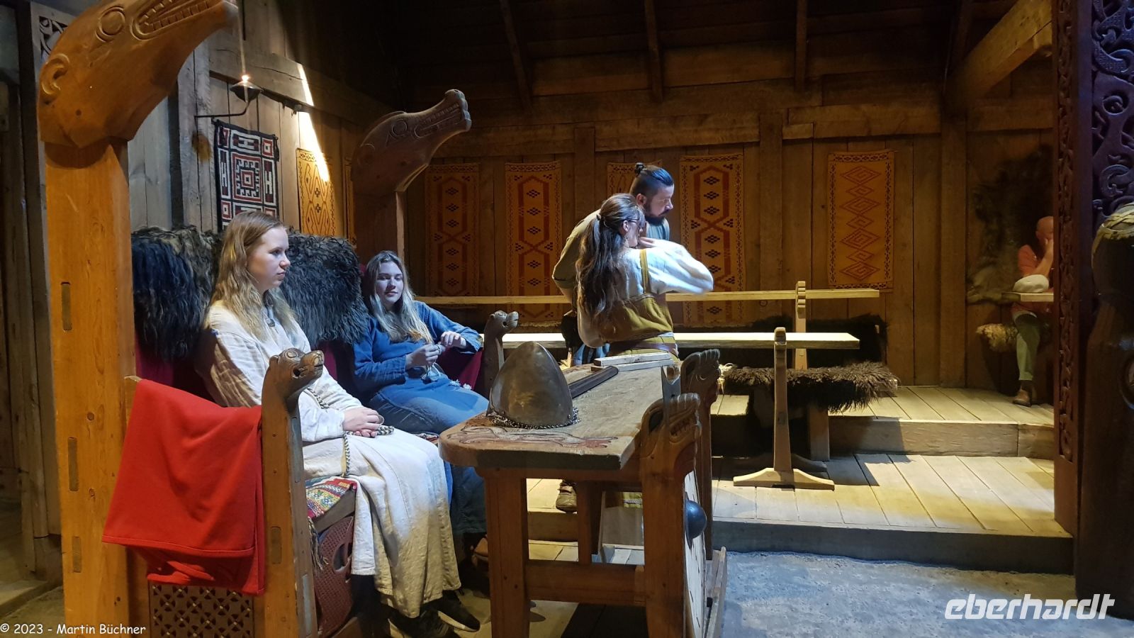 Höhepunkt ist eine deftige Wikingersuppe, die wir frisch über dem Feuer gekocht genießen dürfen. Unweit dieser mächtigen Siedlung liegt unser Hotel, heute im Stil traditioneller Rorbuer Hütten.