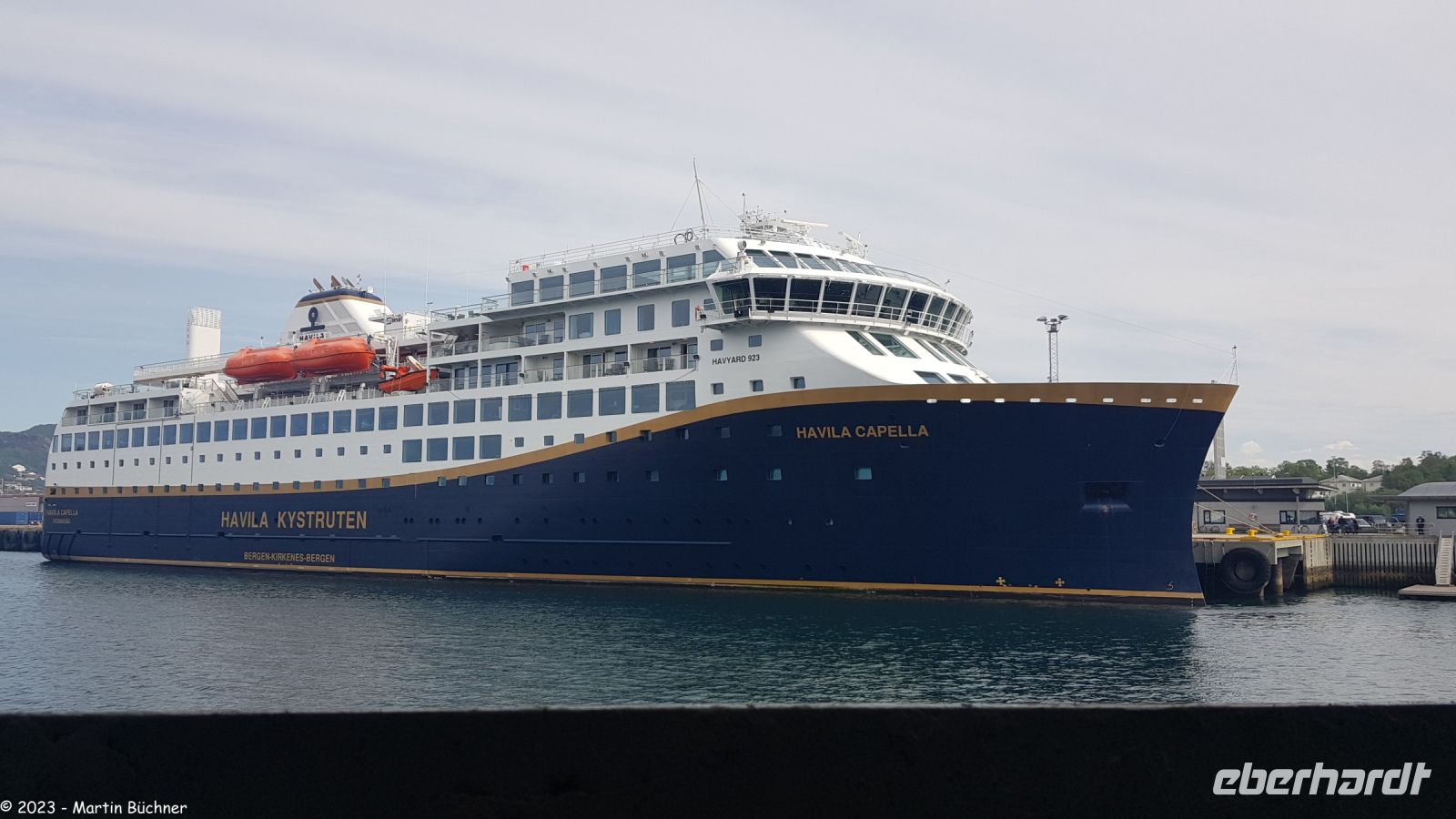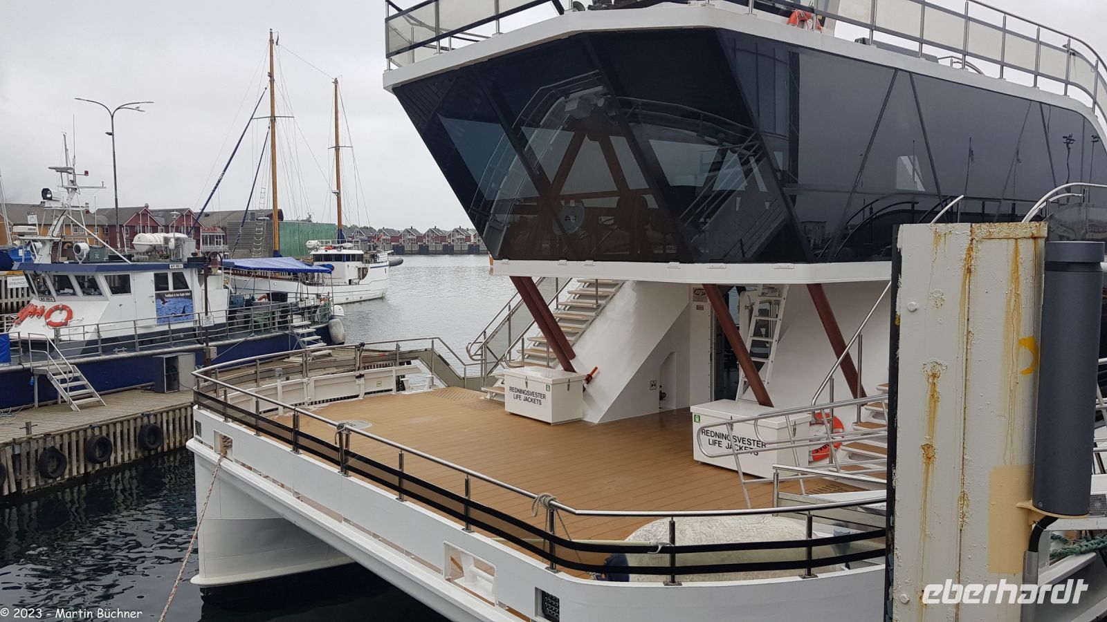 Uns erwartet eine technische Innovation: Futuristisch, dieselelektrisch, nahezu geräuschlos erwartet uns das Schiff Brim-Explorer, dass uns in den Raftsund und später in den Trollfjord bringt.