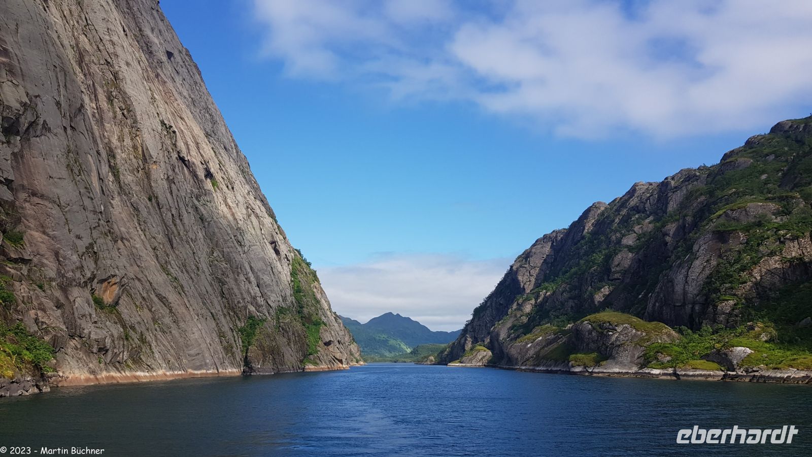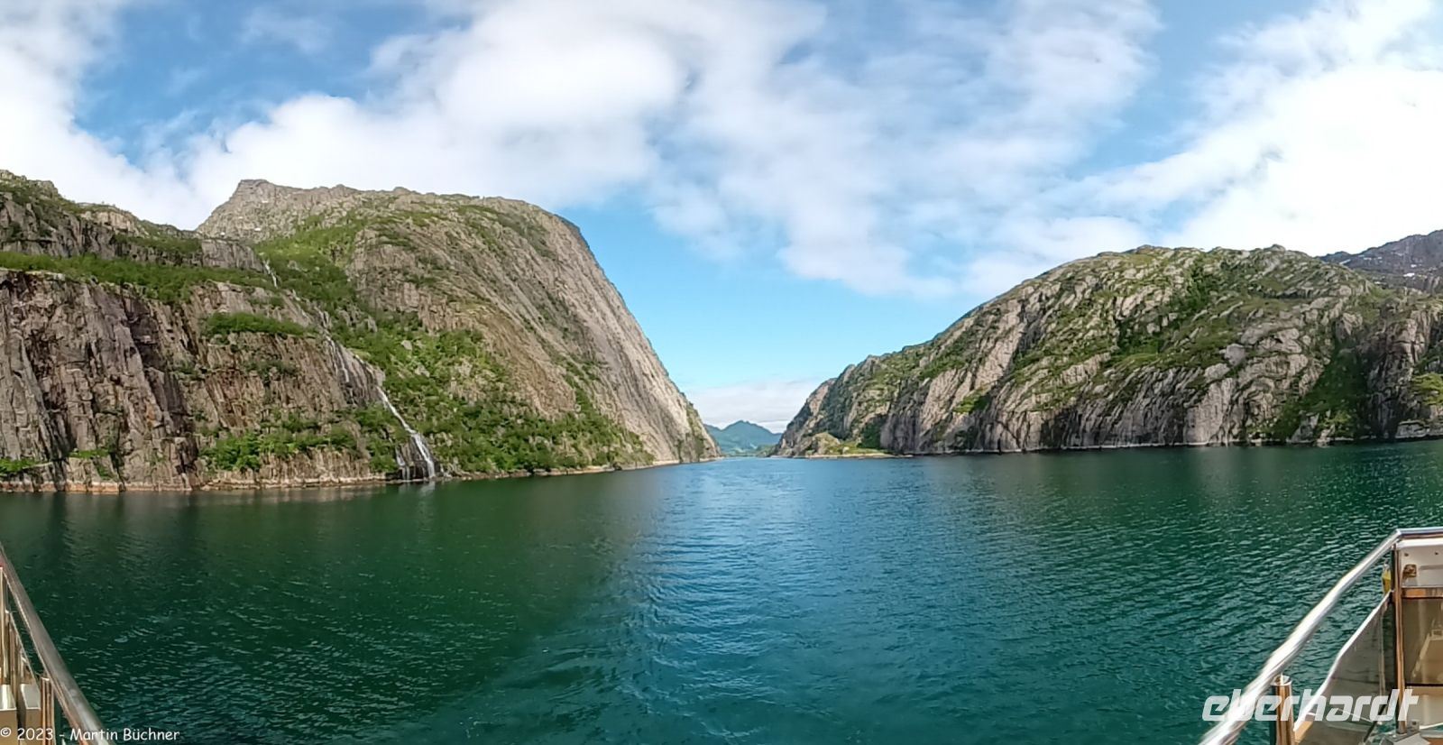 Höhepunkt ist die Einfahrt in den Trollfjord. Nicht die Länge ist es mit der er punkten kann, gerade einmal 1,2 km lang. Vielmehr die Einfahrt und die umliegende Bergwelt. Die Mündung ist gerade einmal 100 Meter weit, die Felswände an den Ufern über 300 Meter senkrecht, die umliegenden Bergspitzen weit über 1.000 Meter hoch. Man kann den Einschlag der Trollaxt in das Gebirge förmlich spüren.