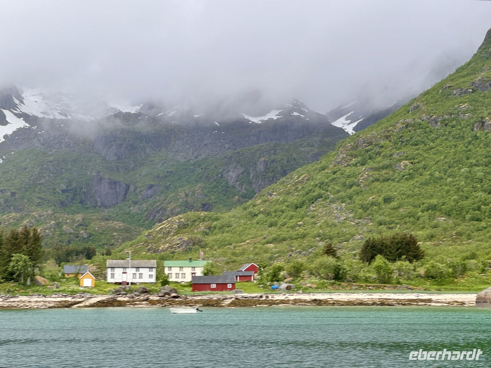 Nach einer geruhsamen Nacht in unseren Fischerhütten erwartet uns heute ein abwechslungsreicher Tag auf den Lofoten. Nach dem Frühstück begeben wir uns gemeinsam auf den Weg Richtung Inselhauptstadt – Svolvær ist der Ausgangspunkt für unsere mehrstündige Tour mit dem Brim-Hybridschiff zu einem der bekanntesten Fjorde Norwegens, dem Trollfjord. Am Hafen angekommen erwartet uns das Ausflugsboot schon und nach einer kurzen Sicherheitseinweisung begeben wir uns auf eine Fahrt in eine andere Welt. Zuerst schippert unser Boot, auf der Suche nach Seeadlern, zwischen kleinen Inseln hindurch. Und wir haben tatsächlich Glück und können einige der majestätischen Greifvögel sichten. Dann geht es für uns weiter, ein kleines Stück durch den 20 Kilometer langen Raftsund. Dieser verläuft zwischen den Lofoten und Vesterålen und gilt als eine der schönsten Wasserstraßen in Norwegen. Der Trollfjord, unser nächstes Ziel, geht direkt vom Raftsund ab und gilt als eine der spektakulärsten Natursehenswürdigkeiten im Land. Ein wesentlicher Grund für seine Bekanntheit sind seine Ausmaße. Auch wenn der Trollfjord nicht zu den größten Fjorden Norwegens zählt, so ist seine Erscheinung doch recht imposant. Denn die Einfahrt in den Fjord ist gerade einmal hundert Meter breit. Umringt von steil aufragenden Bergen, die unmittelbar bis auf über 1000 Meter fast senkrecht aus dem Wasser steigen, kommen wir aus dem Staunen gar nicht mehr heraus. Nach diesem tollen Erlebnis erreichen wir am frühen Nachmittag wieder den Hafen von Svolvær, wo unser Fahrer Uwe mit seinem Bus schon auf uns wartet. Man war nicht auf den Lofoten, wenn man dem berühmten Wikingermuseum in Borg keinen Besuch abgestattet hat. Und so führt und unser nächster Weg genau dort hin, denn wer nach Norwegen kommt, kommt natürlich auch nicht an der Geschichte der Wikinger vorbei. Hier auf den Lofoten befand sich tatsächlich auch einer ihrer Häuptlingssitze in Nord-Norwegen. In dem Nachbau des größten Langhauses der gesamten Wikingerzeit befindet sich heute das Museum. Hier erhalten wir umfangreiche und interessante Einblicke in die Zeit der Wikinger und erfahren zudem, dass an unserer Vorstellung von Wikingern mit Metallhelmen und Hörnern nicht viel dran ist. Anschließend erwartet uns ein deftiger Lammeintopf, den wir uns sichtlich schmecken lassen. Vom Eintopf gestärkt bleibt dann noch etwas Zeit um auf eigene Faust in diese faszinierende vergangene Welt einzutauchen, bevor wir unsere Panoramafahrt über die Inseln fortsetzen. Unser letztes Ziel an diesem Tag ist der Strand von Haukland, der wohl jedem von uns ein bisschen die Sprache verschlägt. Weißer Sand und türkis-funkelndes Wasser lassen ihn wirklich karibisch aussehen. Einzig die Kokosnusspalmen fehlen. Einmal tief durchatmen und die Meeresluft genießen, bevor wir unsere Fahrt zurück zum Hotel antreten. Eine weitere Nacht dürfen wir in den gemütlichen Rorbuer verbringen, bevor wir am nächsten Tag das Inselreich der Lofoten leider auch schon wieder verlassen müssen.