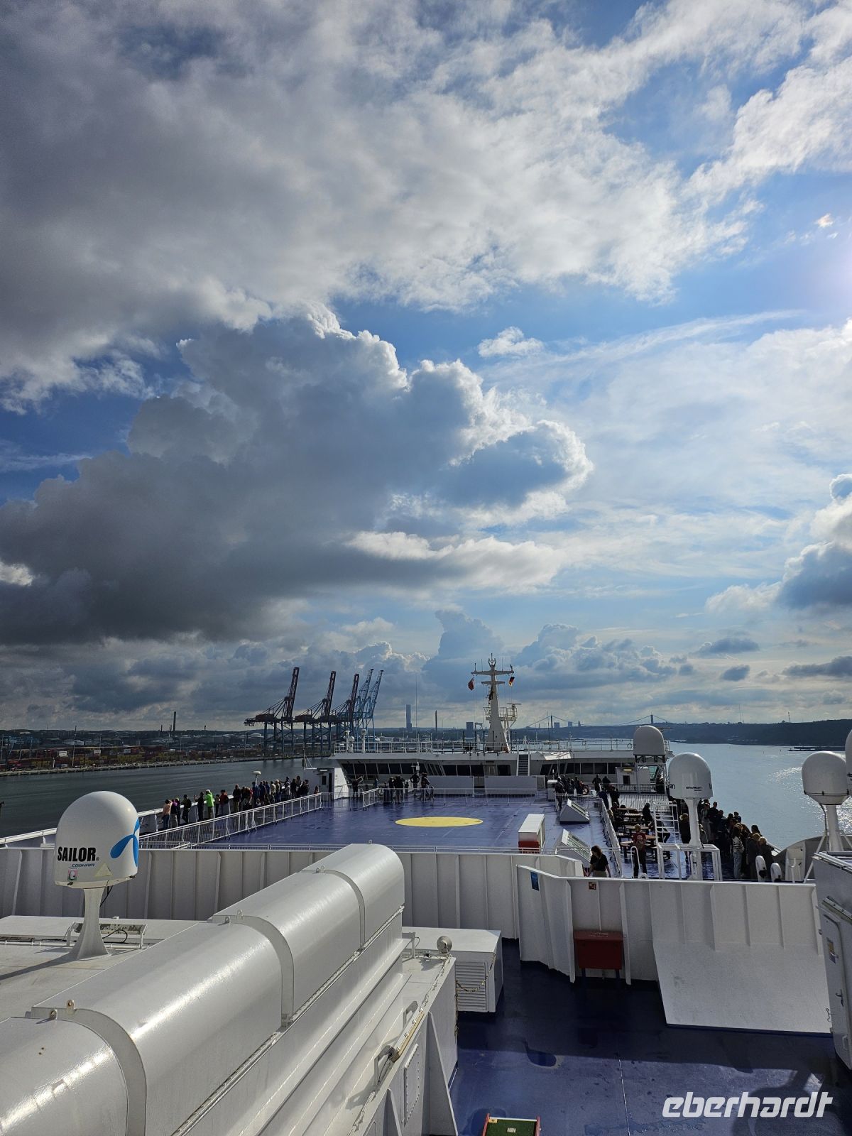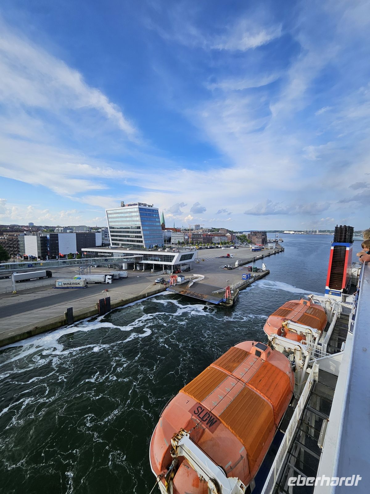 Um 18:45 Uhr legen wir ab, und mit dem Start unserer Reise breitet sich ein Gefühl von Aufregung und Vorfreude aus. Auf dem Schiff erwartet uns ein abwechslungsreiches Buffet, das uns mit skandinavischen Spezialitäten verwöhnt. So genießen wir einen entspannten ersten Abend in geselliger Runde, bevor wir uns in unsere Kabinen zurückziehen. Die Reise hat begonnen, und das Abenteuer ruft!