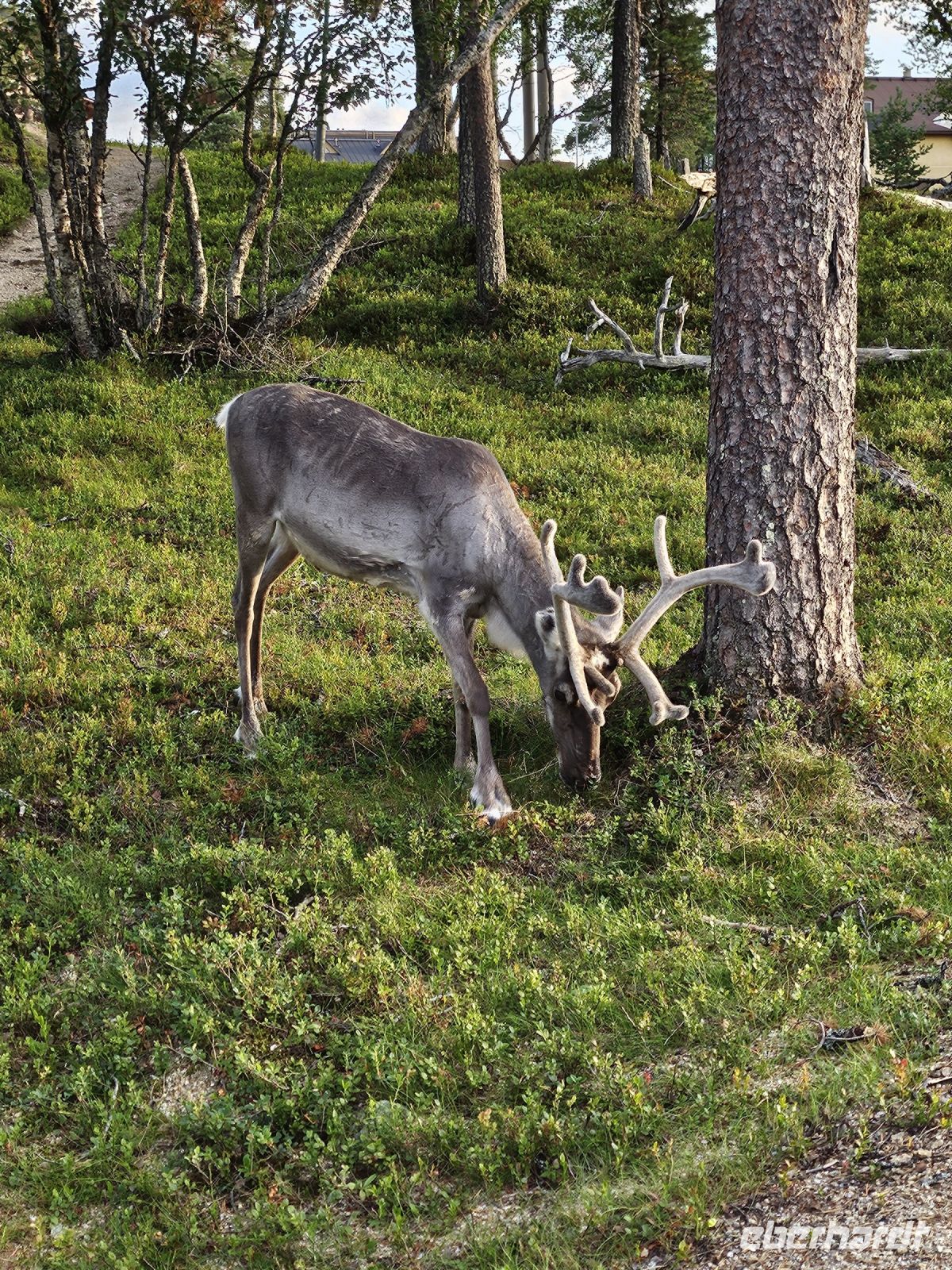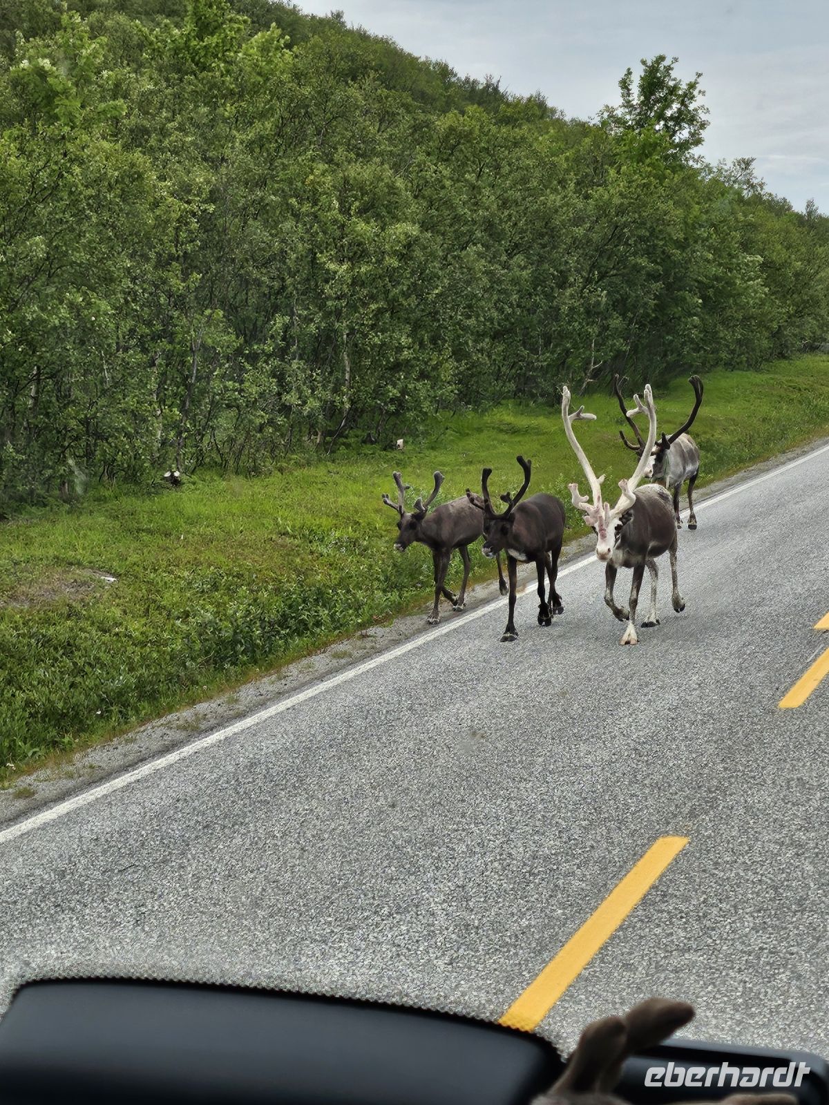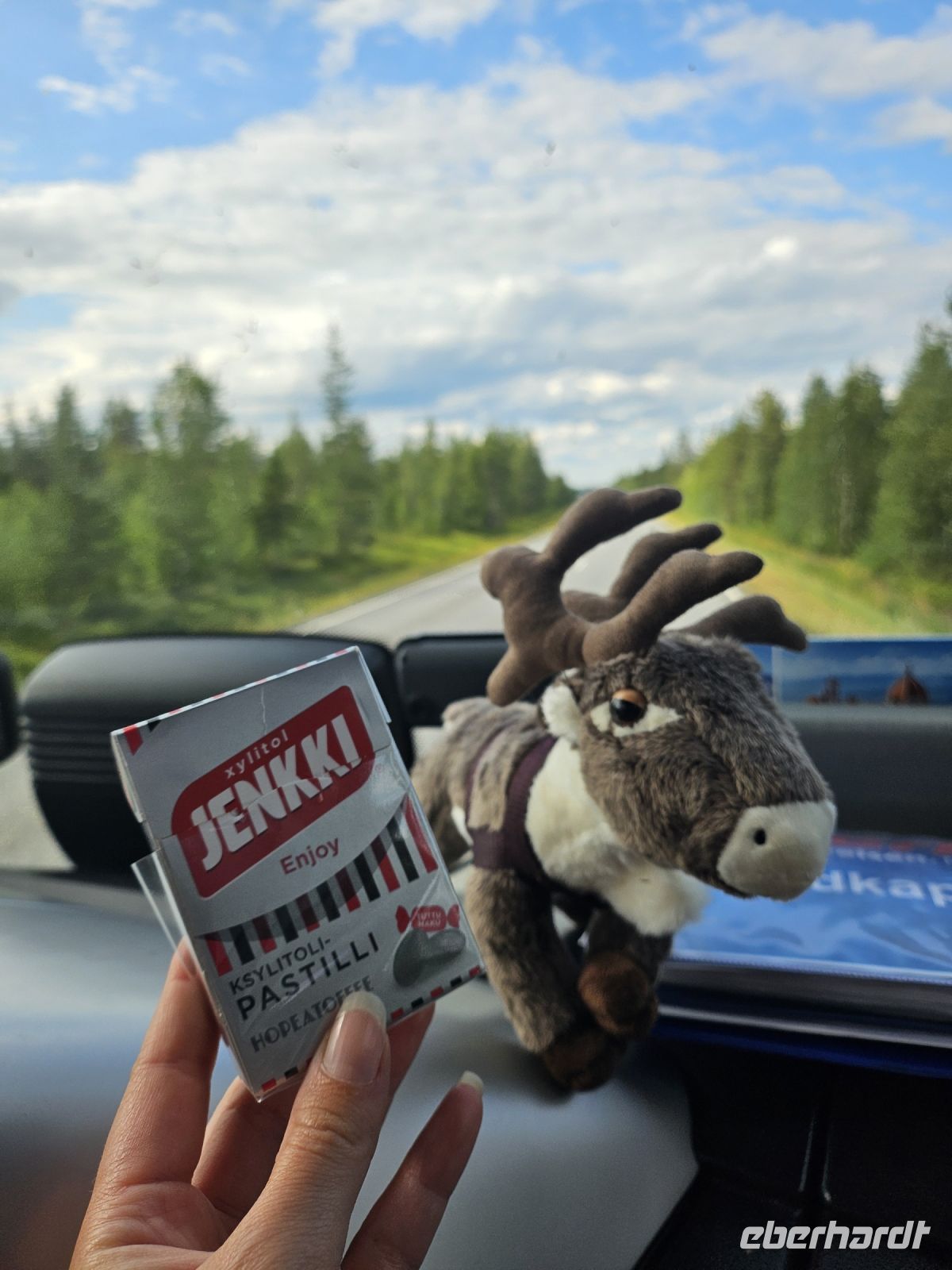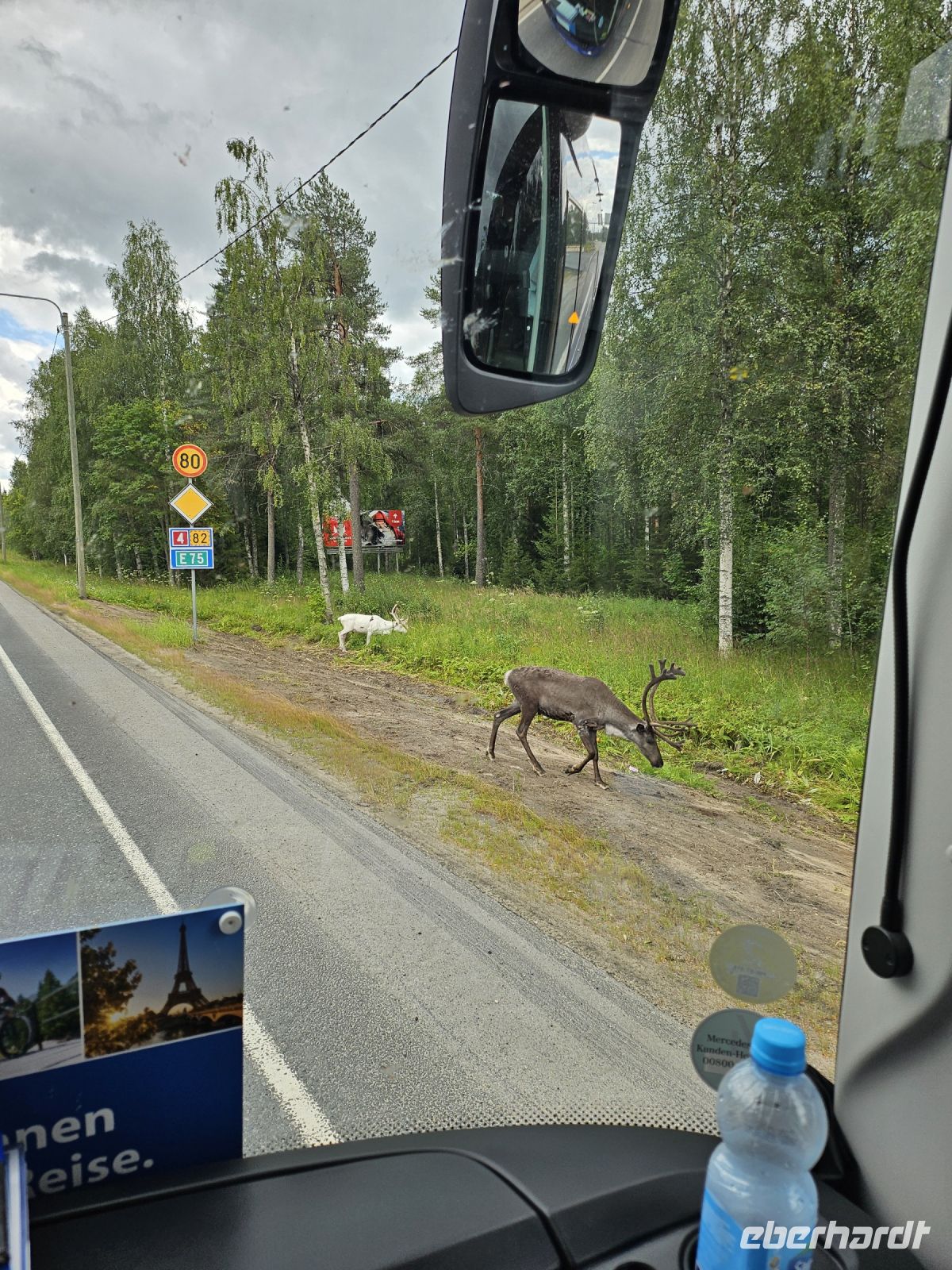 Weiter geht die Reise nach Saariselkä, doch ganz ungehindert kommen wir nicht vorwärts. Während Mariele die ersten Rentiere noch freudig über das Mikrofon ankündigt, erscheint dieses Unterfangen nach einigen Kilometern überflüssig, denn es sind einfach zu viele! Sie stehen auf der Straße, am Waldesrand und marschieren unbeeindruckt neben dem Bus entlang. Staunend haben wir auch erfahren, dass es in Finnland keine wilden Rentiere gibt. Sie tragen alle Marken und Halsbänder und gehören fast ausschließlich den Samen, einem Urvolk, dem wir die kommenden Tage viel begegnen werden.