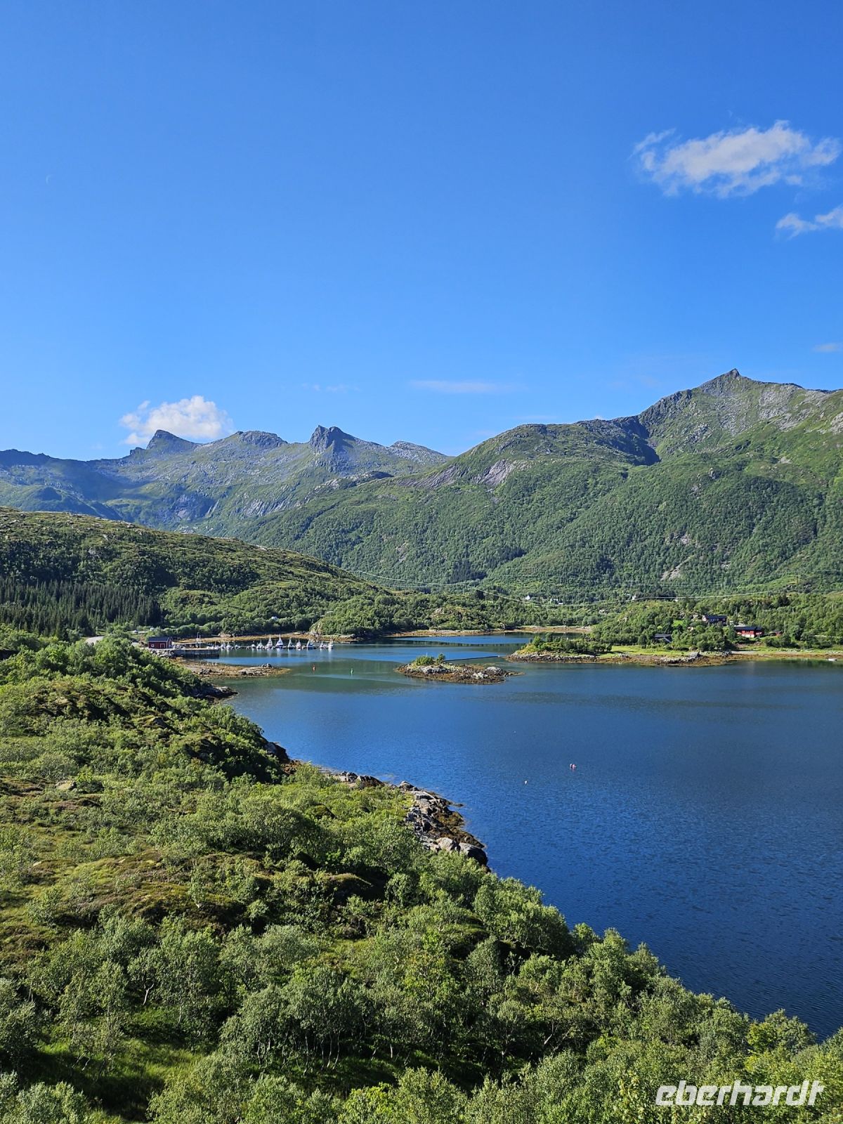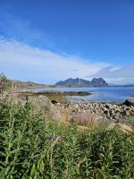 Vorher halten wir noch am Sami-Zeltshop (Kote wäre das bessere Wort), um unseren Lieben für Zuhause etwas Elchsalami, Trolle oder Socken aus Rentierwolle mitzubringen. Ein kurzer Stopp noch in der Nähe von Narvik, das im zweiten Weltkrieg durch die Schlacht traurige Berühmtheit erlangt und weiter entlang der Fjorde und immer höher werdenden Berge zieht uns unser Weg zur berühmten Inselgruppe. Und wir fragen uns: werden die Lofoten wohl unseren Erwartungen standhalten? Sind sie wirklich so atemberaubend schön, wie wir es von den Bildern kennen? Die Antwort erhalten wir bereits kurz nach dem Verlassen des Festlands: JAAAA! Besser als jedes Foto, so viel strahlender und farbenfroher zeigt sich die Inselgruppe, die aus 80 Inseln besteht und nach der "Luchspfote" benannt ist. Mit jedem Kilometer, den wir mehr in dieses Inselreich vordringen, wird unser Staunen größer. Bei herrlichem Sonnenschein machen wir eine Pause am Strand von Svolvær und Mariele bereitet mit tatkräftiger Unterstützung ein Picknick vor. Es gibt Brote mit Rekeost (Garnelenschmelzkäse) und Brunost (braunem, karamellisierten Käse), Fiskekaker (Fischbuletten) sowie typische Boller (Milchbrötchen) und dazu Preiselbeer-Schorle. Lecker und so authentisch, dass wir uns fast wie echte Norweger fühlen.
