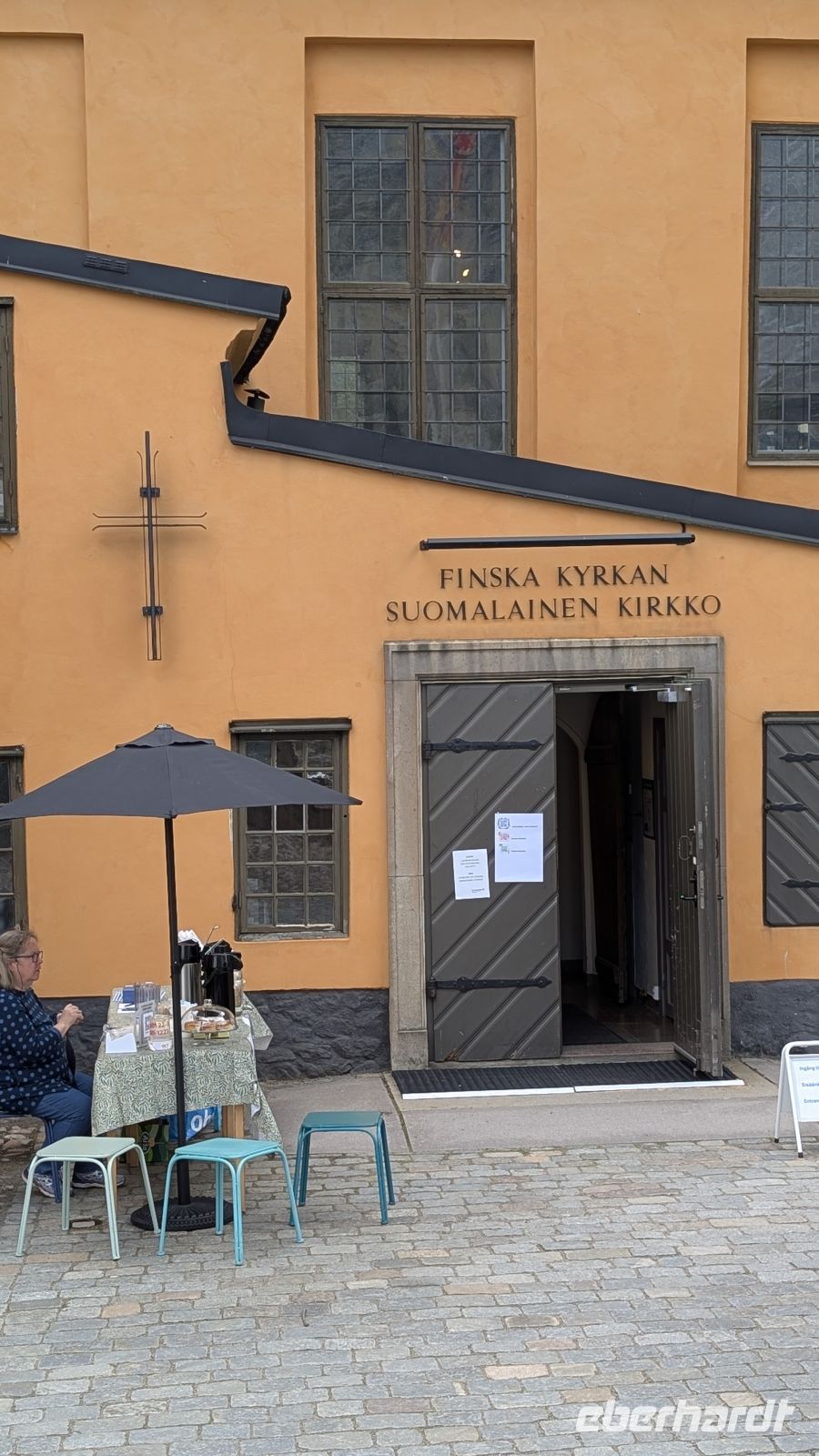 Das hieß, zuerst nur eine kleine Fahrt, hinauf zur Masthuggetkirche mit herrlichem Ausblick über Göteborg. Die Kirche konnten wir nur kurz besichtigen, der Pastor meinte, wir sollten vorher das Schild an der Eingangstür lesen. Da stand nämlich Begräbnins drauf und Funerl Service, was soviel bedeutet, wie „Besucher momentan nicht erwünscht.
