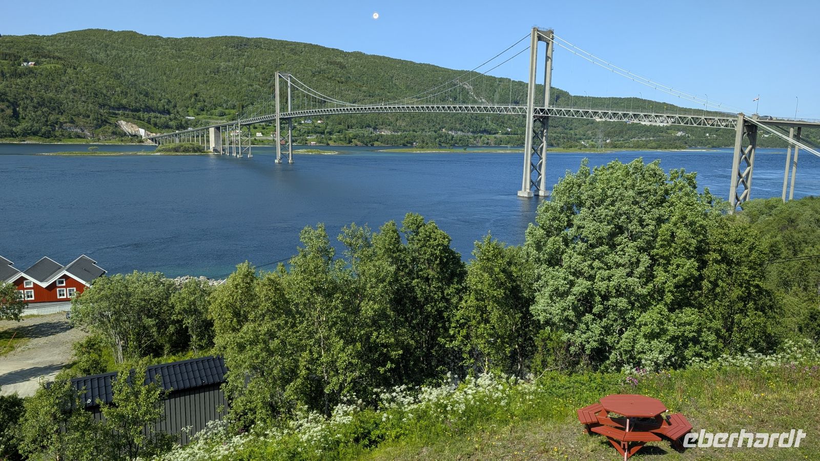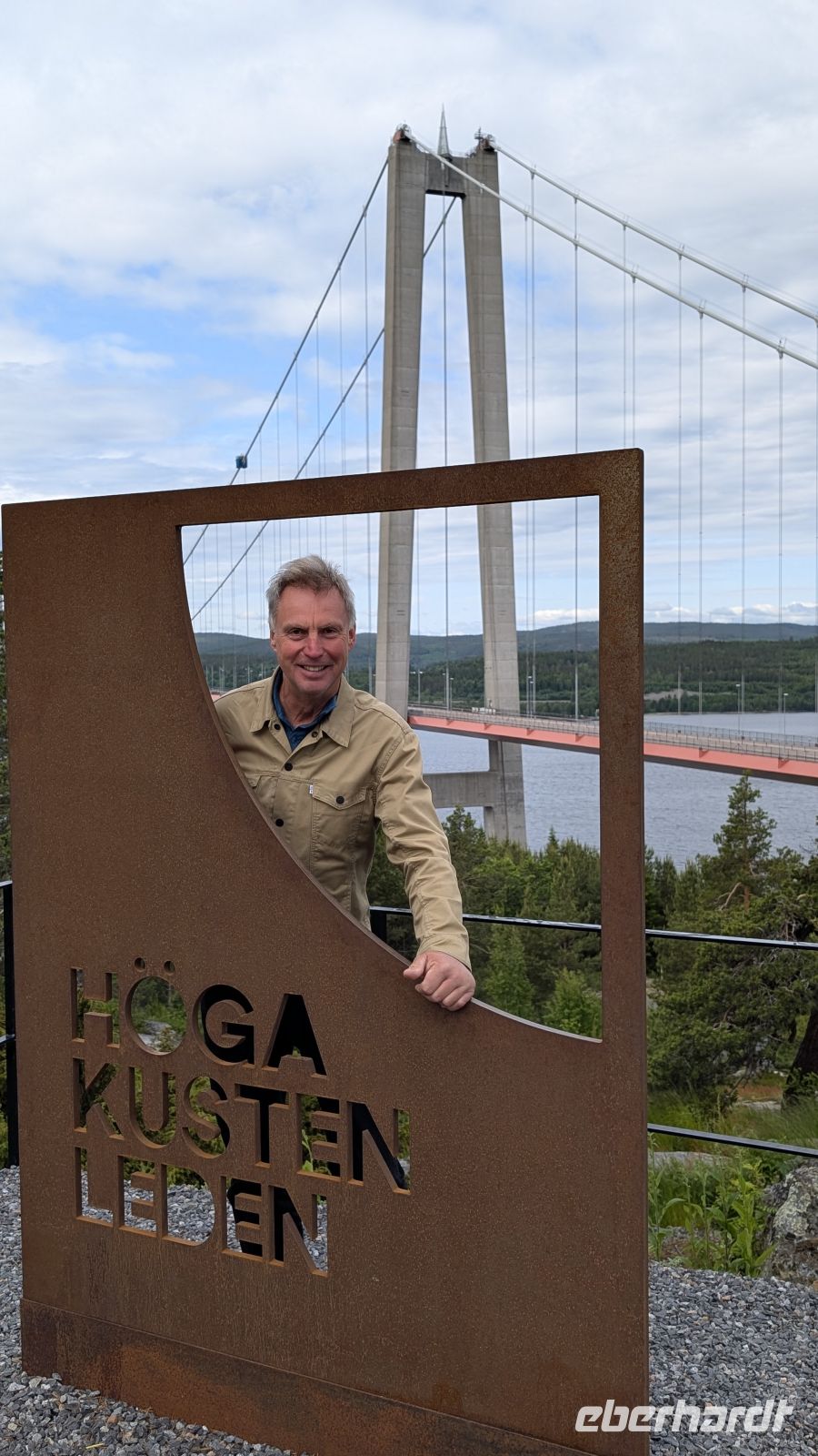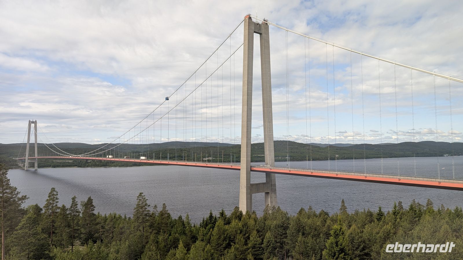 Die Högakusten-Brücke selbst bildet den Höhepunkt dieses Abschnittes. Mit fast 2km Länge, 40m Höhe und 18m Breite, mit 4 Fahrspuren und eine Brückenspannweite von 1200m ist sie die größte Seilbrücke der Welt. Dieses imposante Bauwerk verlangte natürlich einen speziellen Halt am Rastplatz mit bestem Blick auf die Brücke.