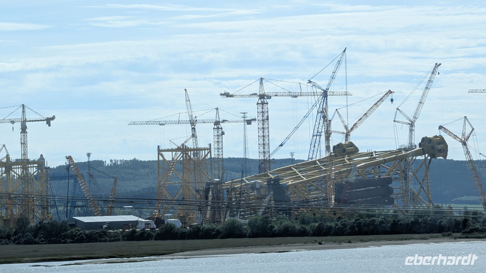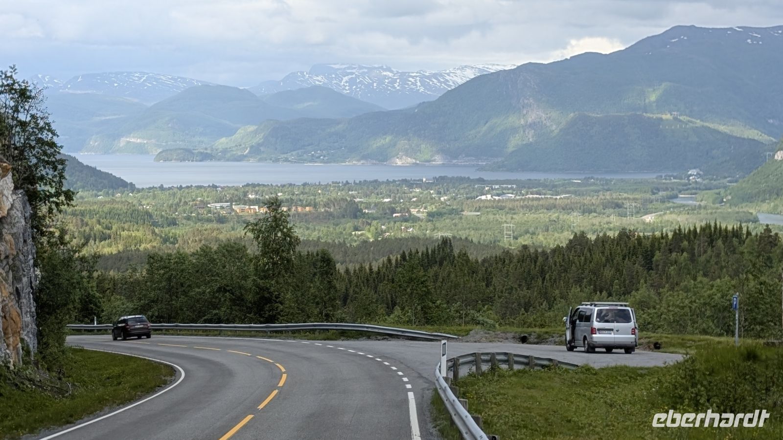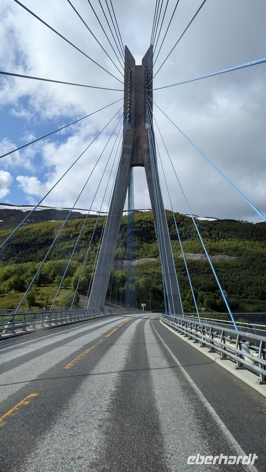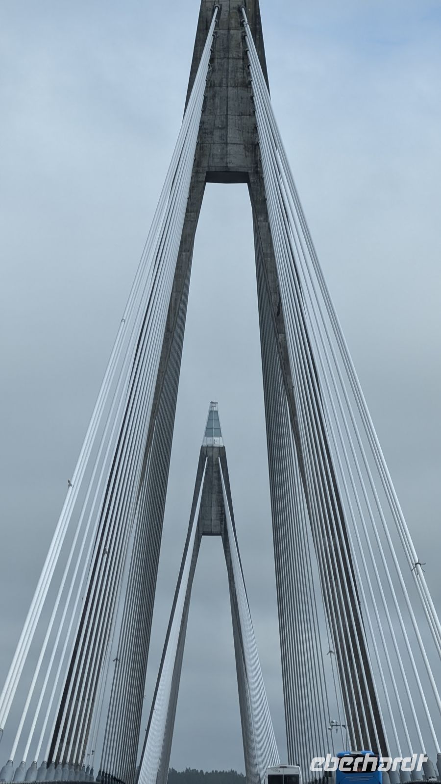 Die Högakusten-Brücke selbst bildet den Höhepunkt dieses Abschnittes. Mit fast 2km Länge, 40m Höhe und 18m Breite, mit 4 Fahrspuren und eine Brückenspannweite von 1200m ist sie die größte Seilbrücke der Welt. Dieses imposante Bauwerk verlangte natürlich einen speziellen Halt am Rastplatz mit bestem Blick auf die Brücke.