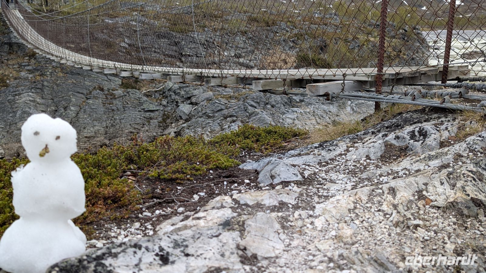 Der kleine Schneemann in Lappland an der Hängebrücke