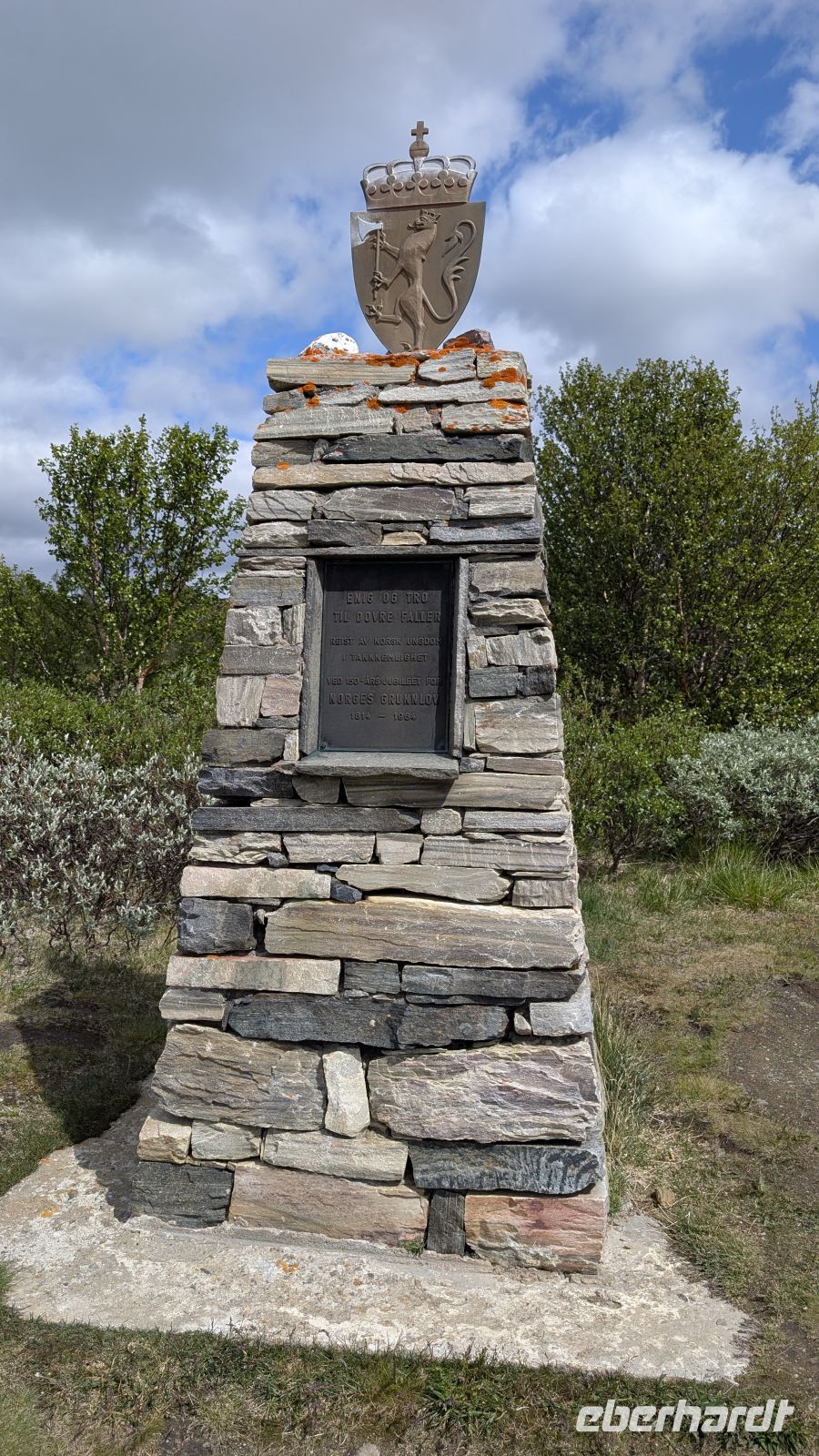 Die umherschweifenden wilden Moschusochsen bekamen wir leider nicht zu Gesicht. Dafür das Erinnerungsdenkmal an 1814, den Gunnarlovsvarden und den Dovre Gubben, den Alten vom Dovre Fjell und König der Trolle.