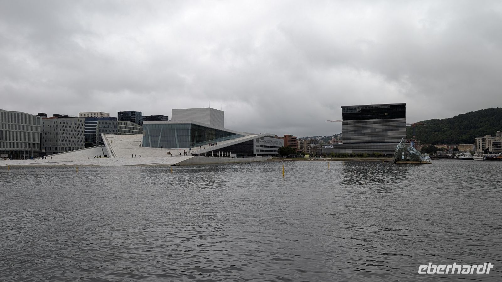 Der Eiskristall, von einer italienischen Künstlerin entworfen, im Wert von 2 Millionen Euro, steht vor dem mit Carraramarmor gebauten Opernhaus und dem „gebeugten“ Munch-Museum mitten im Oslofjord.