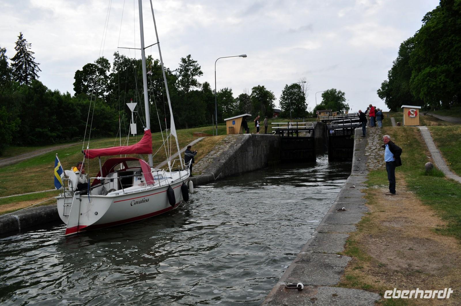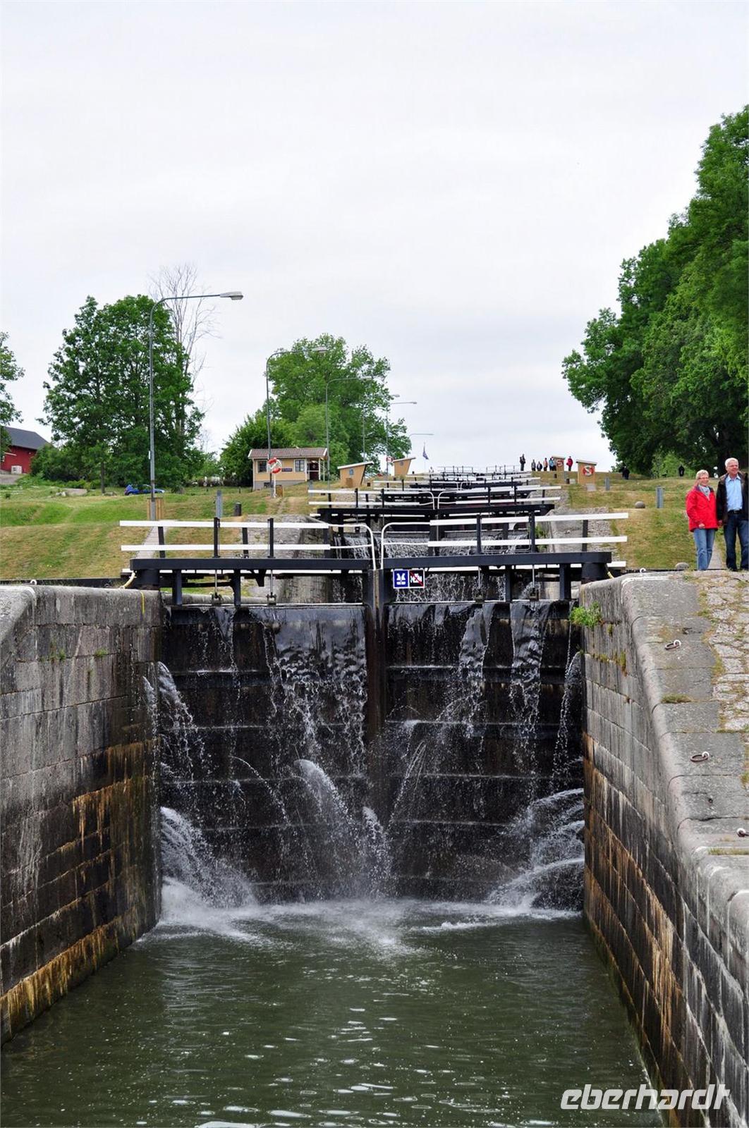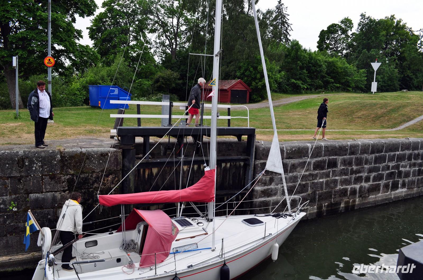 Für die Technik-Interessierten folgt ein Zwischenstop an der Carl-Johann Schleuse bei Berg am Götakanal. Die 7-Kammern-Schleuse fasziniert alle, erst recht, da wir sie durch ein Segelboot in Aktion erleben dürfen.
