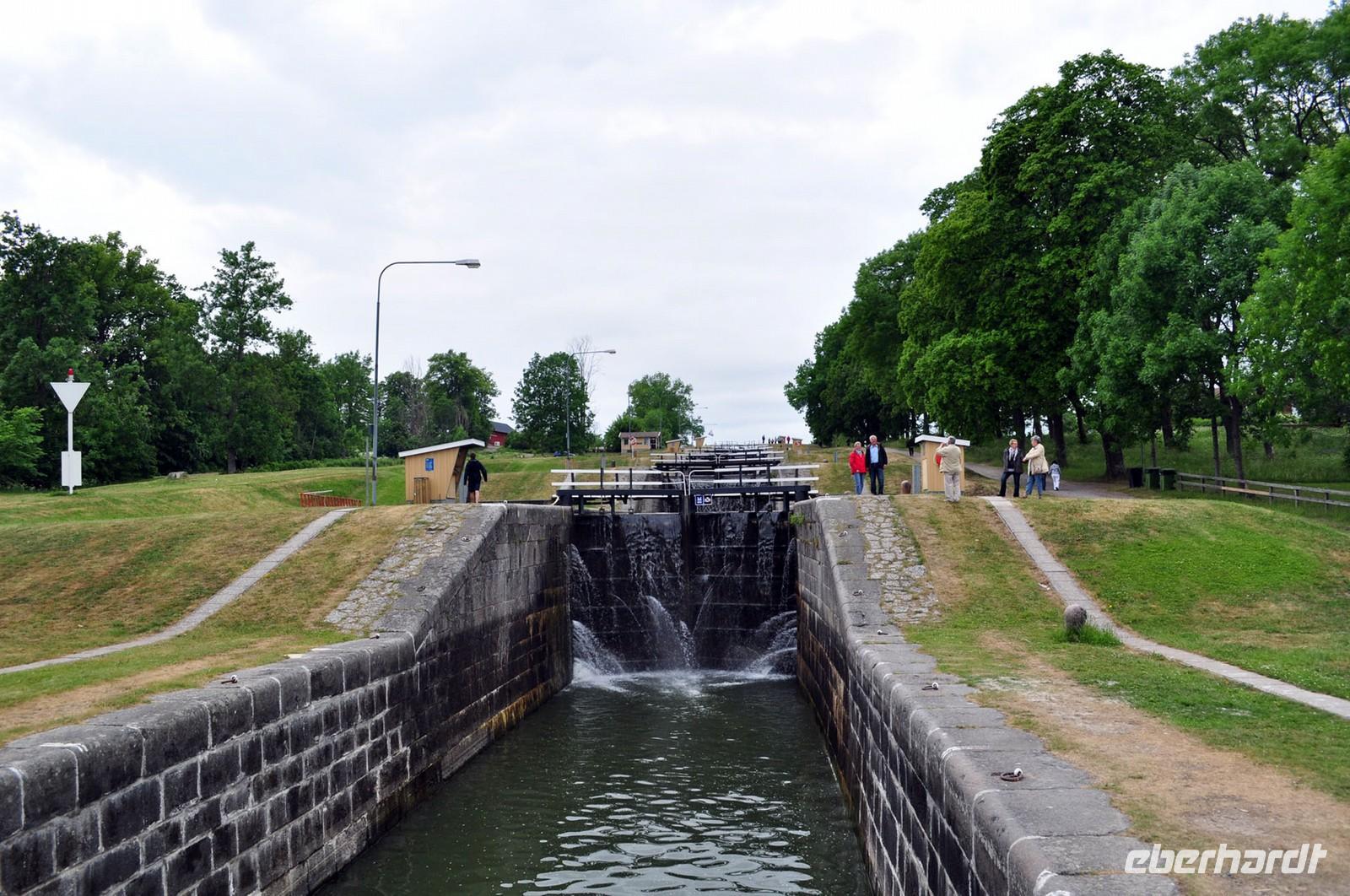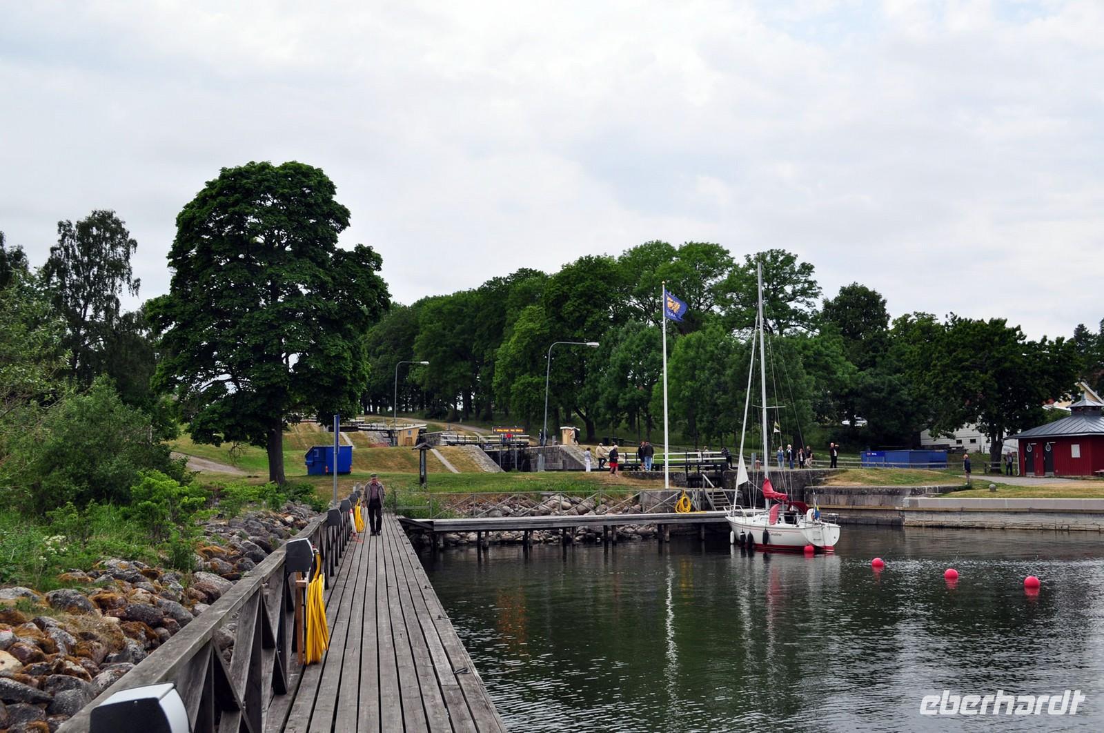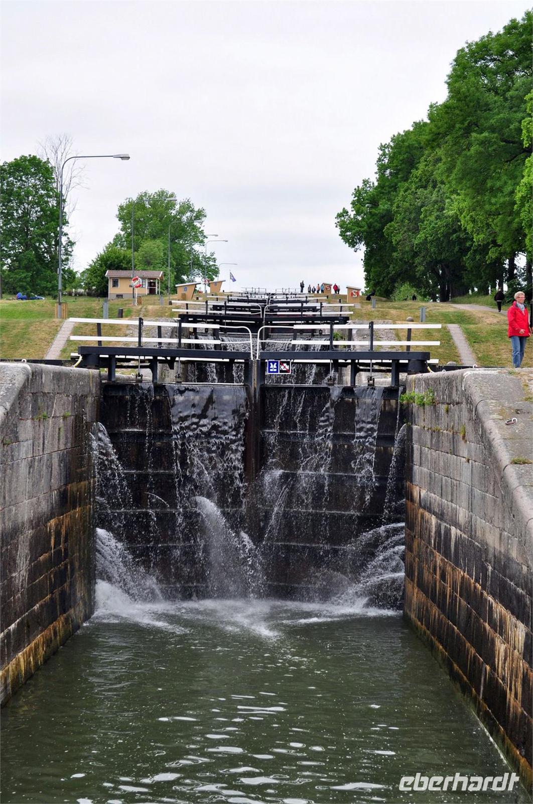 Für die Technik-Interessierten folgt ein Zwischenstop an der Carl-Johann Schleuse bei Berg am Götakanal. Die 7-Kammern-Schleuse fasziniert alle, erst recht, da wir sie durch ein Segelboot in Aktion erleben dürfen.