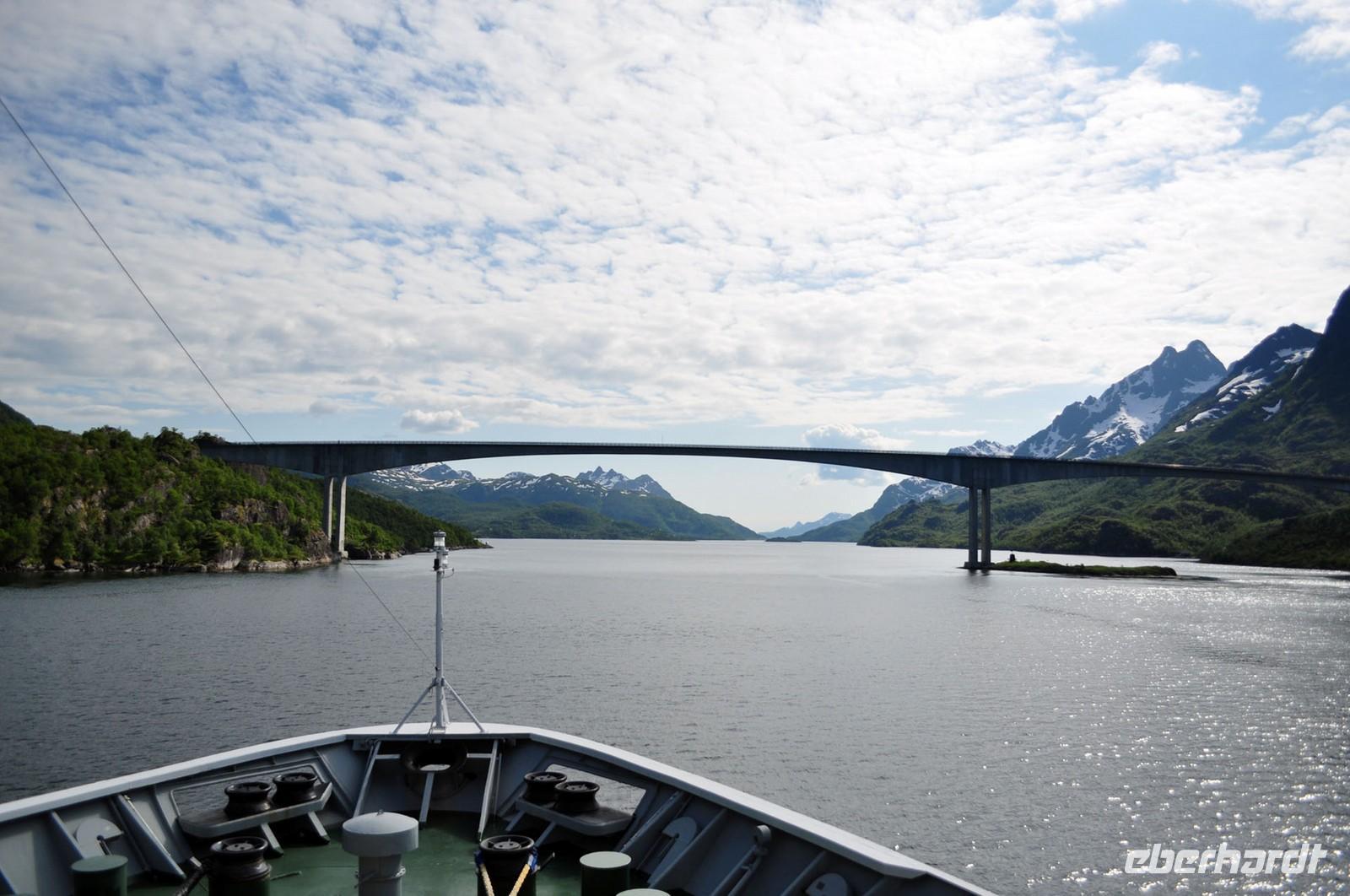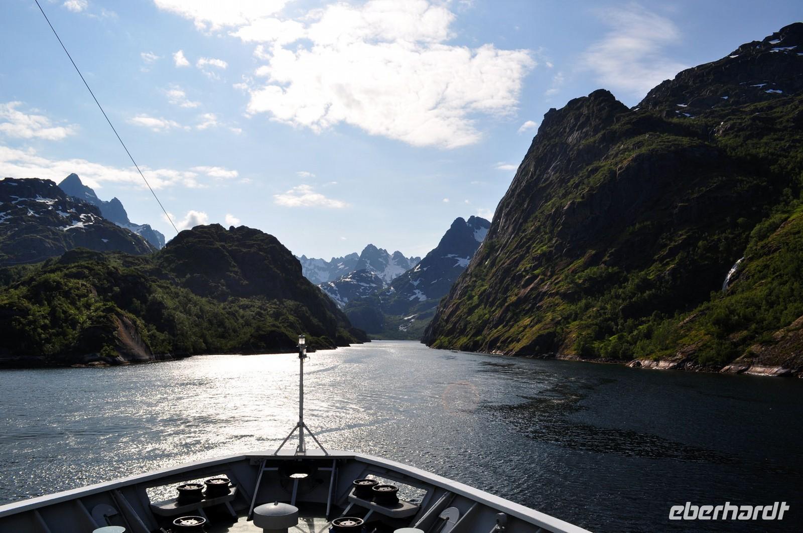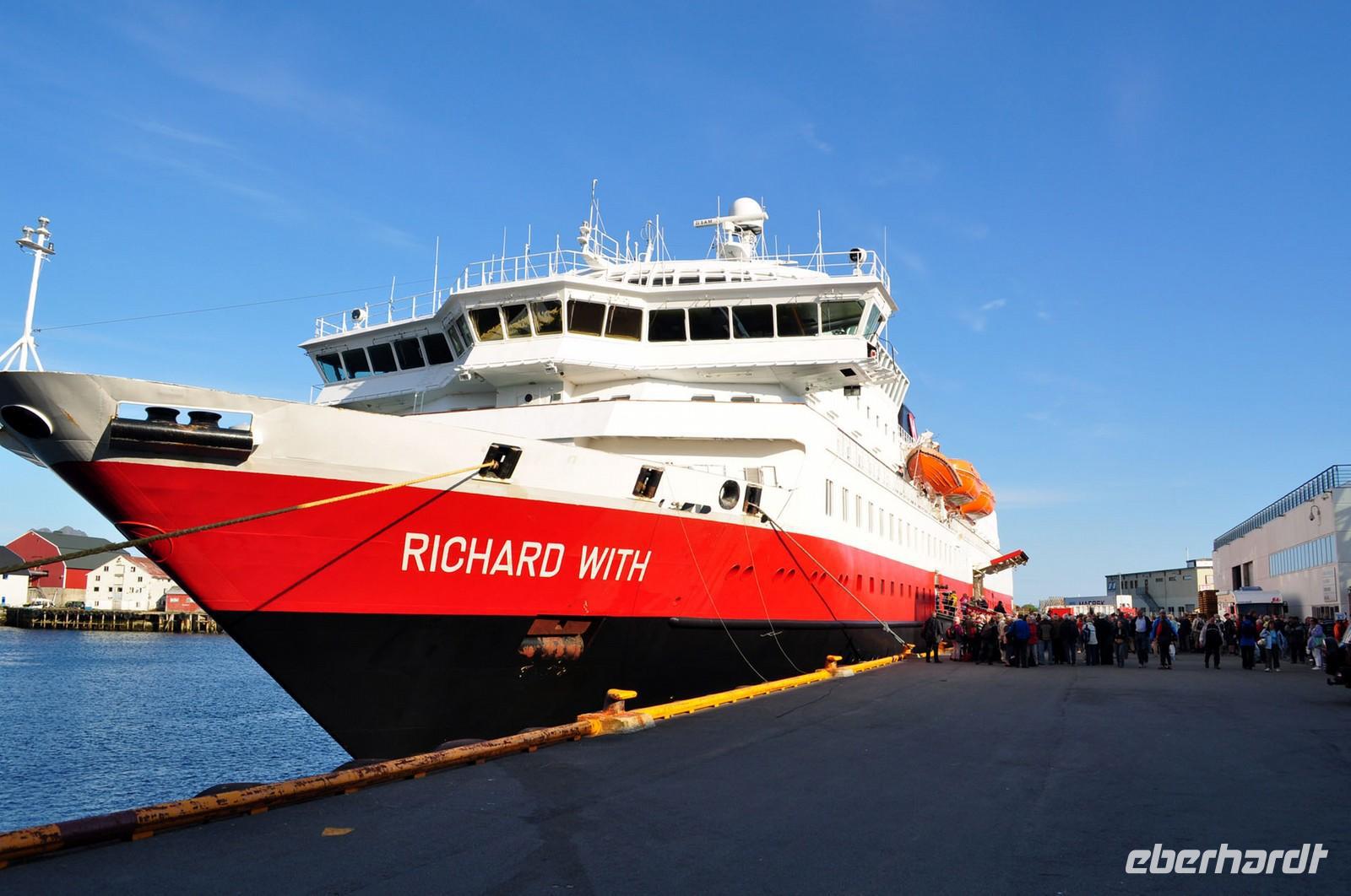 Auf unserem Weg über die Vesterålen erreichen wir Stokmarkenes. Die Gruppe geht an Bord der berühmten Hurtigruten zur Fahrt durch einen der schönsten Fahrtabschnitte der Postschiffe. Auf dem Weg nach Svolvær, dem inoffiziellen Hauptort der Lofoten, besuchen wir mit der MS Richard With den Trollfjord. Das Fotomotiv was auf keinem Hurtigrutenprospekt fehlen darf.
