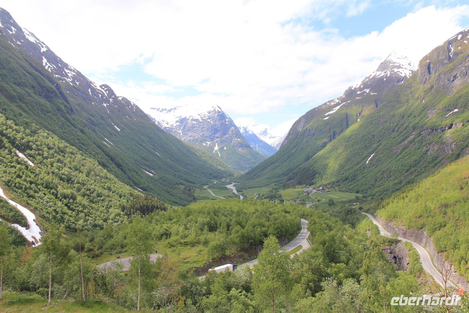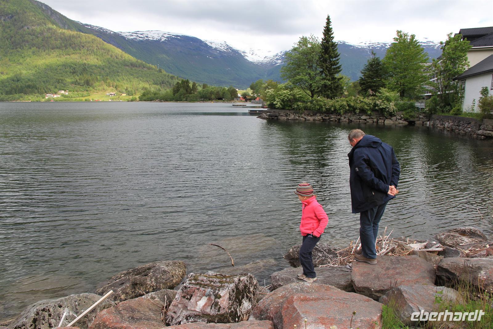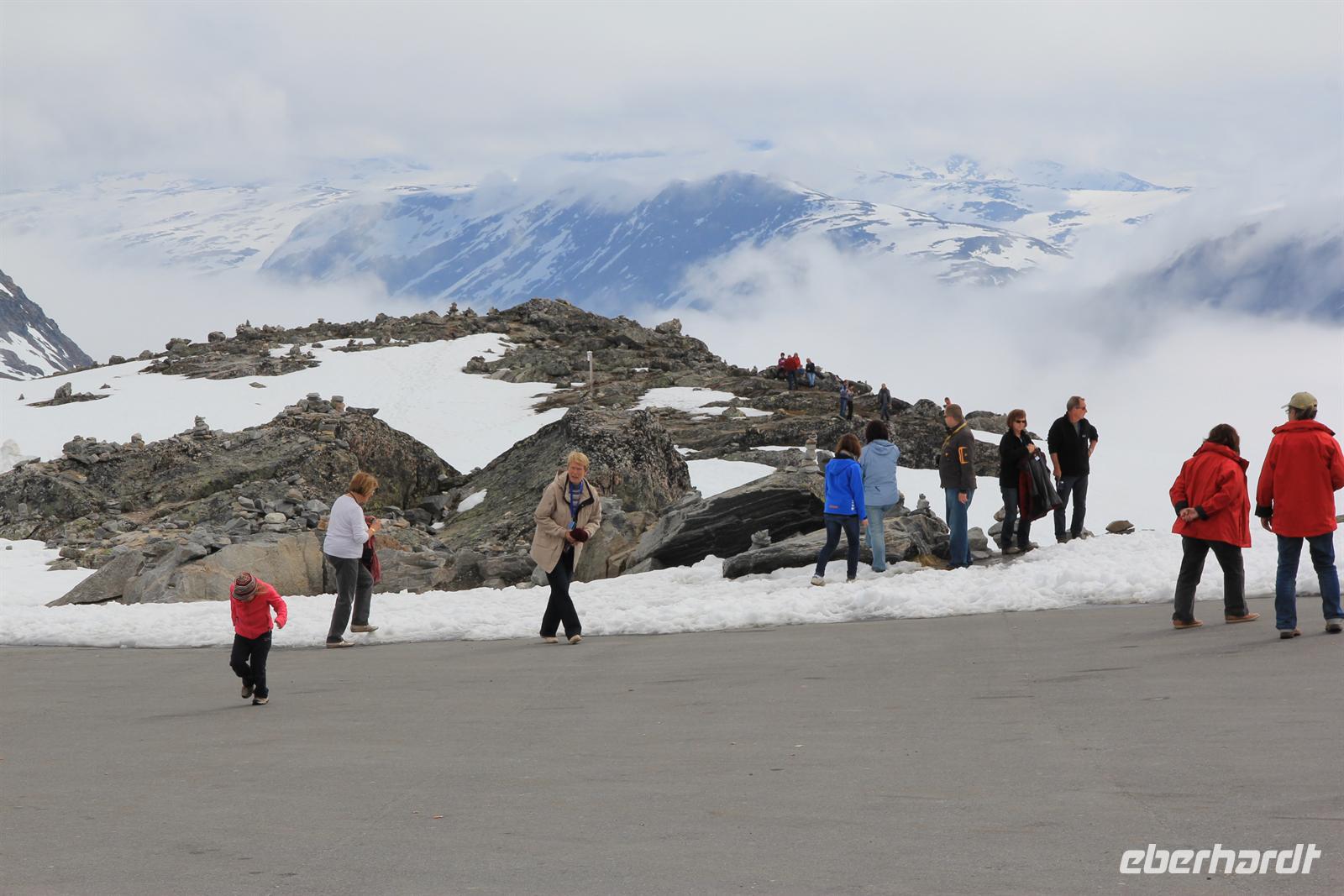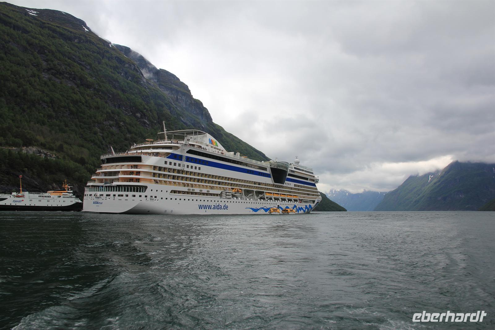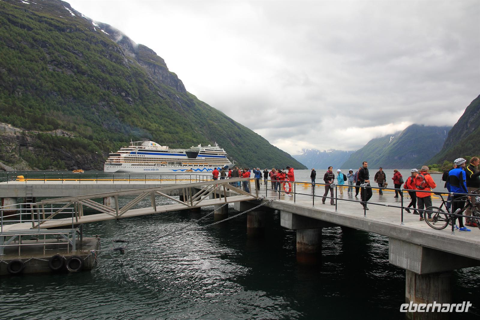 Hellesylt, Dalsnibba und Geirangerfjord, dies sollten die Hauptsehenswürdigkeiten auf unserem heutigen Eberhardt-Tagesausflug in Norwegen sein. Schon die Einfahrt in den gewaltigen Fjord raubte uns den Atem und die Frühaufsteher kamen an Deck wahrlich auf Ihre Kosten. Schon zeitig am Morgen bestiegen wir die Tenderboote, um in dem kleinen Ort Hellesylt an Land zu gehen. Sofort merkte man die veränderte, klare Luft und das tat uns Stadtmenschen unheimlich gut. Wir wurden herzlich von Busfahrer Peter und der deutschen Reiseleiterin Bärbel begrüßt, bevor wir auch schon eintauchten in die wunderschöne und einzigartige Landschaft der Fjordwelt und des Gebirges. Sprudelnde Wasserfälle, schneebedeckte Gipfel, glitzernde Gletscherseen, einsame Holzhütten und verschlafene Dörfchen machten den Charme der Region aus. Dabei kamen die schönsten Fotomotive vor die Linse. Aber nicht nur romantisch, sondern auch lustig ging es zu. Reiseleiterin Bärbel verzauberte uns mir Ihrem sächsischen Dialekt und machte aus Bergen-„Bersche“, aus Leute-„Leude“ und zeischte uns das norwegische Leben mit all seinen Vor- und Nachteilen auf. In einem kleinen Landhaus aßen wir in Stryn leckere Fischsuppe und selbstgebackenen Kuchen zu Mittag, bevor es Richtung Dalsnibba ging. Die Auffahrt gestaltete sich als äußerst spannend, denn plötzlich fanden wir uns inmitten von Schneemaßen wieder und waren von Wolken umgeben bis wir auf über 1200m landeten. Doch der Höhepunkt war wohl der wunderschöne Blick auf den romantisch anmutenden Geirangerfjord. Ein gelungener Tag.