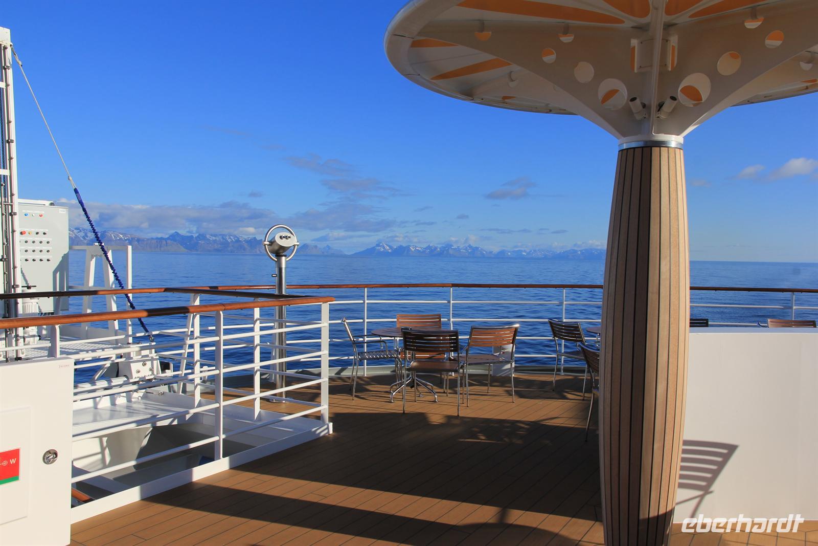 Bis nach Island hatten wir über 1000km zu fahren, daher genossen wir diese beiden Tage auf See. Zahlreiche Vorträge, Shows und Kurse boten Unterhaltung pur. Aber es blieb natürlich auch Zeit zum Entspannen bei ruhiger See und zur Walbeobachtung. Bei der nautischen Fragestunde stand unser sympathischer Kapitän für Fragen rund um die Seefahrt und Schiff bereit.